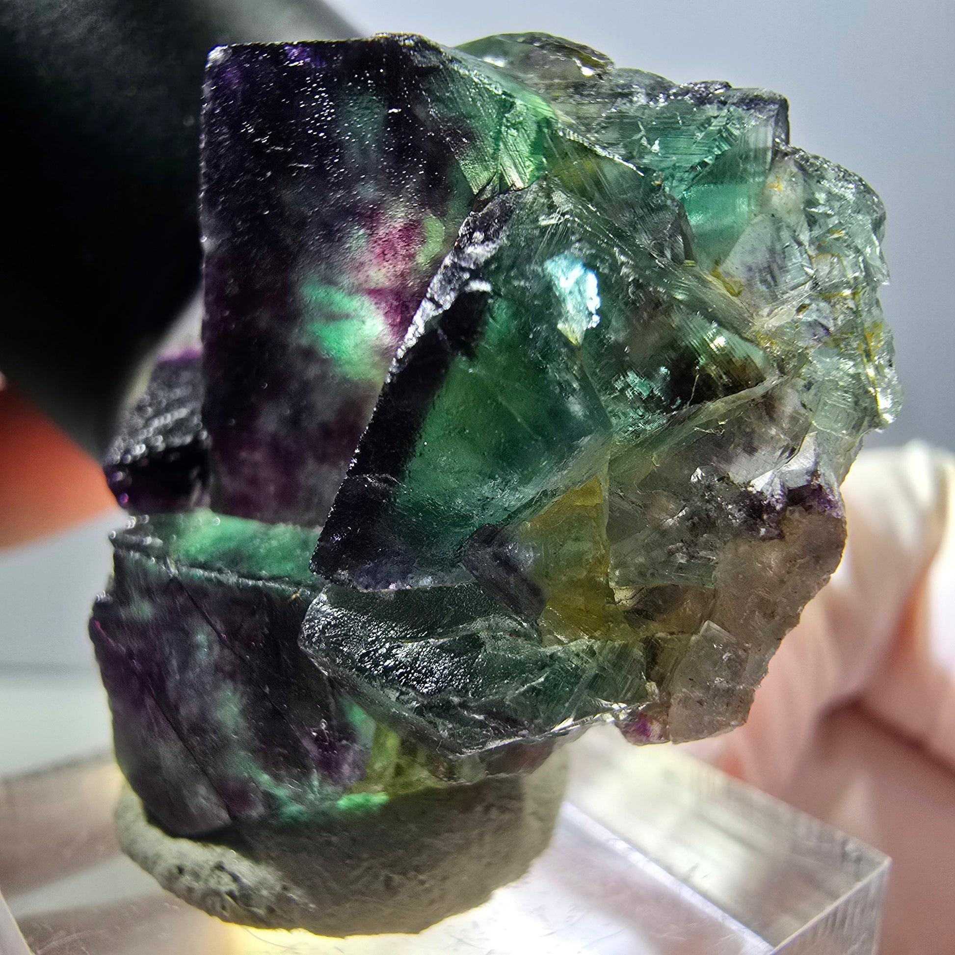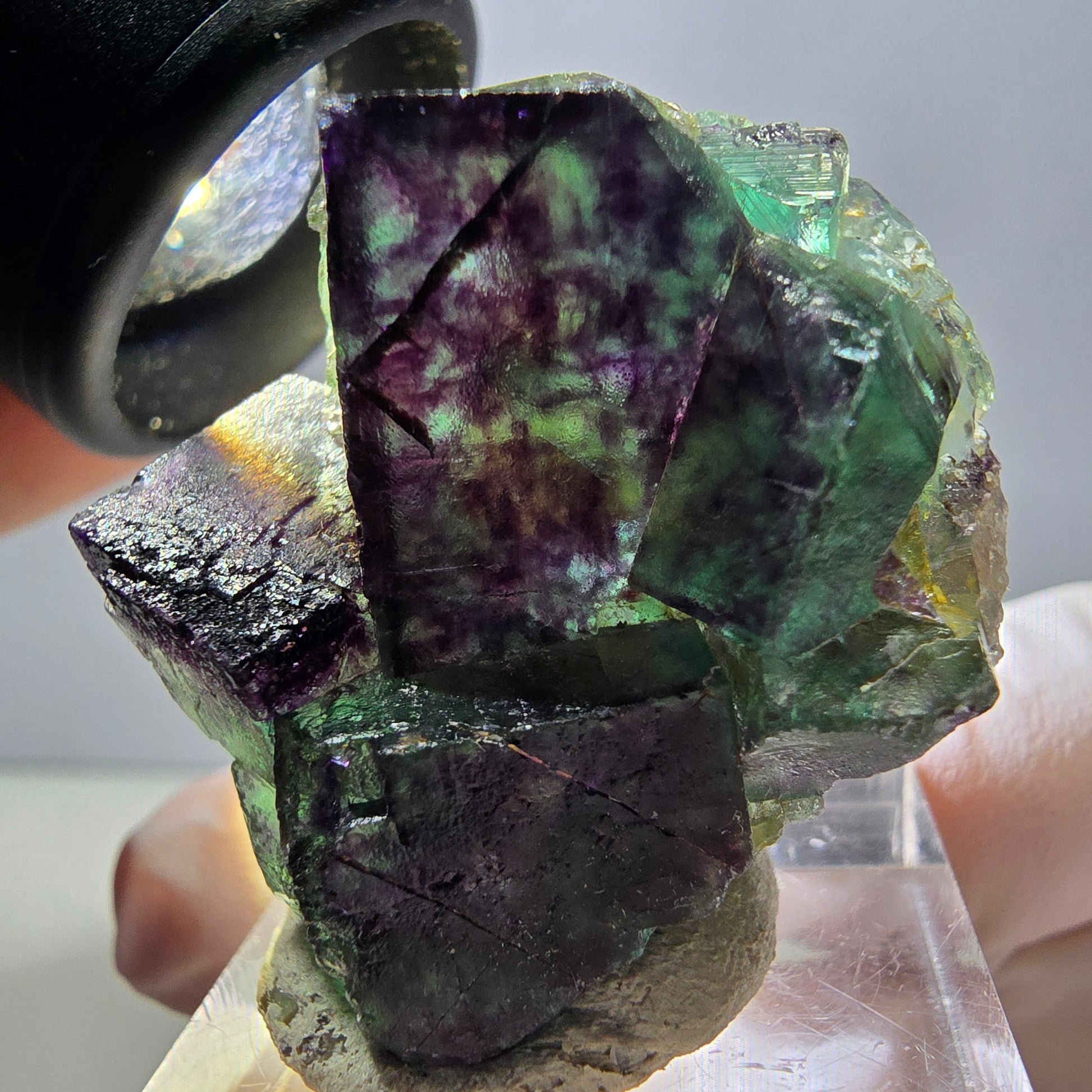 Découvrez notre rare spécimen cubique de fluorite transparente vert-violet, captivant par ses magnifiques cristaux cubiques et ses impressionnants fantômes. Cette exquise formation minérale présente une combinaison saisissante de deux couleurs, conférant à chaque pièce une touche unique. Idéal pour les collectionneurs et les minéralogistes.