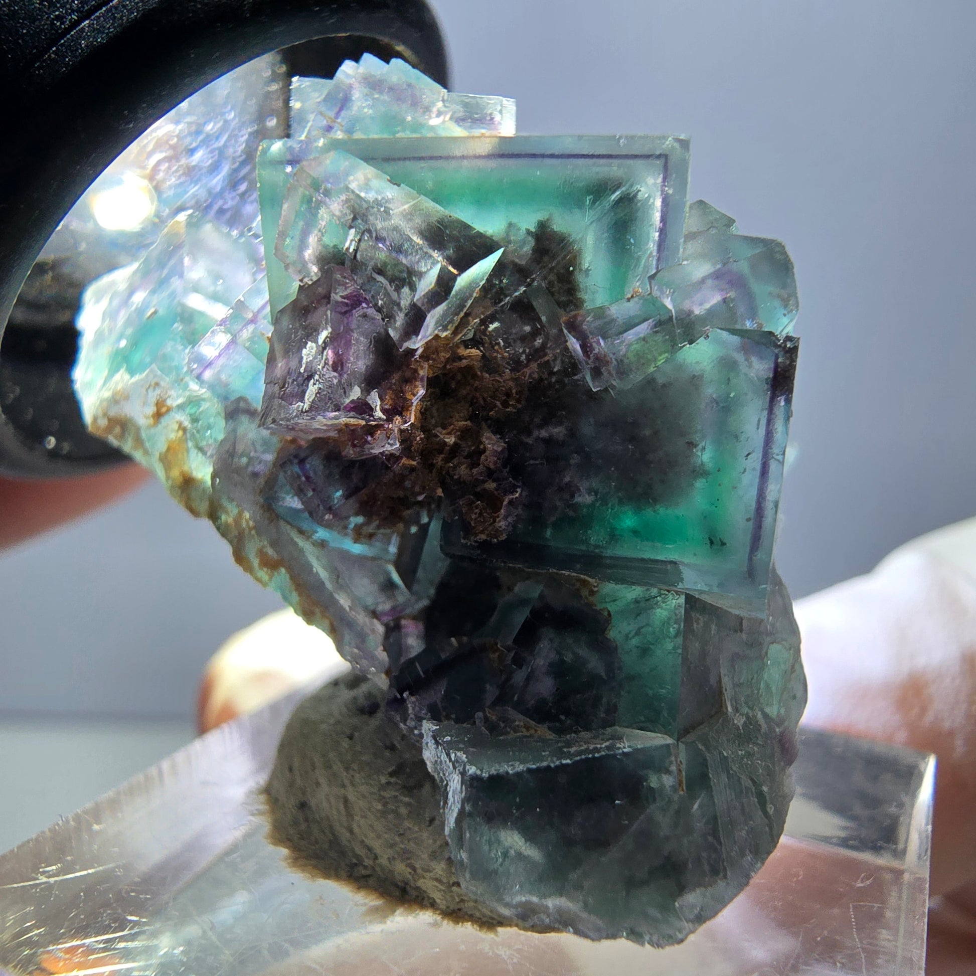 - Spécimen rare de cube de fluorite transparent vert violet