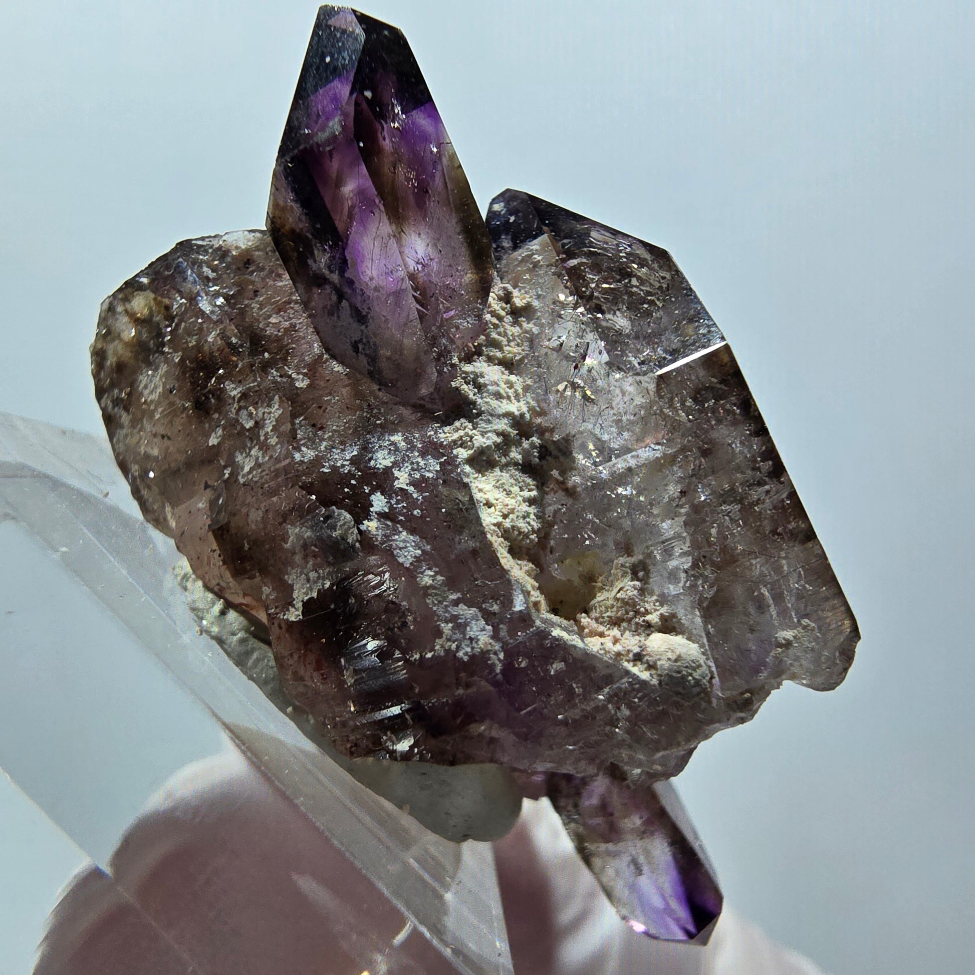 Rare améthyste fantôme squelettique biterminée en forme de sceptre de Namibie – Un cristal de collection fascinant, doté d'une formation cristalline biterminée unique en forme de sceptre et d'une surface squelettique. Ses pointes transparentes révèlent de magnifiques inclusions fantômes violettes et brunes, ce qui rend cette découverte véritablement exceptionnelle.