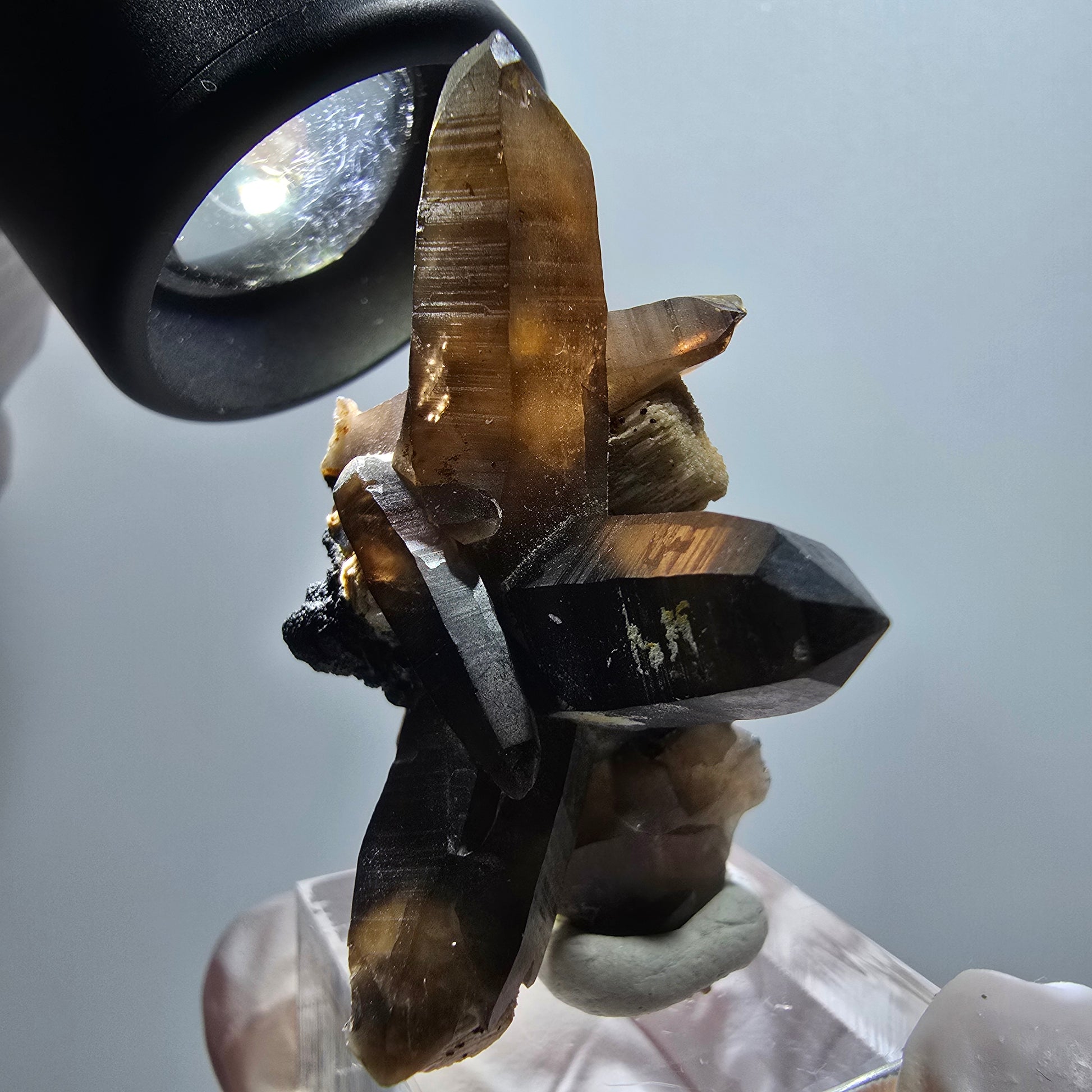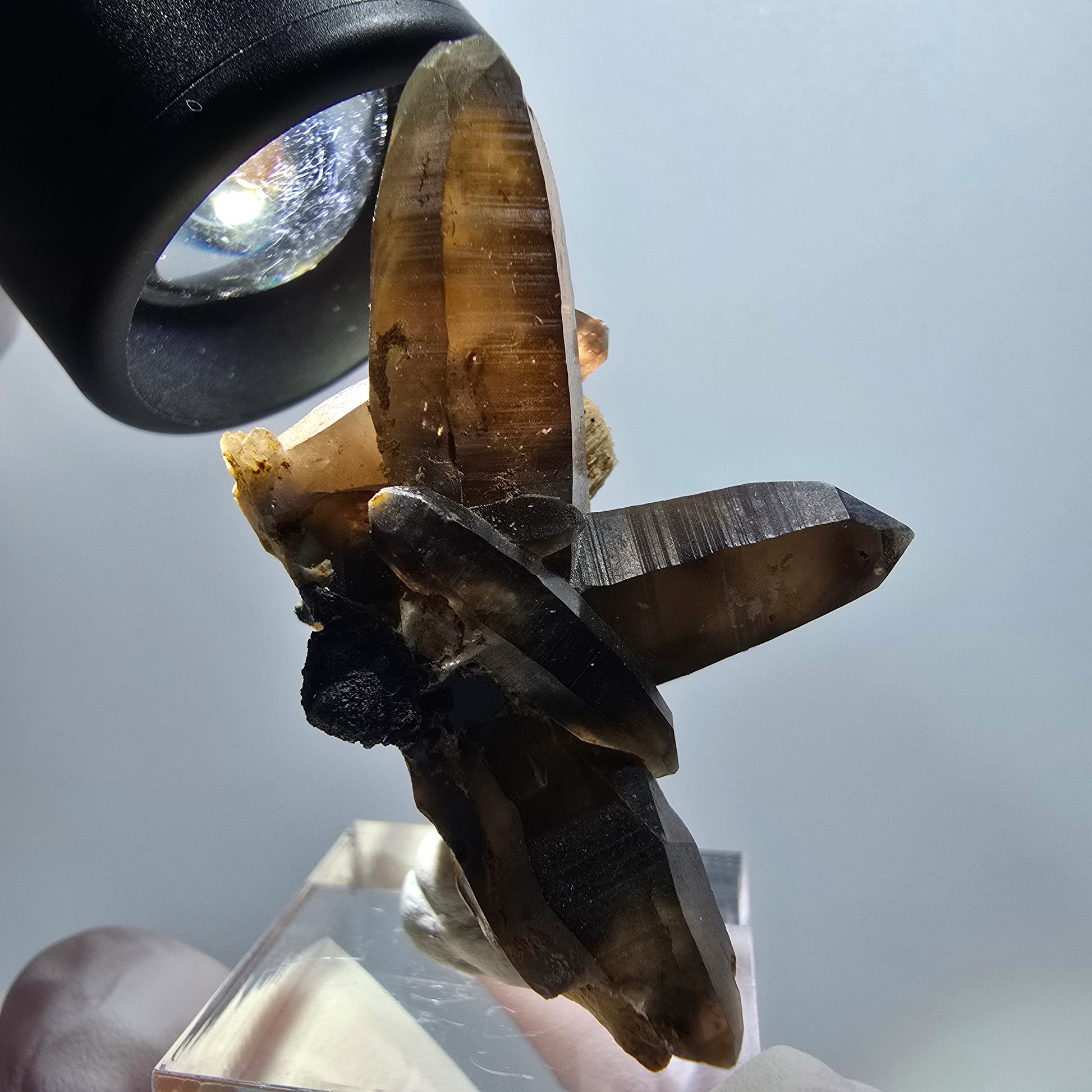 Quartz fumé squelettique fantôme avec orthoclase – un spécimen minéral rare et exceptionnel de Namibie. Cette pièce fascinante présente des pointes de cristal de quartz fumé squelettique, brunes et transparentes, ornées de magnifiques inclusions fantômes internes, reposant sur une matrice d'orthose blanc-beige parsemée de cristaux de tourmaline schorl noirs et brillants. Un véritable joyau pour tout collectionneur, car les cristaux namibiens de la région d'Erongo comptent parmi les plus beaux et les plus primés au monde.