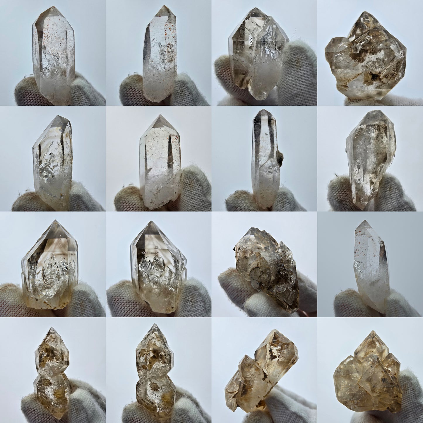 Entdecken Sie dieses wunderschöne Lot mit 12 klaren, braun-weiß transparenten Rauchquarz Kristallspitzen aus Goboboseb, Namibia. Diese einzigartigen Kristalle sind nicht nur ästhetisch ansprechend, sondern auch von hoher Qualität. Einige der Kristalle weisen eine Zepterform (Zepterquarz) auf, während andere als Doppelender-Kristalle (Doppelender Quarz, DT Quarz) oder mit schönen fensterförmigen Einschlüsse (Fensterquarz) klassifiziert werden können.