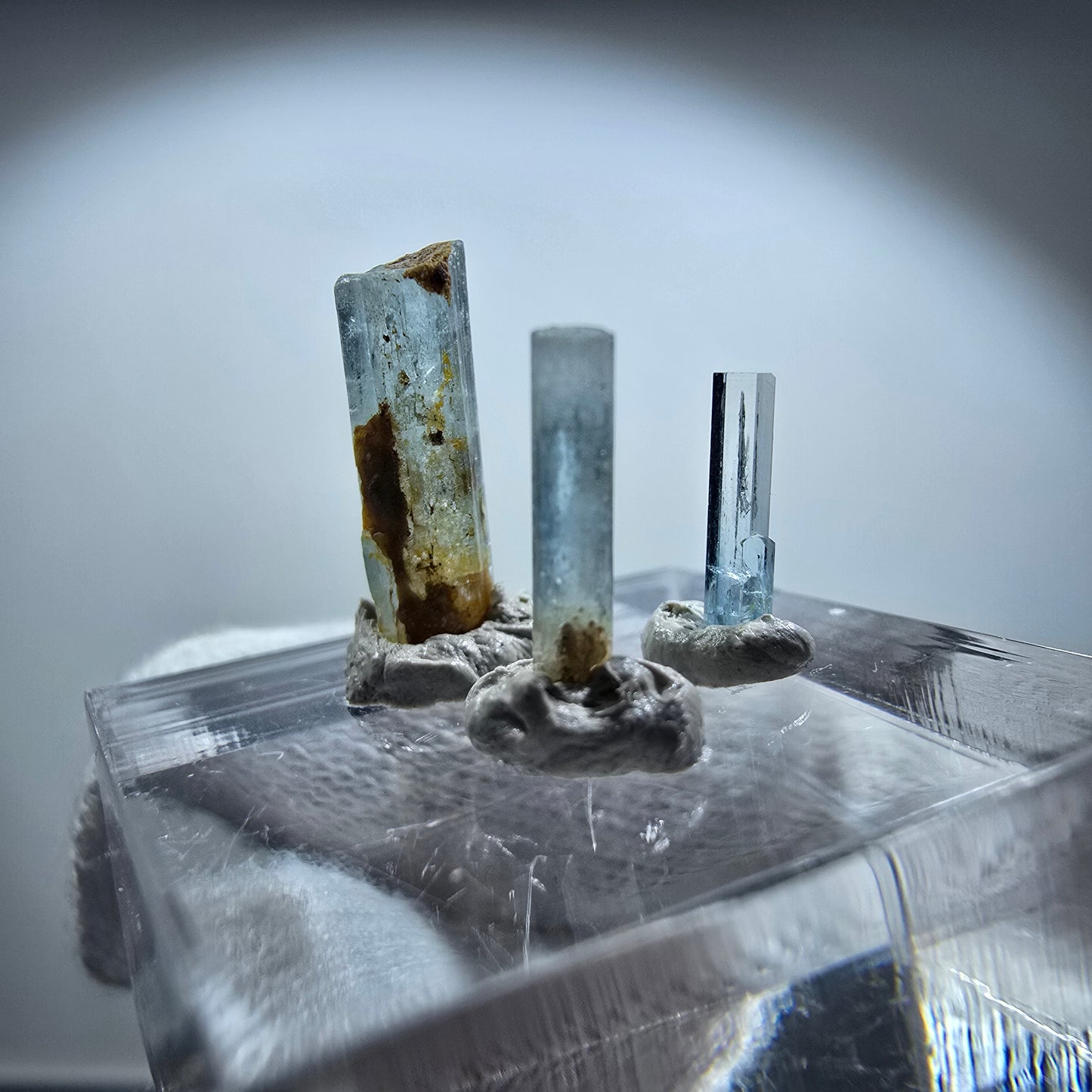 Entdecken Sie unser exklusives Set von drei seltenen Aquamarin Kristallen mit einer bezaubernden hellblauen Farbe. Jeder Kristall zeichnet sich durch eine klare und transparente Ausstrahlung aus und kommt in einer eleganten länglichen Form. Diese einzigartigen Kristalle stammen aus dem berühmten Fundort Erongo in Namibia.