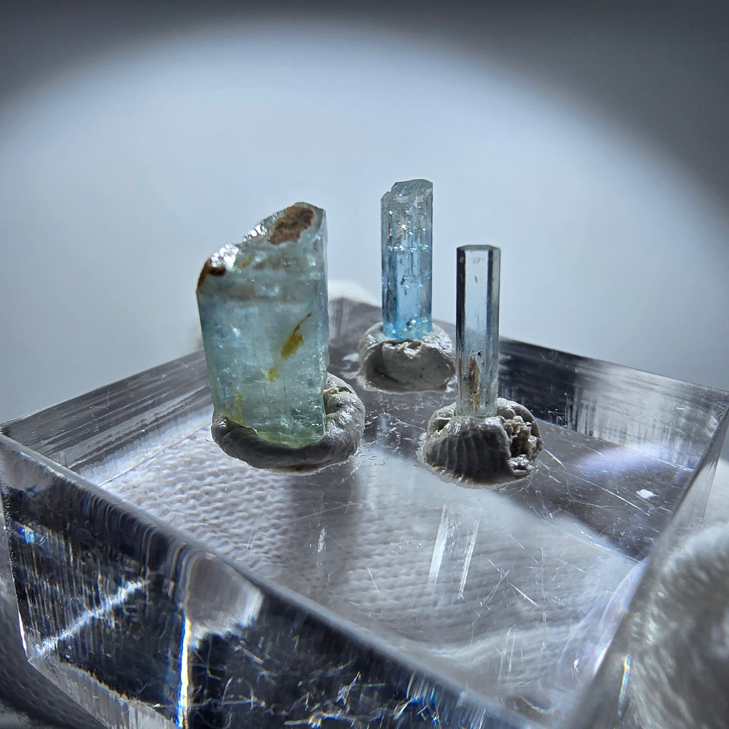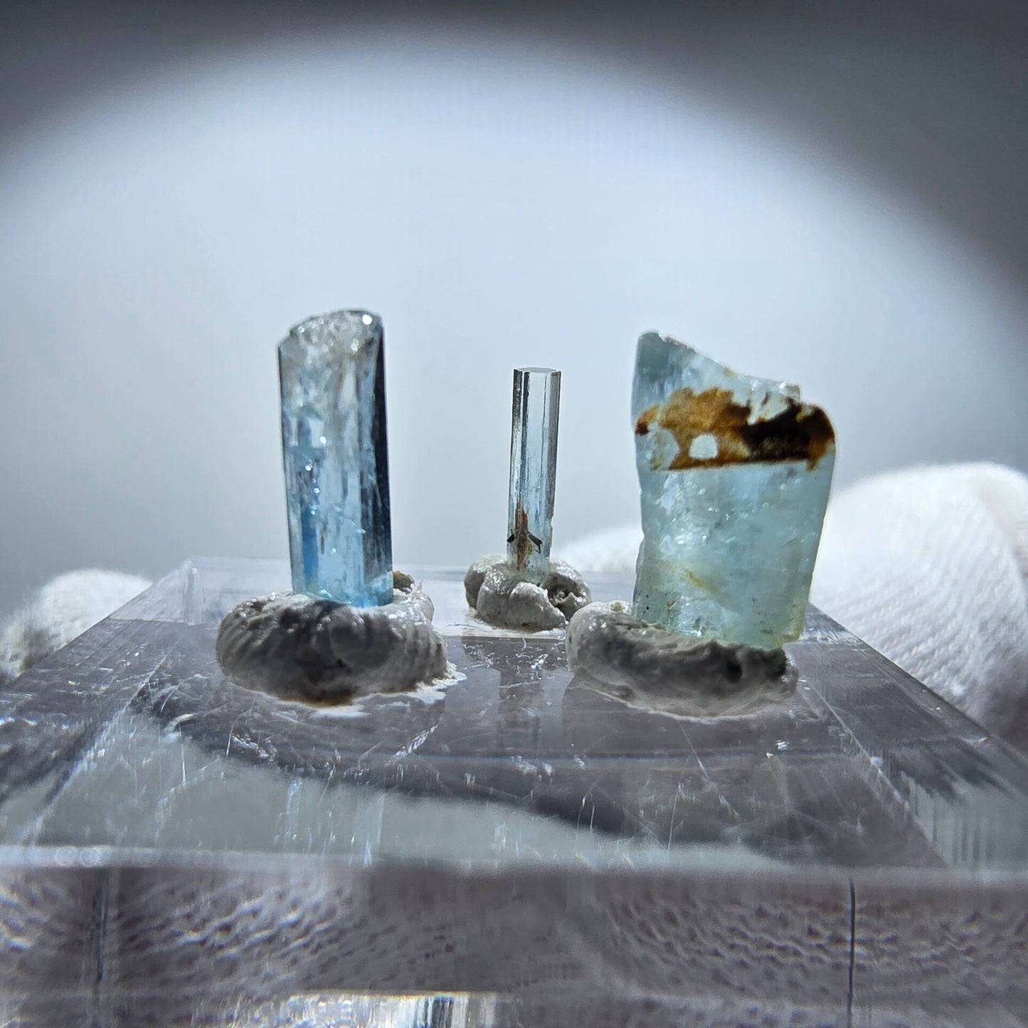 Die Aquamarin Kristalle messen zwischen 8 und 10 mm und wiegen insgesamt 0,65 g. Sie stammen aus der bekannten Region Erongo in Namibia, wo sie unter optimalen Bedingungen gewachsen sind.