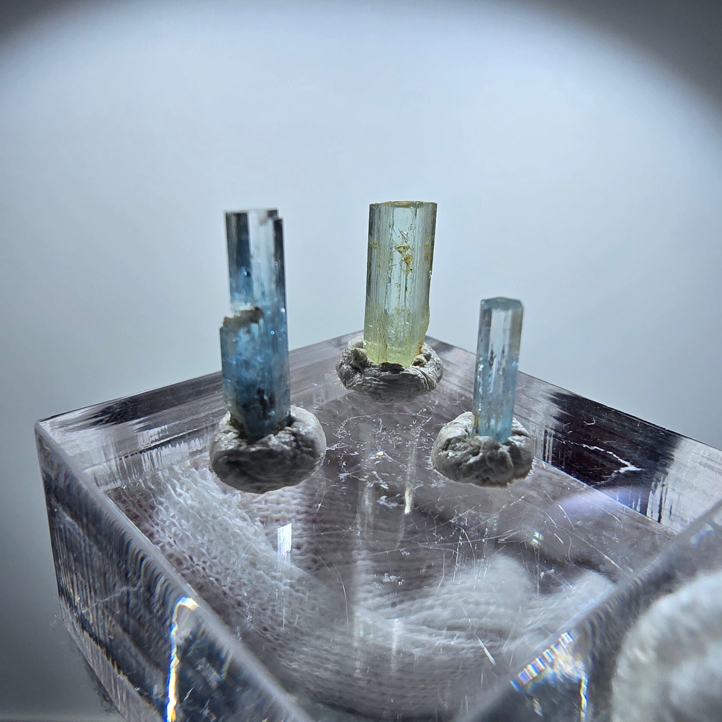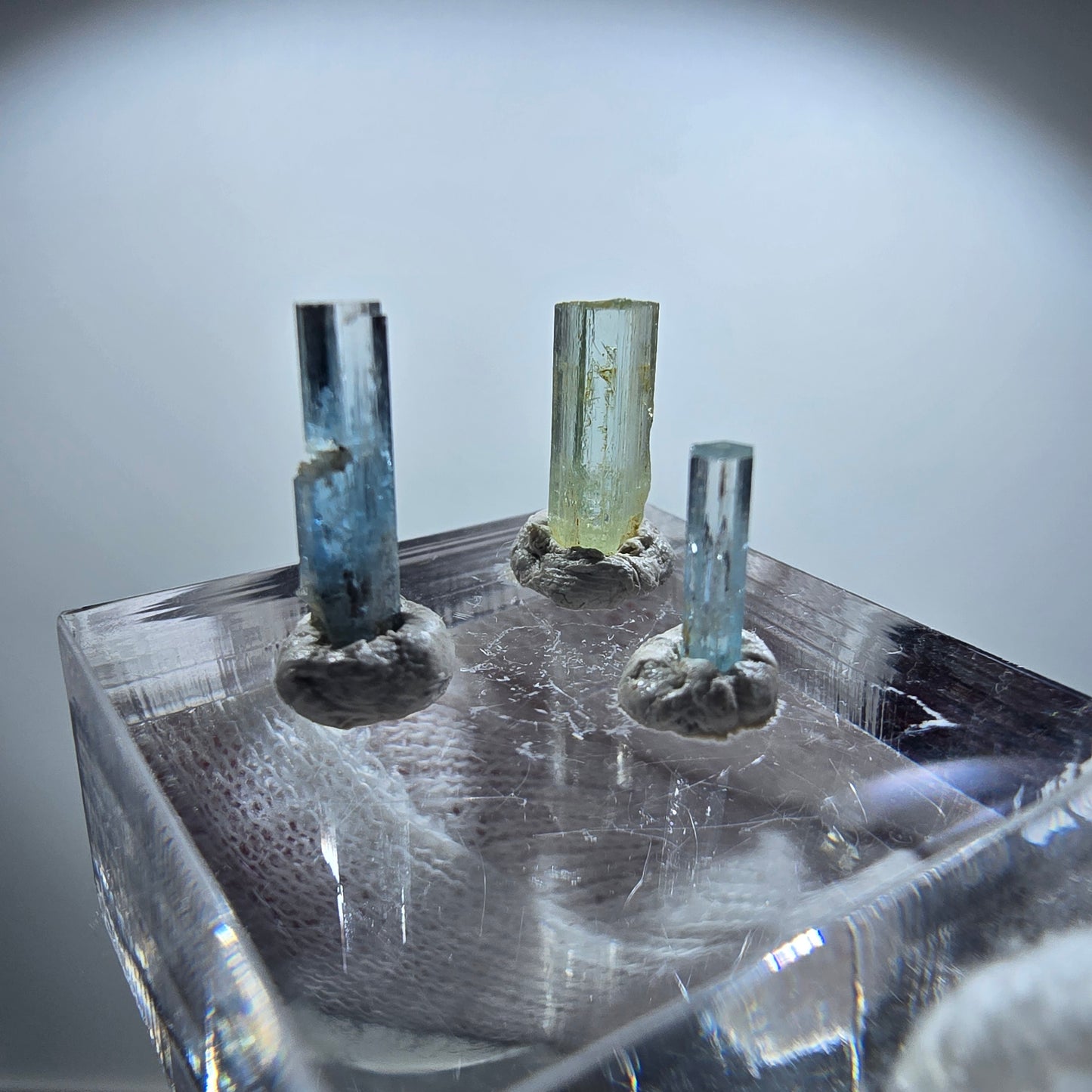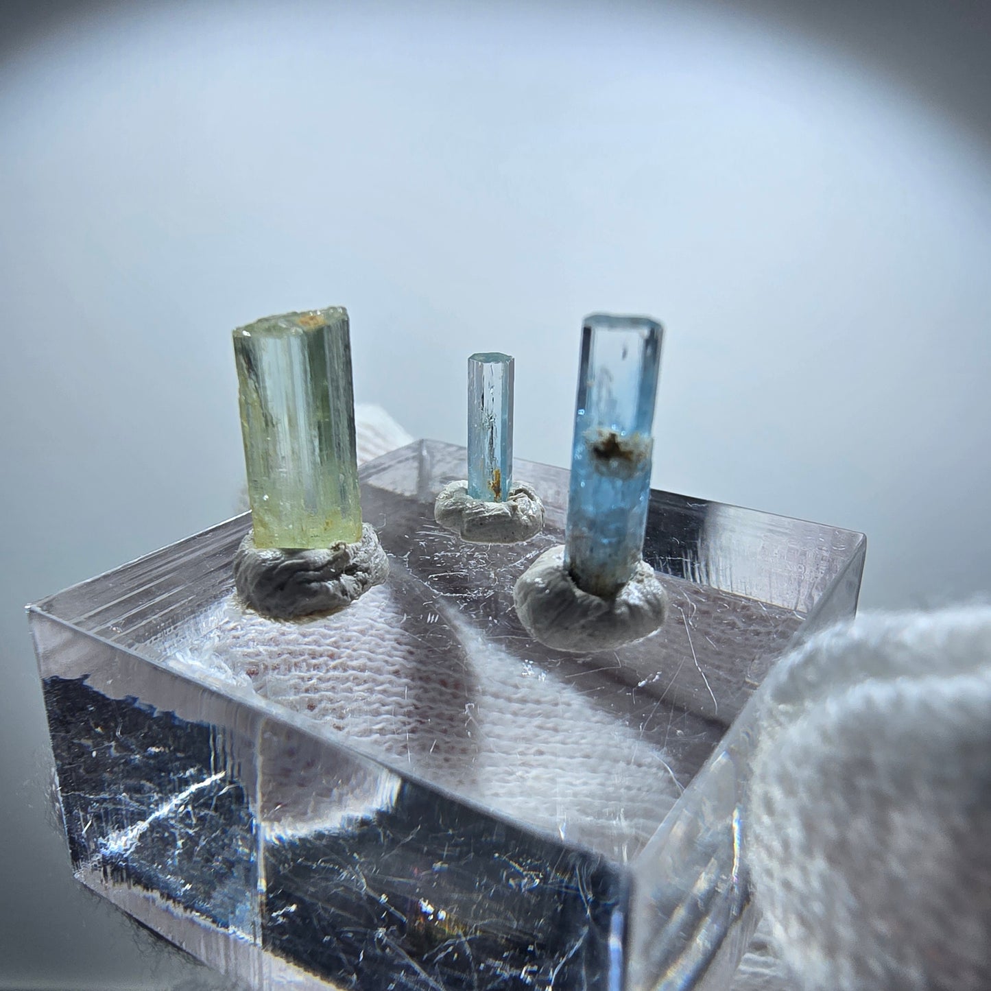 Entdecken Sie die Schönheit und Klarheit dieser seltenen Aquamarin Kristalle. Dieses Set bestehend aus drei sorgfältig ausgewählten, hellblauen, transparenten Kristallen begeistert durch ihre längliche Form und ihren einzigartigen Glanz. Jeder Kristall hat Maße zwischen 8-12 mm und ein Gesamtgewicht von 0,67 g. Die Kristalle stammen aus der einzigartigen Region Erongo in Namibia, bekannt für ihre hochwertigen Mineralien.