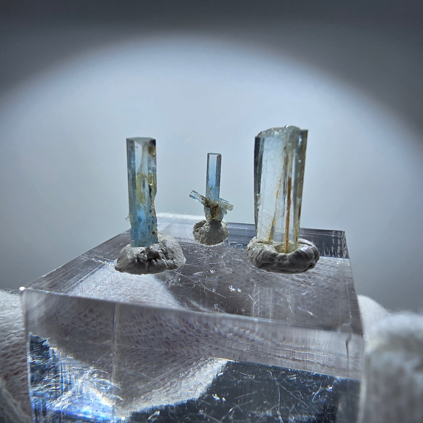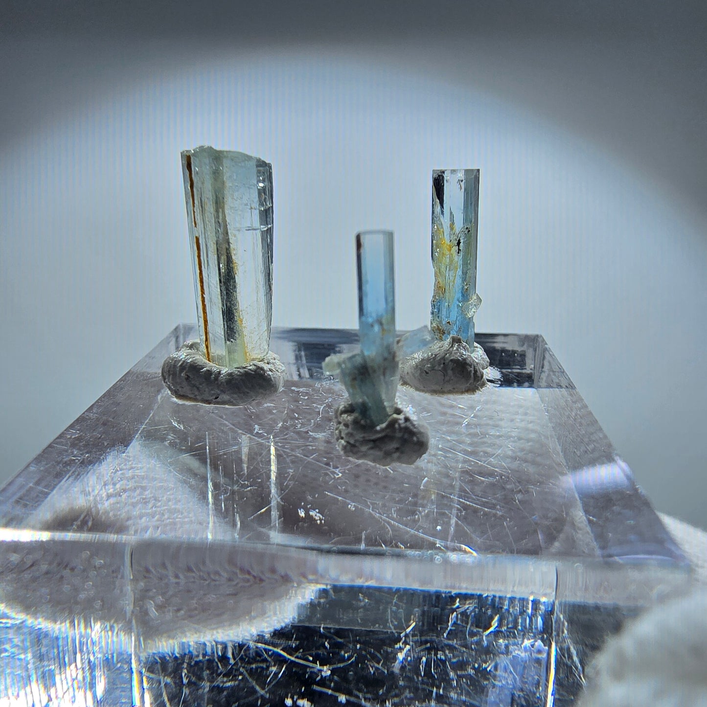Entdecken Sie dieses exklusive Set von drei seltenen, klaren hellblauen Aquamarin Kristallen. Jeder Kristall hat eine längliche Form und zeichnet sich durch seine transparente Klarheit aus. Diese einzigartigen Kristalle stammen aus der berühmten Region Erongo in Namibia und sind ein echter Blickfang für Sammler und Liebhaber von Mineralien.