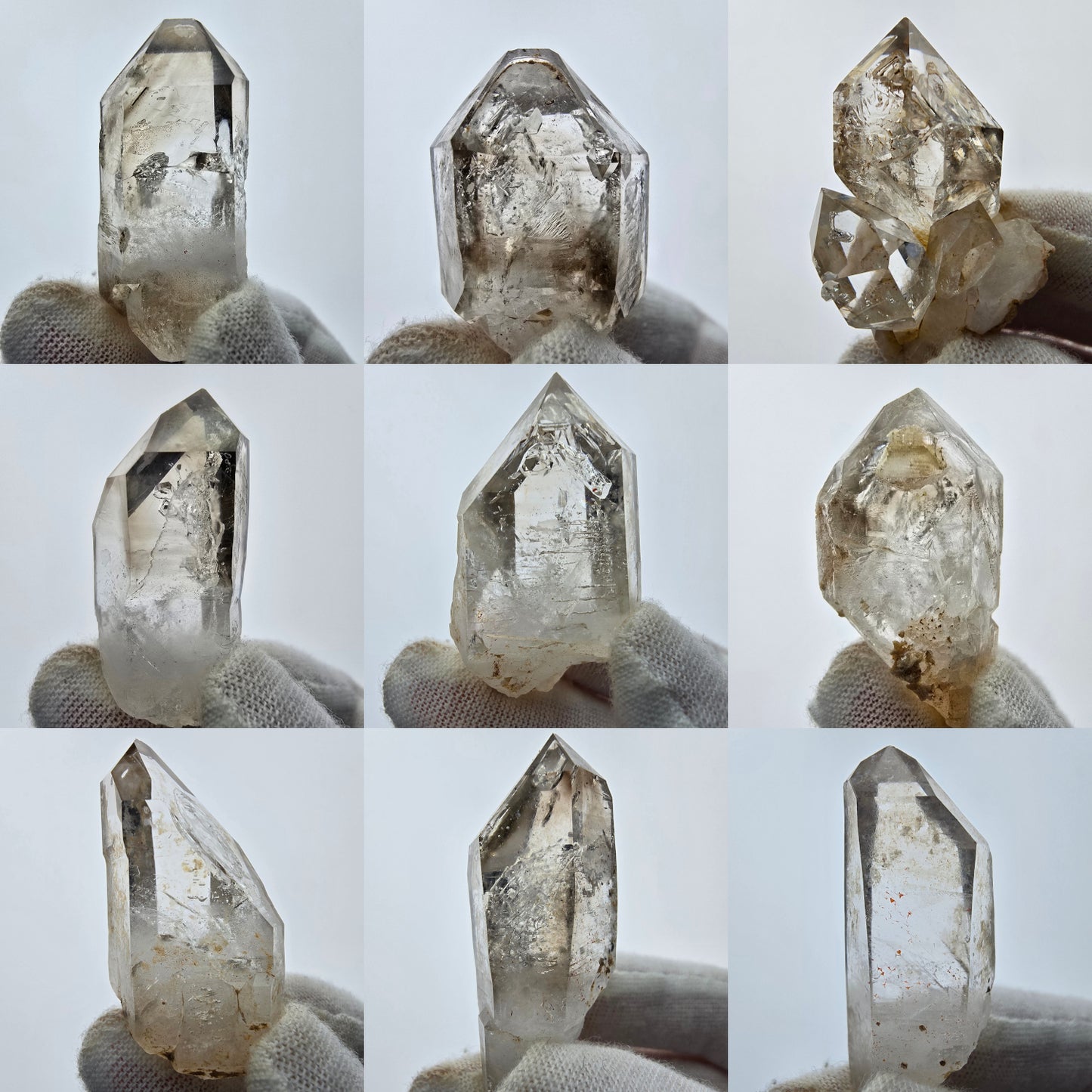 Entdecken Sie unser wunderschönes Lot mit 9 klaren, braun-weißen, transparenten Rauchquarz Kristallspitzen aus Goboboseb, Namibia. Diese einzigartigen Kristalle sind nicht nur ein echter Blickfang, sondern auch ein hervorragendes Sammlerstück für Mineralienliebhaber.