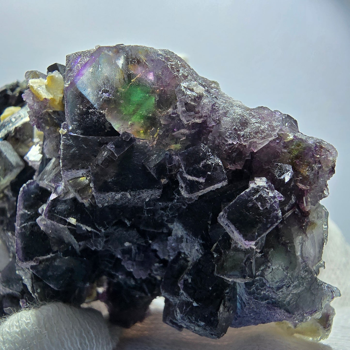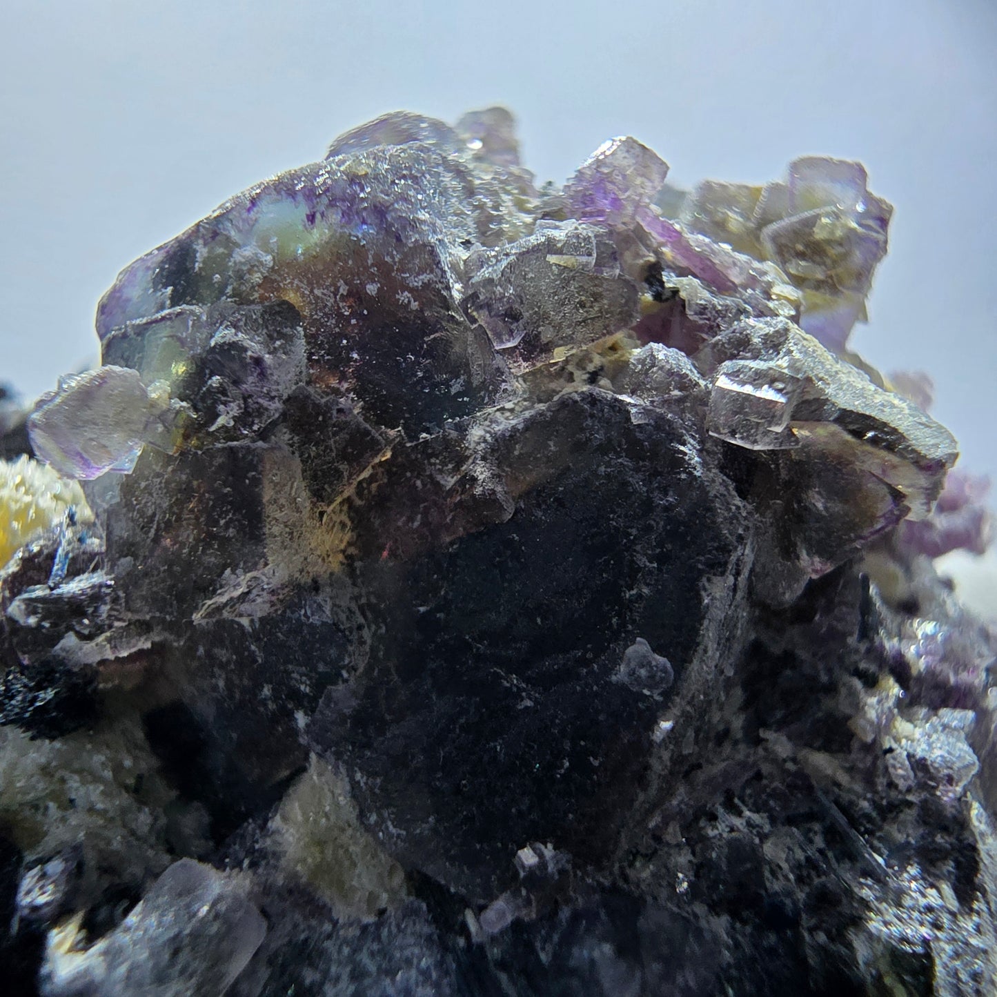 Entdecken Sie diese seltene Mineralienstufe, die mit außergewöhnlichen Eigenschaften begeistert. Die bunten Phantom Fluorit Würfel bestehen aus schönen grün, braun, lila und gelben Transparenten, aus denen klar erkennbare Phantome hervortreten. Diese Stufe zeigt nicht nur faszinierende Fluorit-Kristalle, sondern ist auch mit schwarzen Schörl Turmalin Kristallen und gelb metallisch glänzenden Muskovit Kristallen angereichert. Hinzu kommen einige Hyalit Kristalle, die unter UV-Licht in einem leuchtenden Neon-Gelb erstrahlen.