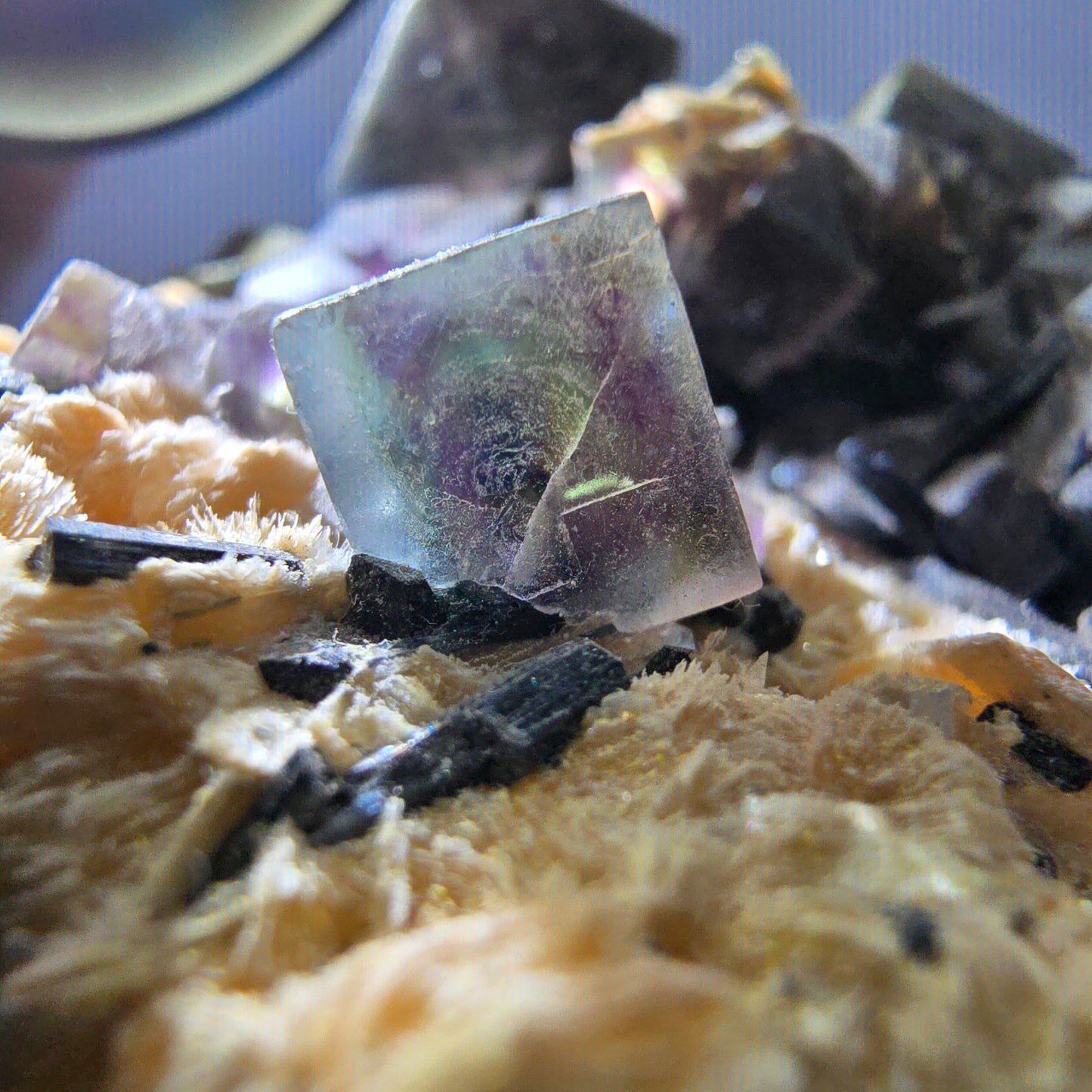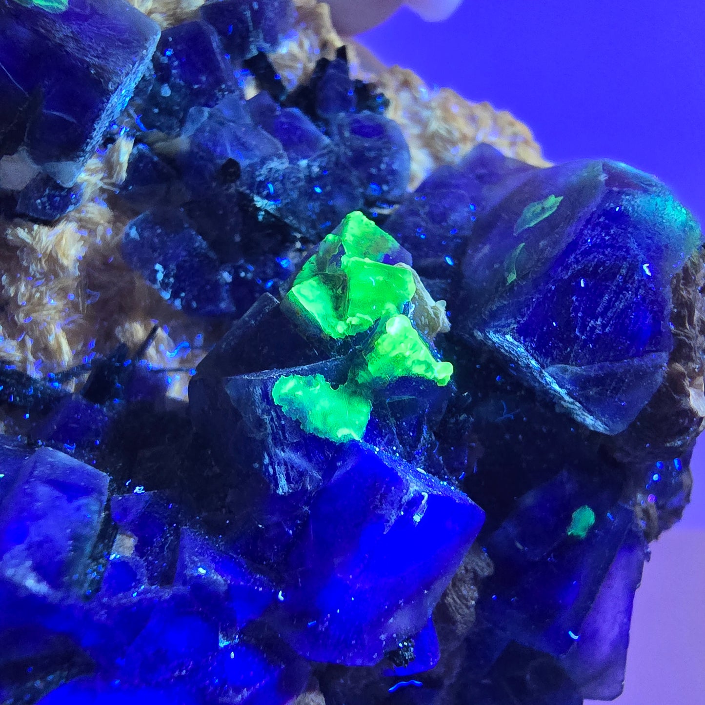 Entdecken Sie diese seltene Mineralienstufe, die mit spektakulären Farben und faszinierenden Kristallen begeistert. Die Stufe enthält grün, braun, lila und gelbe, transparente Phantom Fluorit Würfel, in denen auffällige Phantome sichtbar sind. Diese beeindruckenden Kristalle werden ergänzt durch schwarze Schörl Turmalin Kristalle, die eine kontrastreiche Ergänzung bieten, sowie gelb metallisch glänzende Muskovit Kristalle. Zusätzlich sind einige Hyalit Kristalle vorhanden, die unter UV Licht in einem leuchtenden Neongelb strahlen.