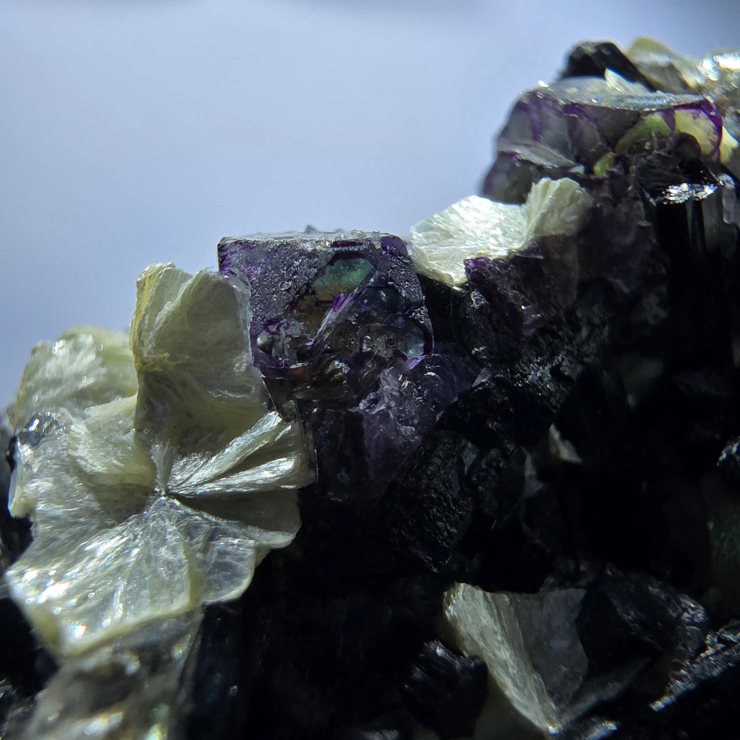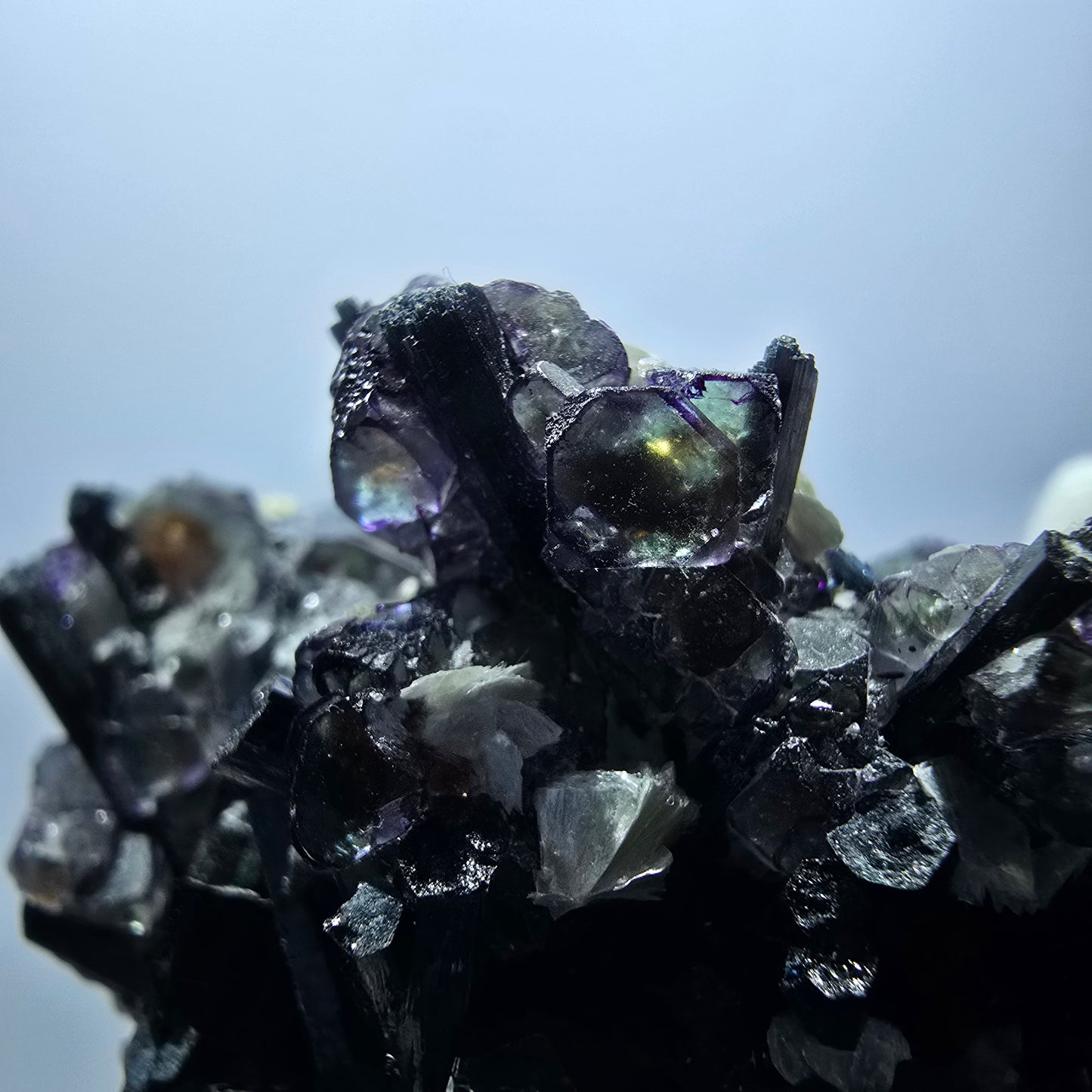 Zusätzlich zu den Fluorit-Kristallen sind schwarze Schörl Turmalin Kristalle vorhanden, die einen kontrastierenden Akzent setzen, sowie leuchtend gelbe, metallisch glänzende Muskovit Kristalle, die dem Gesamtbild Eleganz verleihen. Die grau-weiß transparenten Spitzen des Rauchquarz runden das beeindruckende Erscheinungsbild ab.