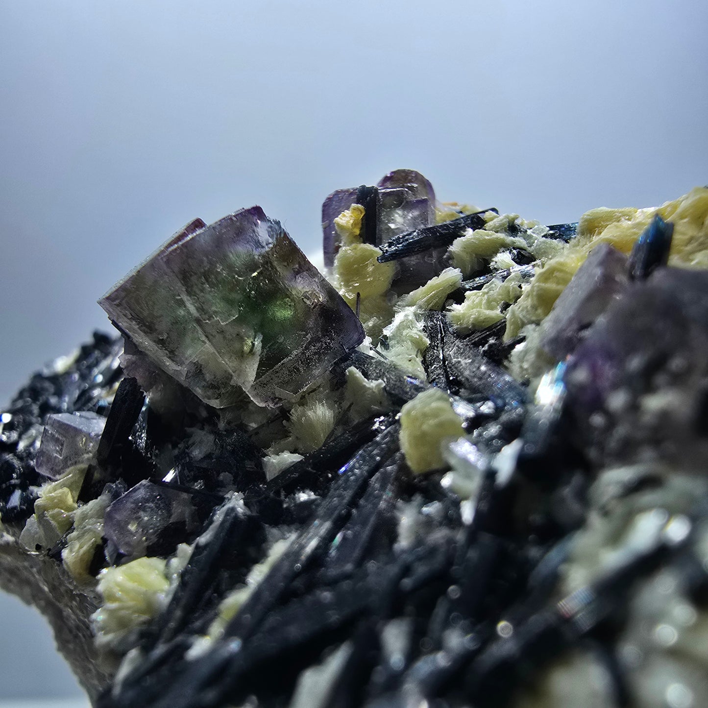 Entdecken Sie diese beeindruckende Mineralienstufe, die eine einzigartige Kombination aus buntem Phantom Fluorit, schwarzem Schörl Turmalin und glänzendem Muskovit präsentiert. Der warum die diese seltene Stufe so besonders ist, liegt in den faszinierenden Phantomen, die in den transparenten Fluorit-Würfeln sichtbar sind.