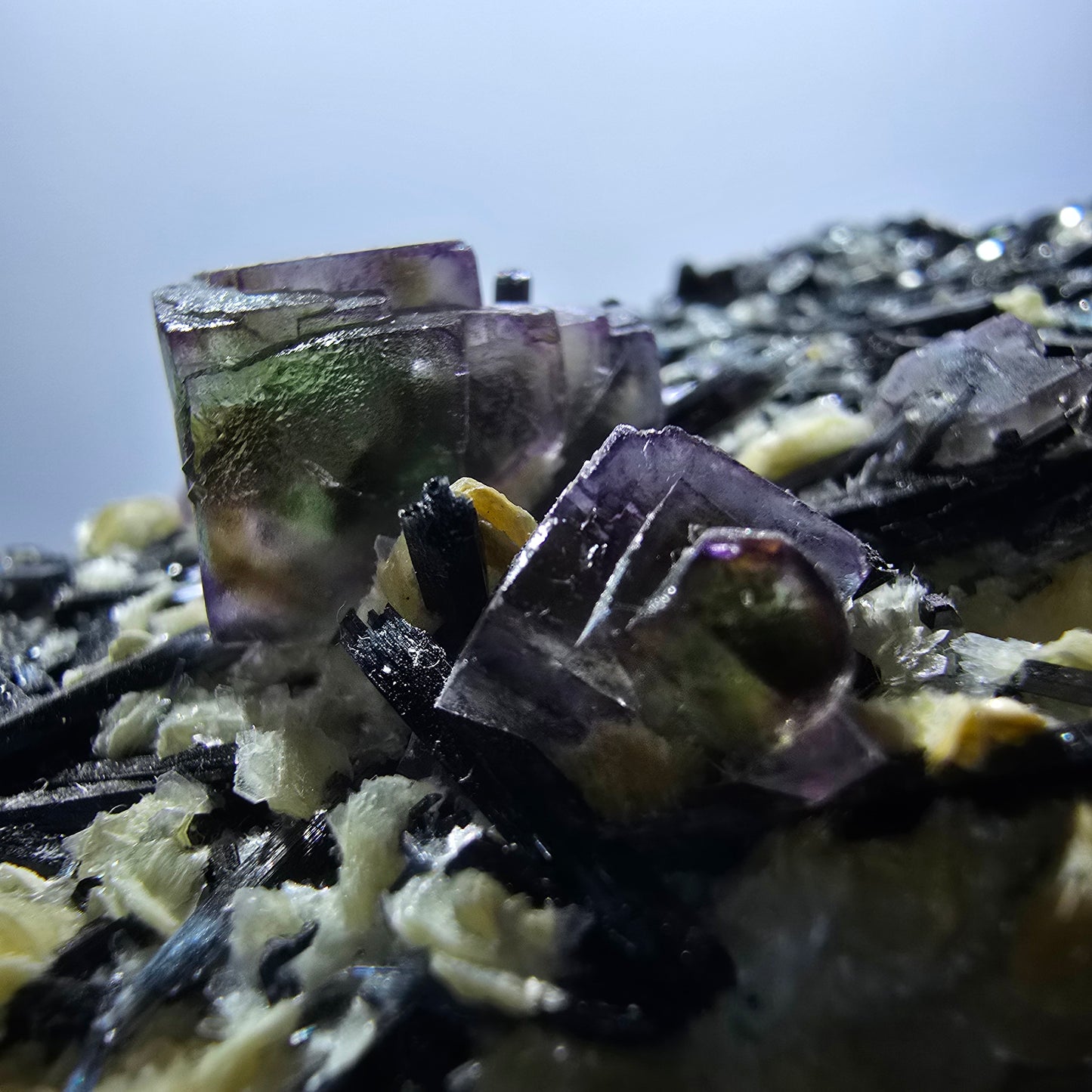 Die Fluoritkristalle zeigen ein wundervolles Farbspiel von grün über braun, in die lila und gelben Töne übergehen. Die Anwesenheit der schimmernden Muskovit-Kristalle und der charakteristischen schwarzen Schörl Turmaline geben der Stufe eine einzigartige Struktur und Ausstrahlung, die sich in jedem Licht wunderbar entfaltet.