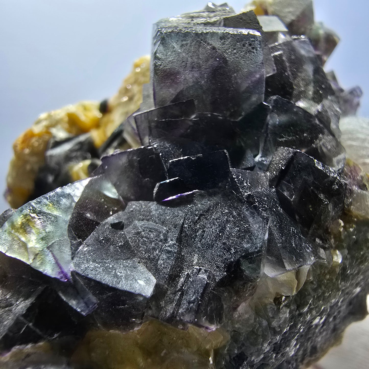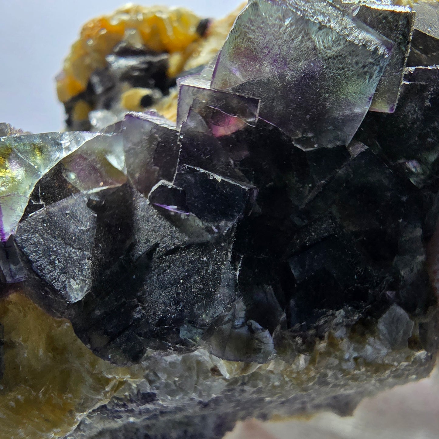 Wir freuen uns, Ihnen diese seltene Mineralienstufe mit beeindruckenden, bunten Phantom Fluorit Würfeln präsentieren zu können. Diese exquisite Stück zeigt faszinierende Kristalle in den Farben grün, braun, lila und gelb, die transparent und klar sind. Im Inneren der Würfel sind wunderschöne Phantome zu erkennen, die das mineralogische Herzstück dieses Stücks ausmachen.