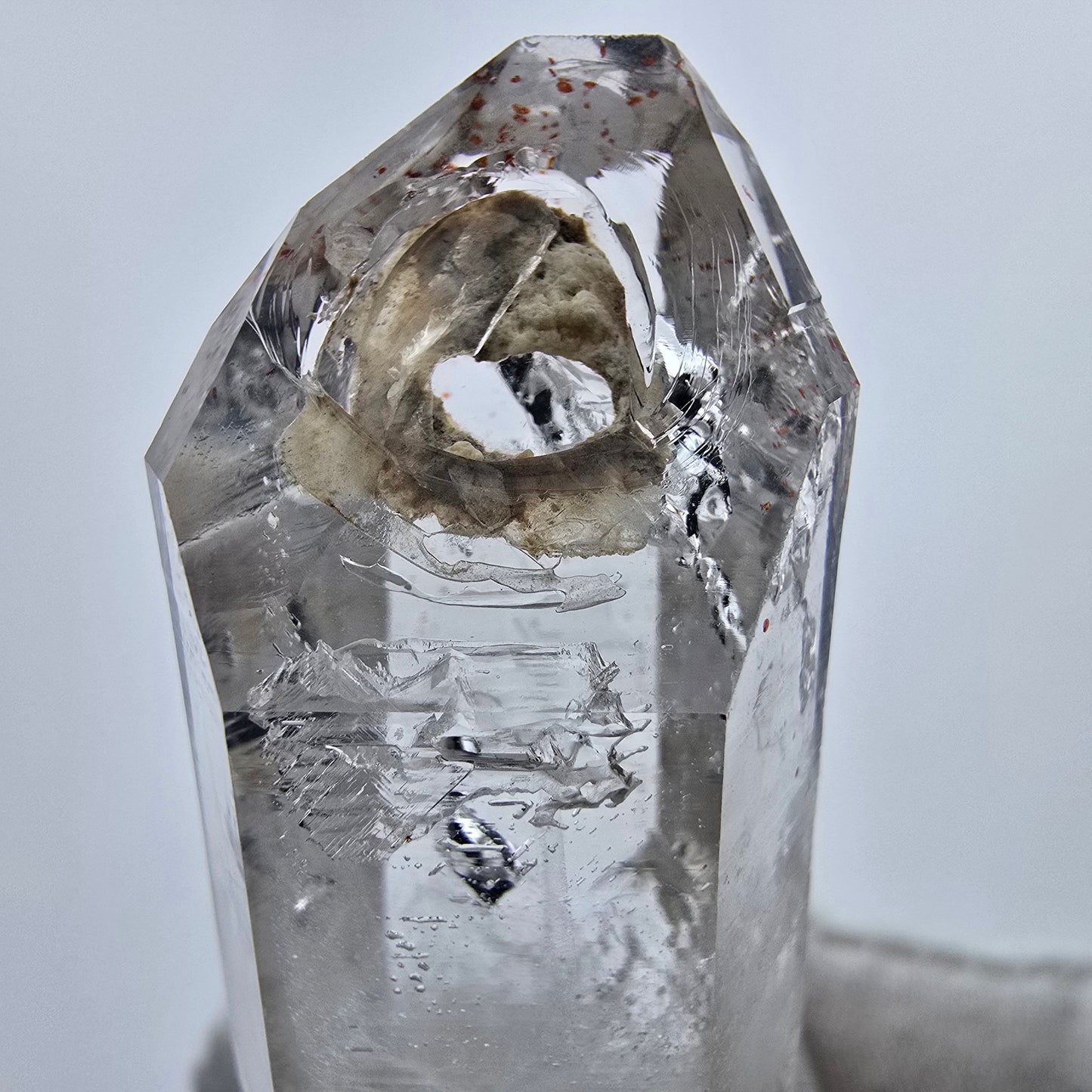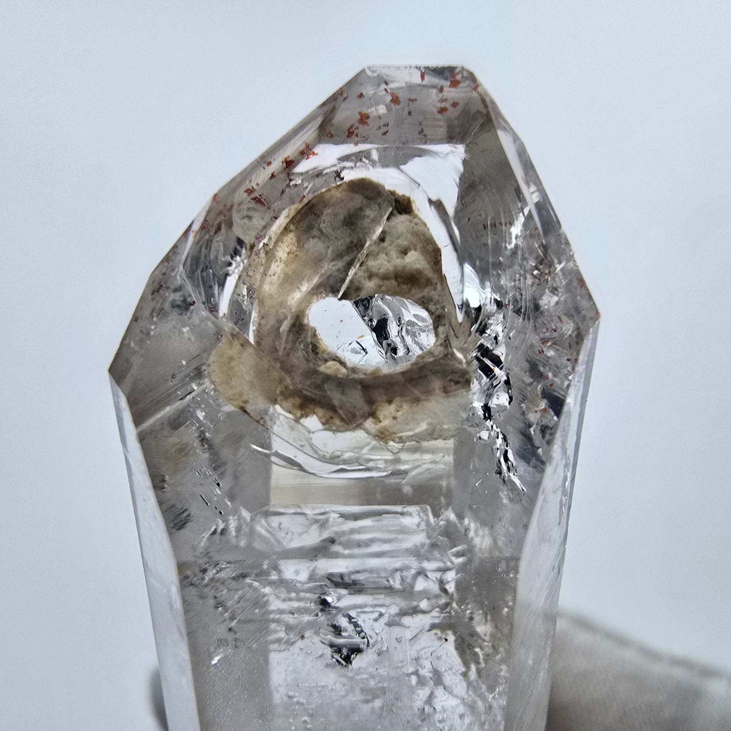 Der Kristall weist mehrere fensterförmige Einschlüsse auf, auch bekannt als Fensterquarz. Diese Besonderheit verleiht dem Kristall eine zusätzliche Dimension der Schönheit. Darüber hinaus enthält er zwei Enhydro Einschlüsse, die jeweils eine bewegliche Luftblase beherbergen - besonders spannend für Sammler und Liebhaber!