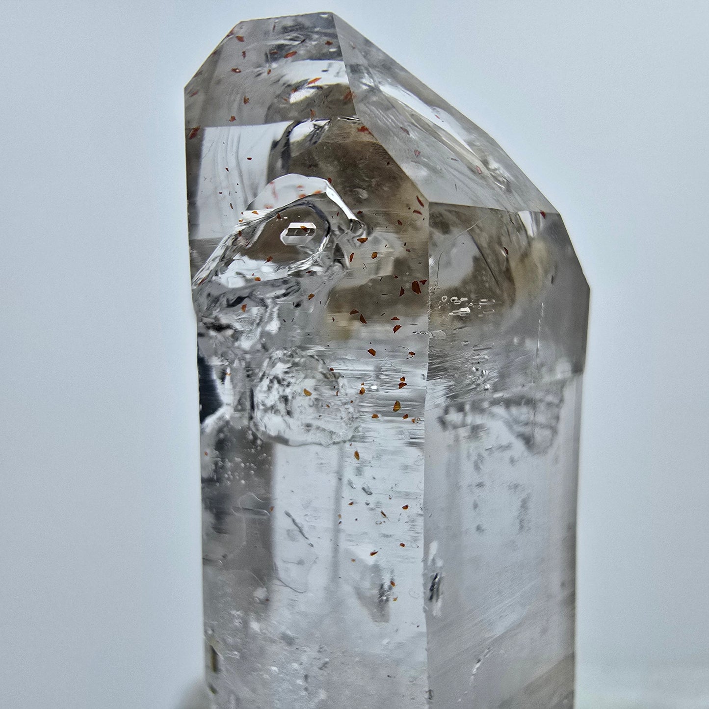 Entdecken Sie diesen einzigartigen und seltenen klaren Halekin Phantom Rauchquarz Kristall, der von atemberaubenden Eigenschaften geprägt ist. Mit seinen eindrucksvollen roten Hämatit Einschlüssen und den wunderschönen braunen Phantomen im Inneren ist dieser Kristall nicht nur ein optisches Highlight, sondern auch ein faszinierendes Naturprodukt.