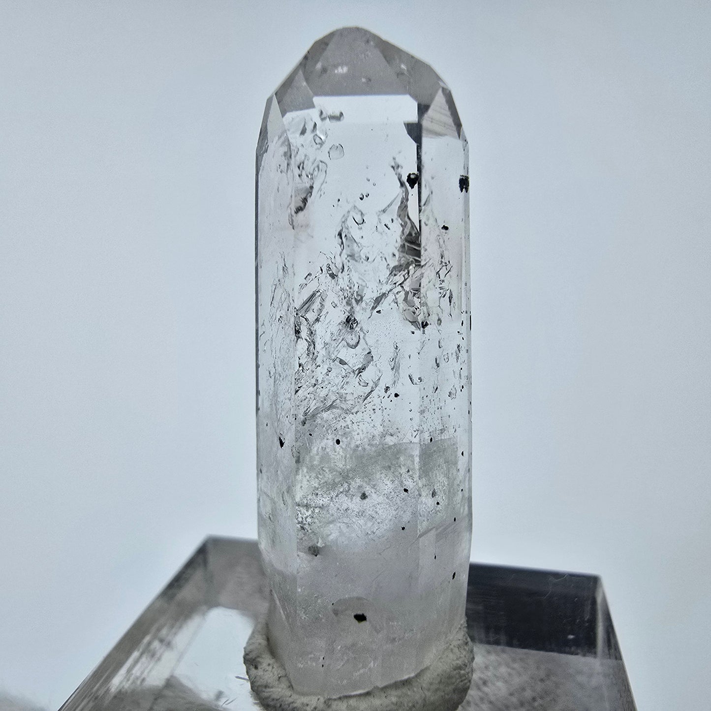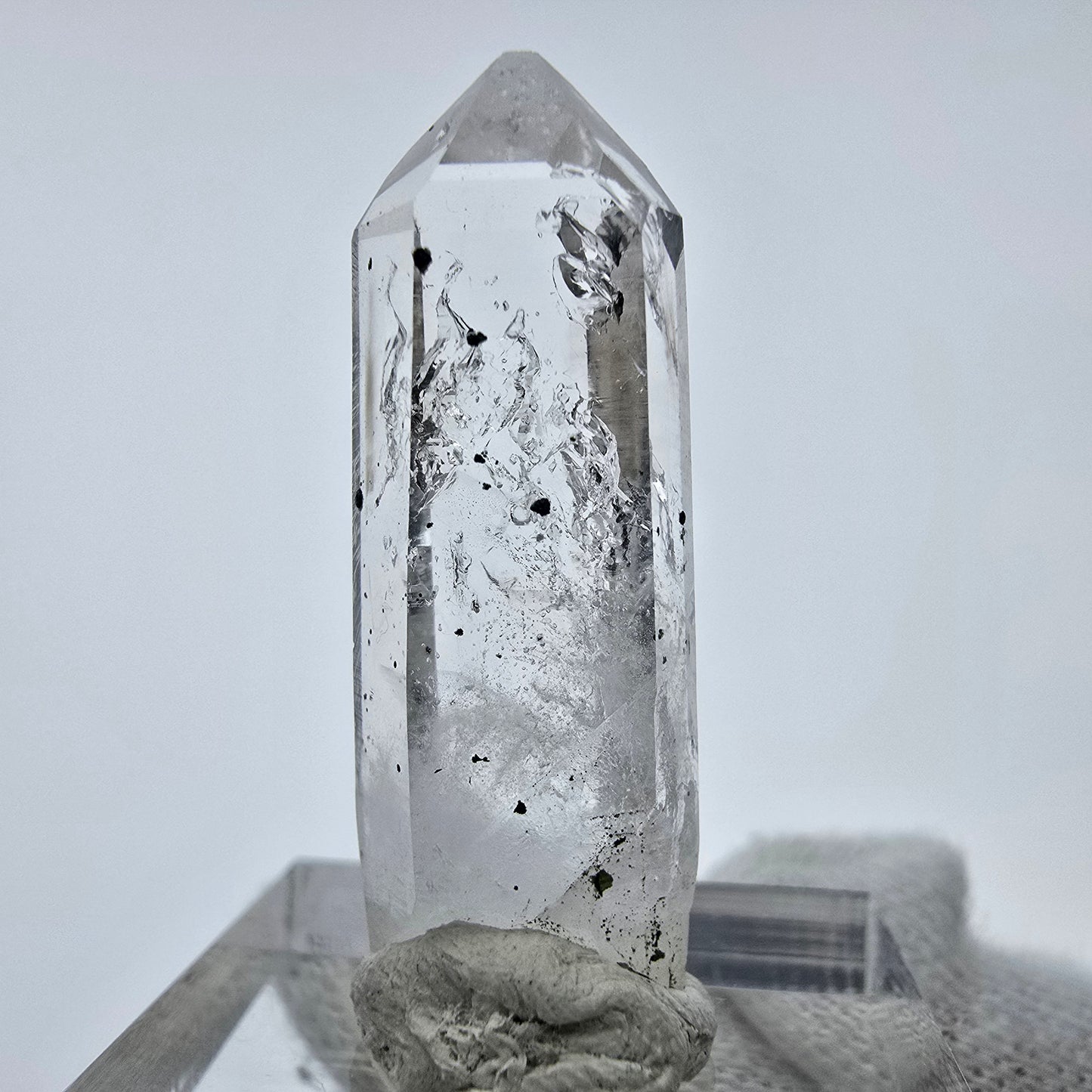An zwei Stellen des Kristalls können Sie einen Enhydro Einschluss mit einer beweglichen Luftblase beobachten, was diesem Stück eine zusätzliche Besonderheit verleiht. Der Fundort dieses einzigartigen Kristalls ist die Streep Mine in Goboboseb, Namibia.