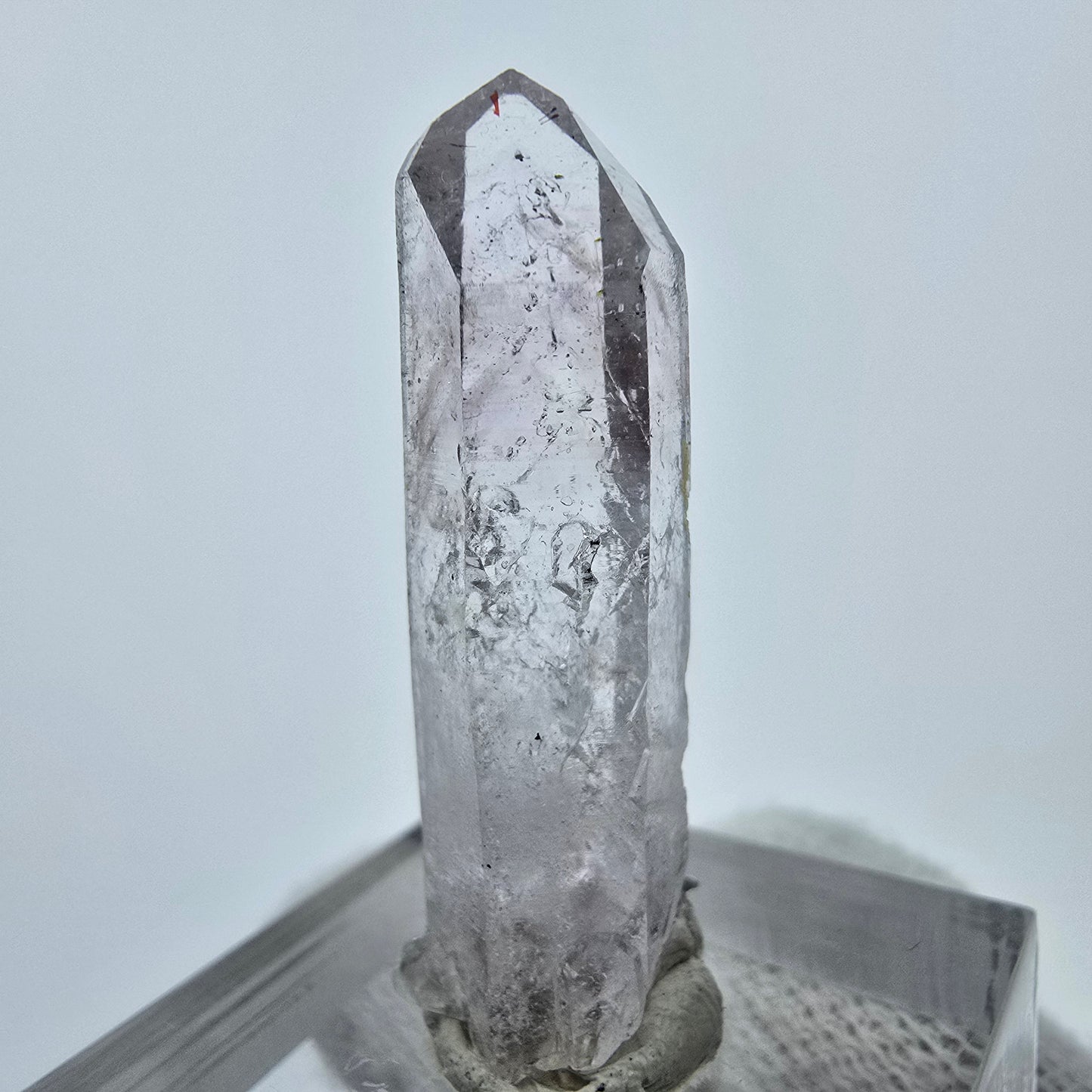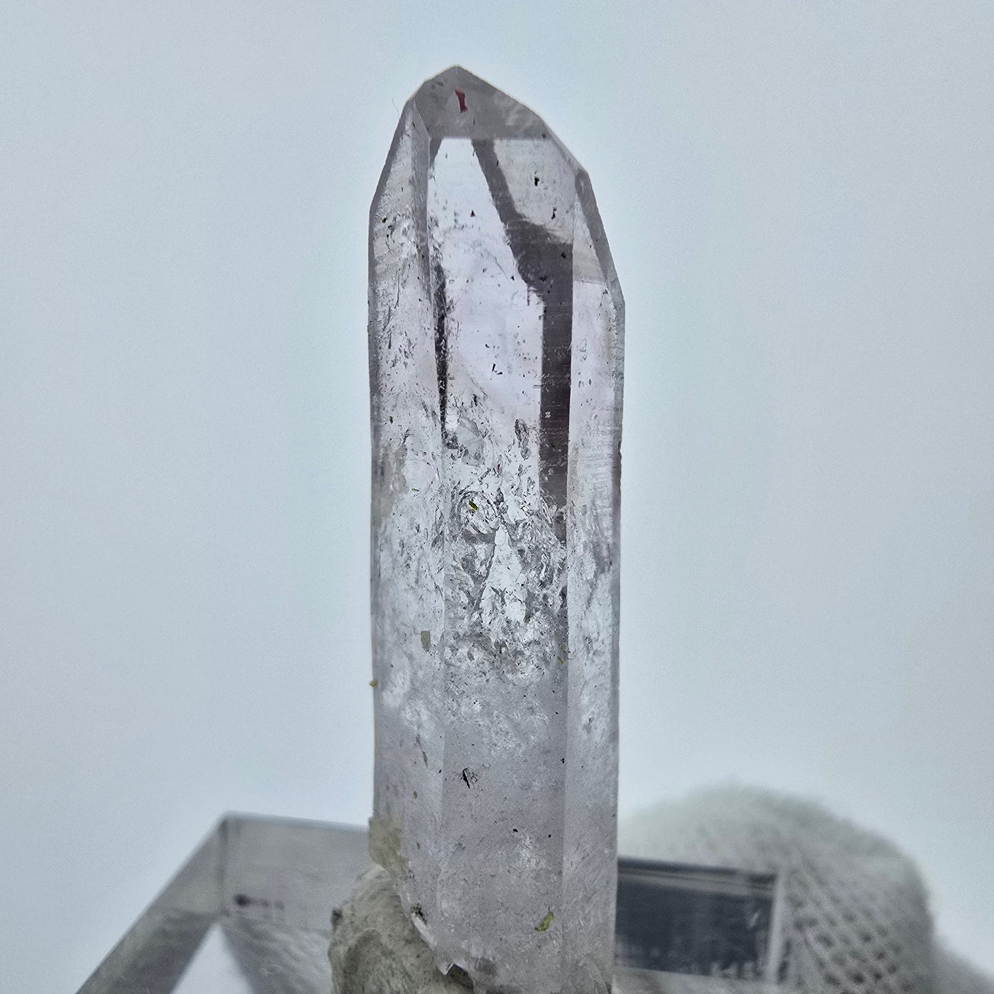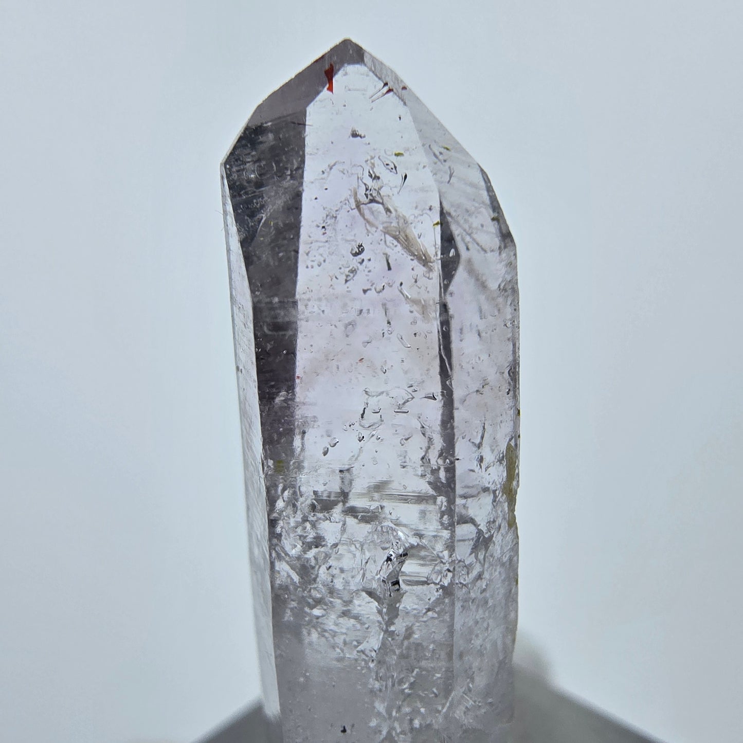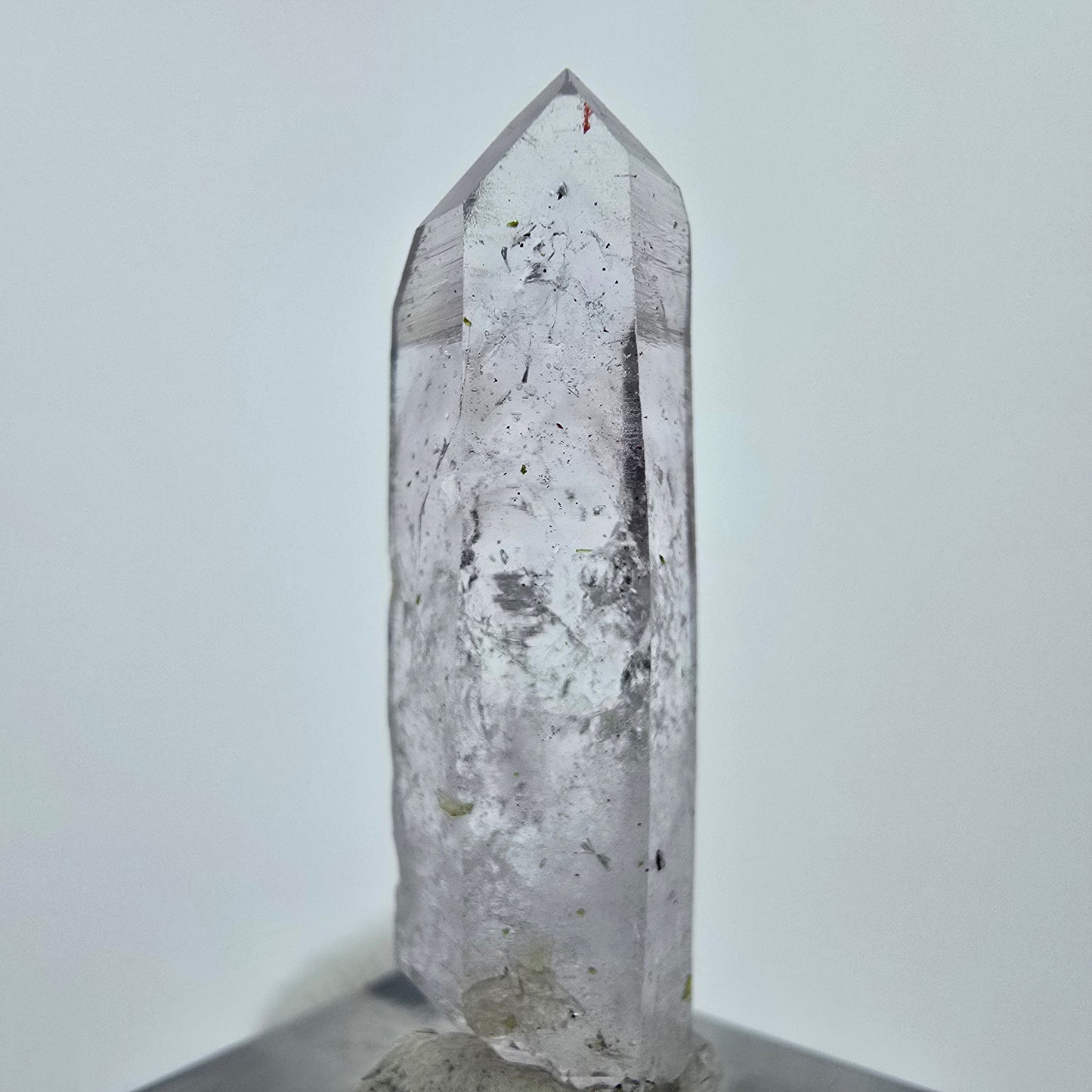 Besonders hervorzuheben ist der seltene rot-braun und silber glänzende Hämatit-Einschluss (Harlekin Quarz), der dem Kristall eine weitere faszinierende Dimension verleiht. An einer Stelle des Kristalls befindet sich ein bemerkenswerter Enhydro-Einschluss, bei dem man eine bewegliche Luftblase beobachten kann, was diesem mineralogischen Wunder einen außergewöhnlichen Charakter verleiht.