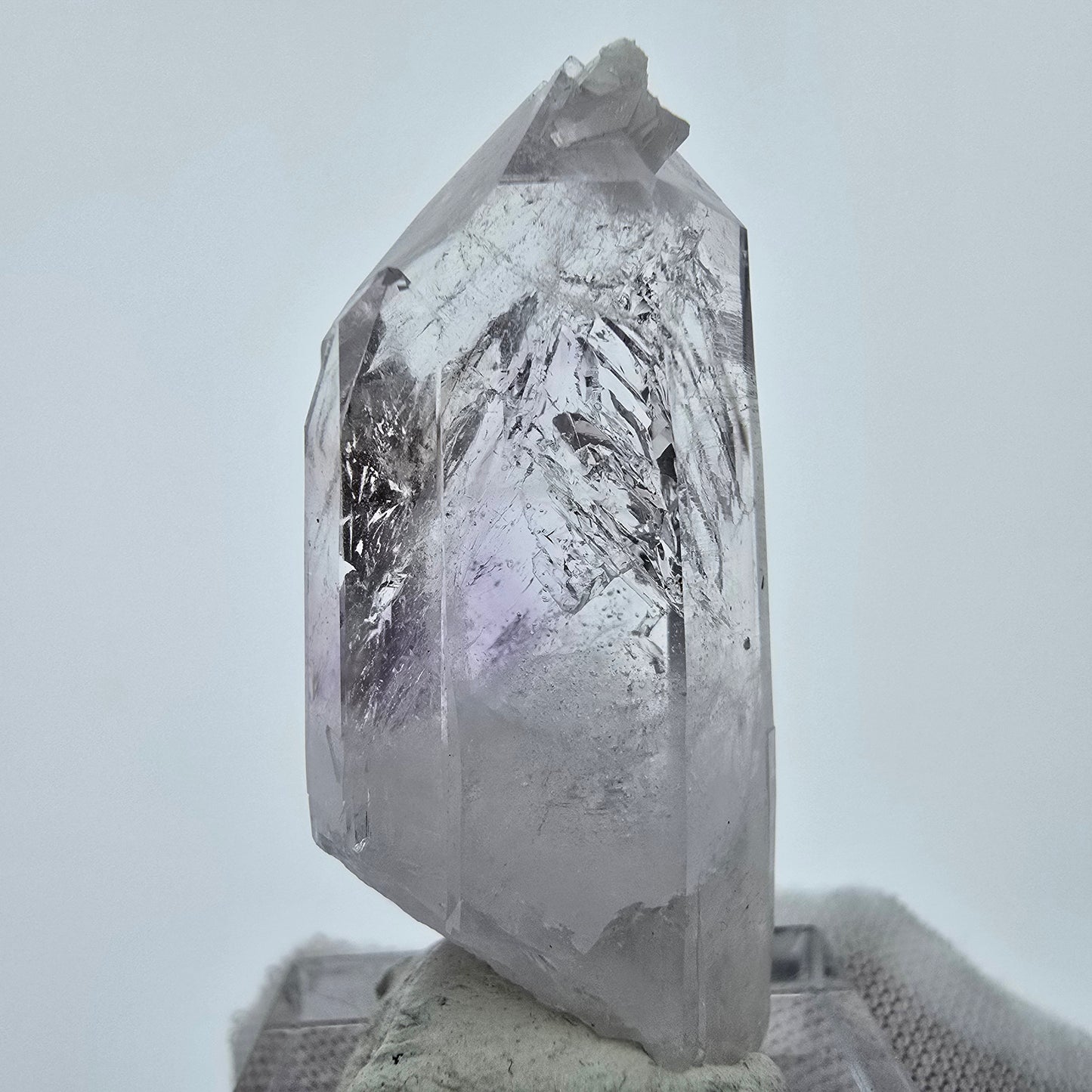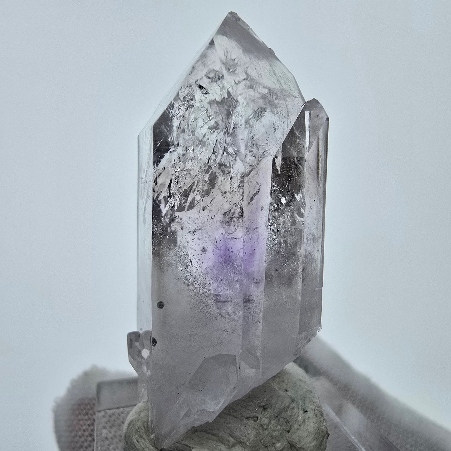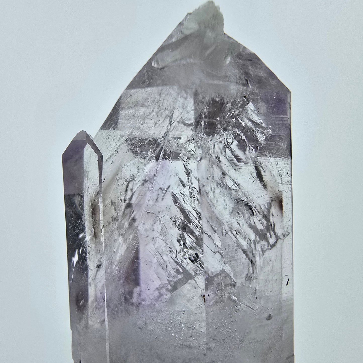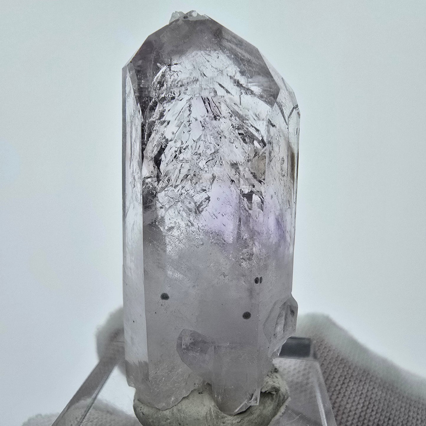 Entdecken Sie die faszinierende Schönheit des Enhydro Phantom Amethyst! Diese seltene klare Amethyst Kristallspitze besticht durch ihre lila-weiße, transparente Farbe und bieten einen atemberaubenden Blick auf die beeindruckenden Phantome, die im Inneren verborgen liegen. Besonders bemerkenswert sind die zwei Enhydro Einschlüsse, die kohlendioxidhaltige Luftblasen enthalten und somit eine faszinierende Bewegung im Inneren des Steines zeigen.