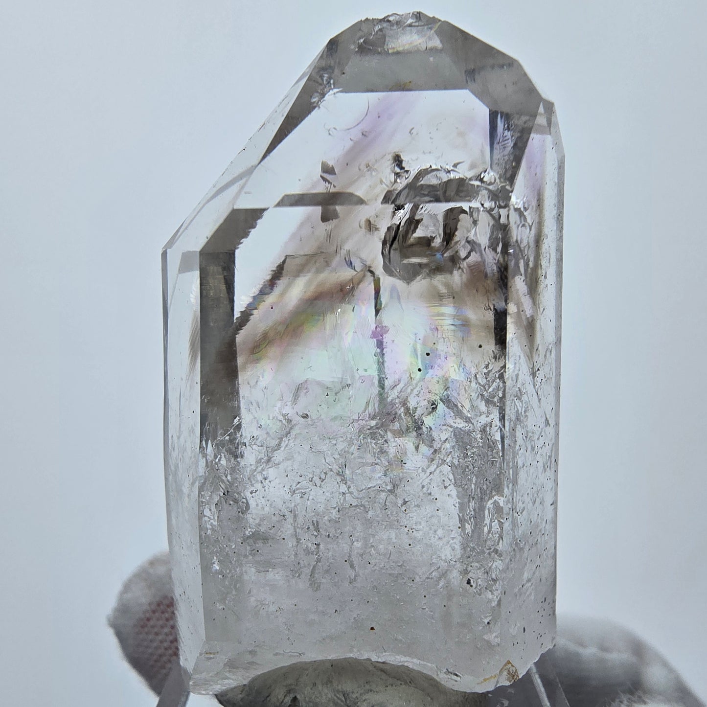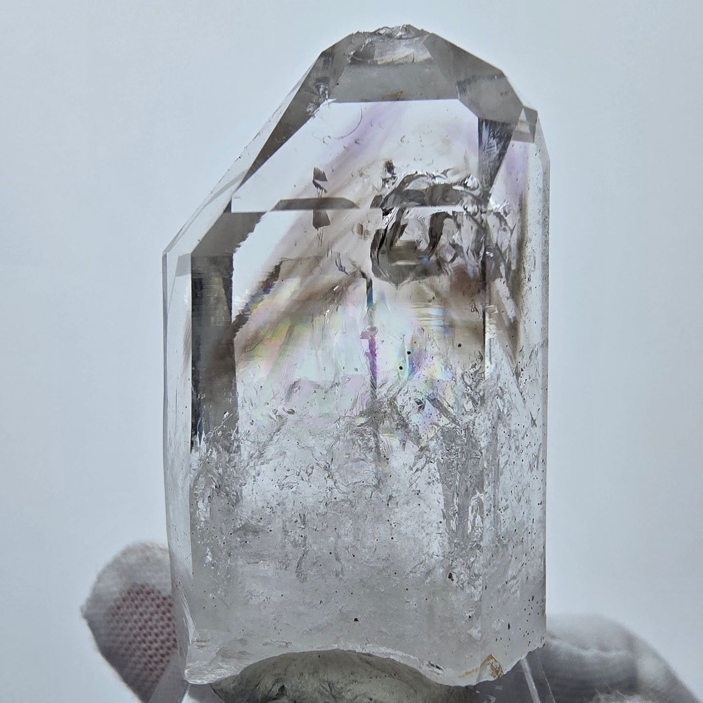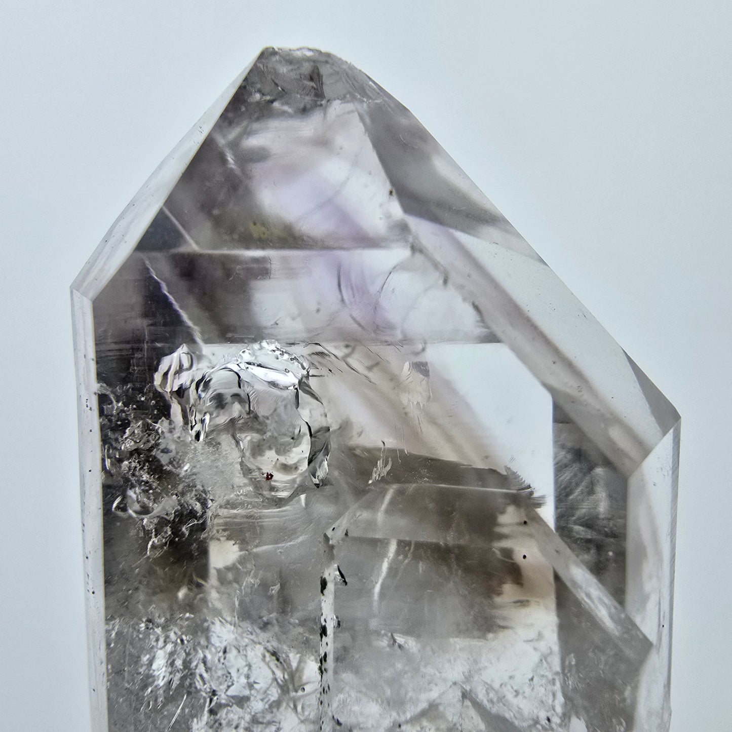 Entdecken Sie diese seltene klare Amethyst Kristallspitze mit einer beeindruckenden lila, weiß und braunen transparenten Oberfläche. Der Kristall ist bekannt für seine wunderschönen Phantome im Inneren, die einen einzigartigen visuellen Effekt erzeugen. Besonders hervorzuheben sind die zwei Enhydro Einschlüsse, die jeweils eine mobile Luftblase enthalten. Durch die Bewegung der Blasen kann man die Dynamik und Lebendigkeit dieses besonderen Kristalls noch besser erleben.