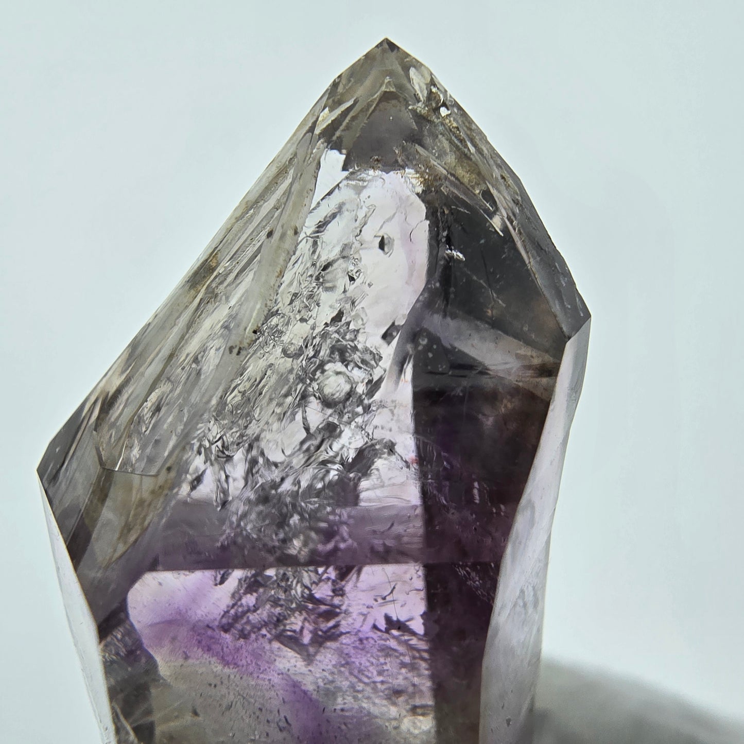 Entdecken Sie unser einzigartiges Enhydro Phantom Amethyst Fenster Zepter, das mit seiner wunderschönen lila-braun-weißen transparenten Farbe besticht. Dieser außergewöhnliche Kristall zeigt eine beeindruckende Phantom Amethyst Kristallspitze, die von faszinierenden Phantomen im Inneren (Phantomquarz) geprägt ist.
