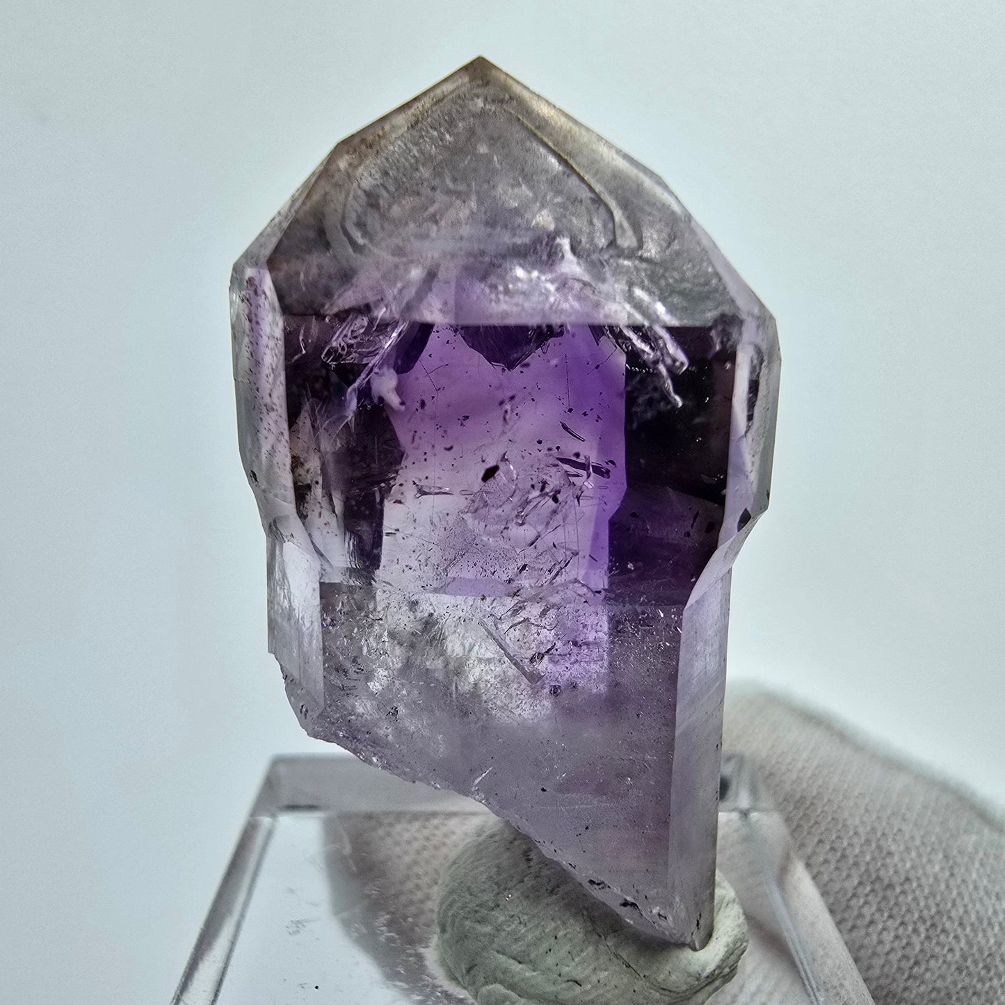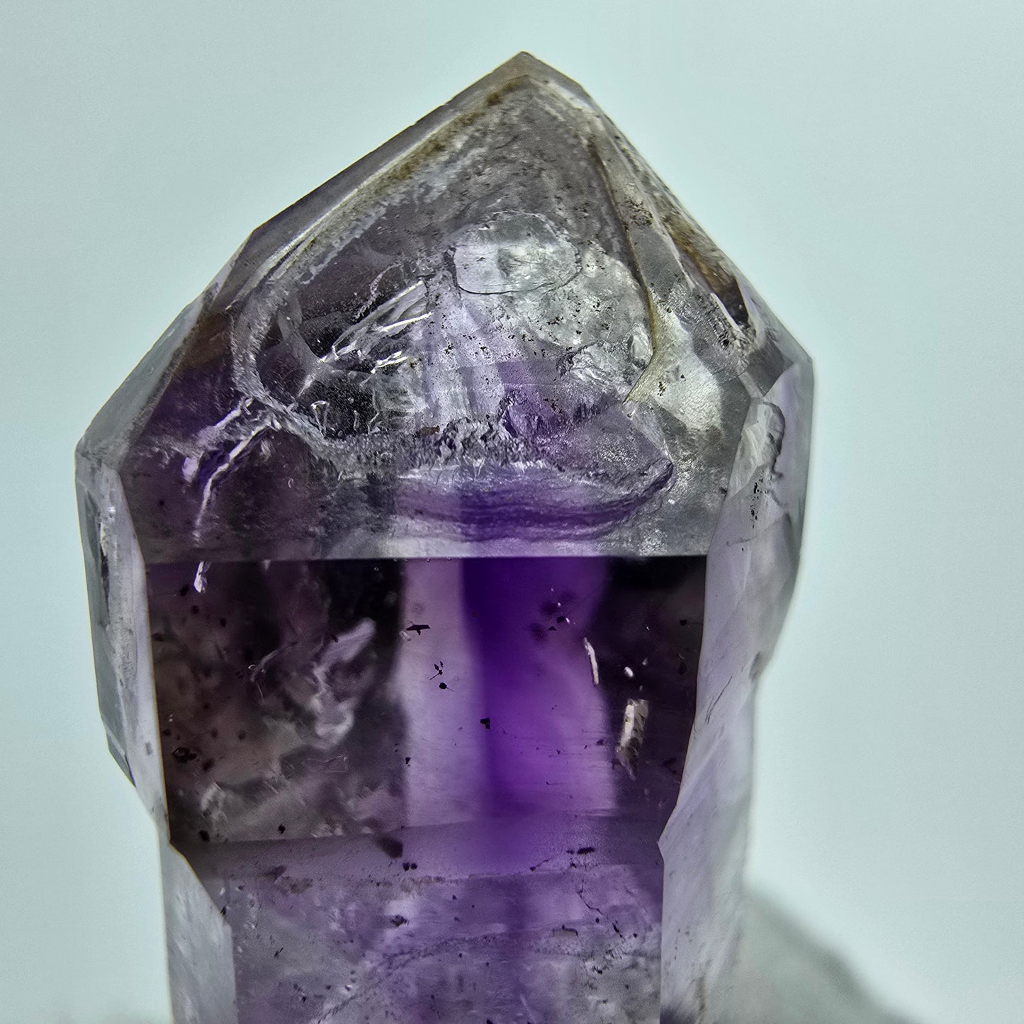 Entdecken Sie den seltenen Enhydro Phantom Amethyst Fenster Zepter, einen einzigartigen Kristall, der durch seine atemberaubende lila-braune Transparenz und die faszinierenden Phantome im Inneren besticht. Dieser Kristall besitzt eine charakteristische Zepter-Form (Zepterquarz) und zeigt einige fensterförmige Einschlüsse, die ihn zu einem beeindruckenden Fensterquarz machen. Besonders bemerkenswert ist der Enhydro-Einschluss, in dem eine bewegliche Luftblase zu sehen ist, die dem Stück zusätzlichen Charme verleiht.