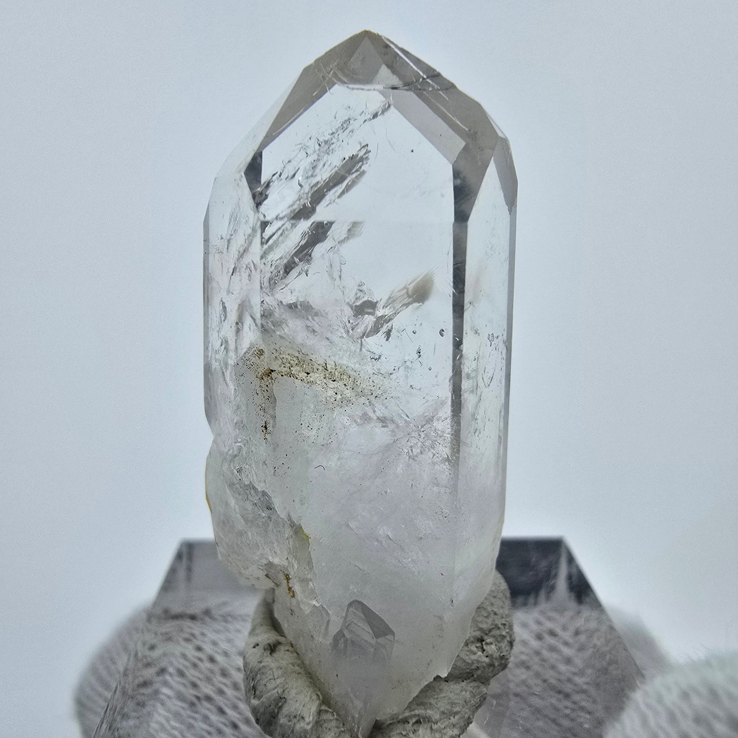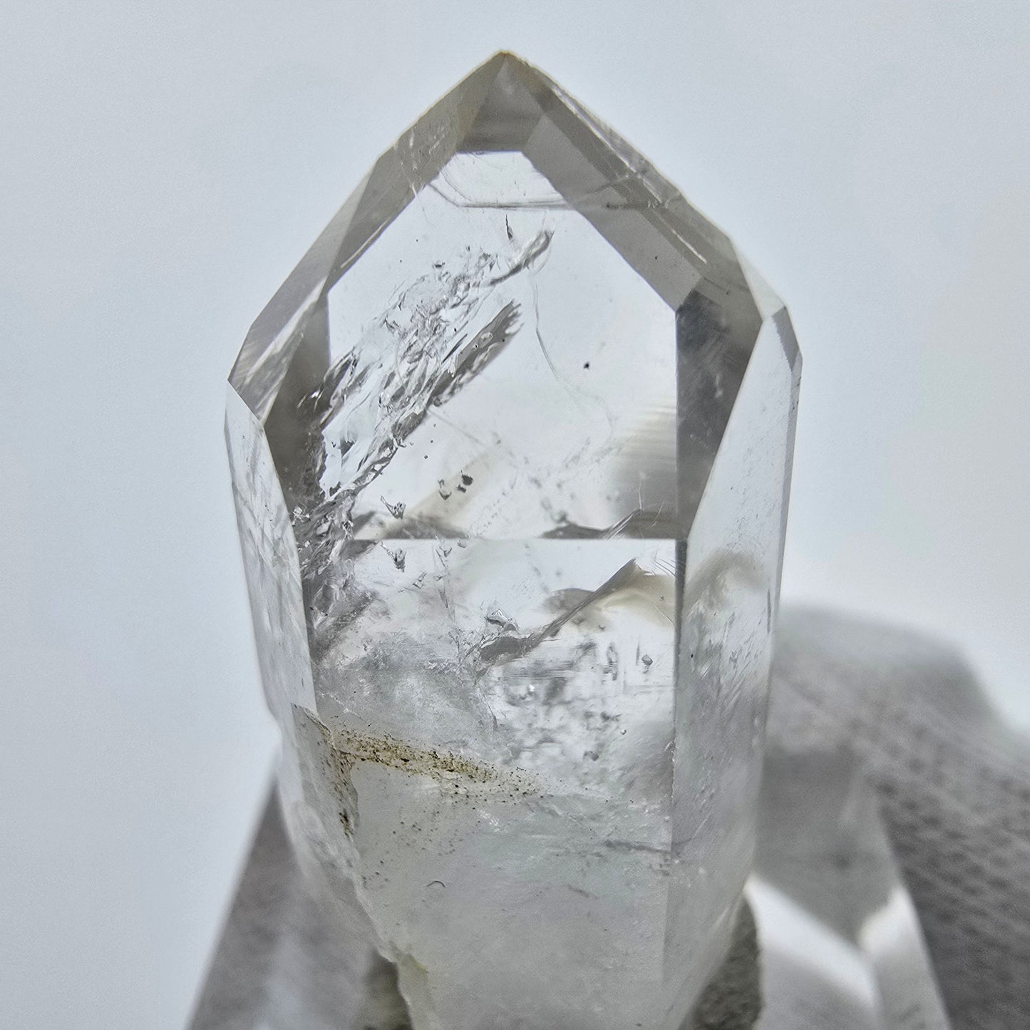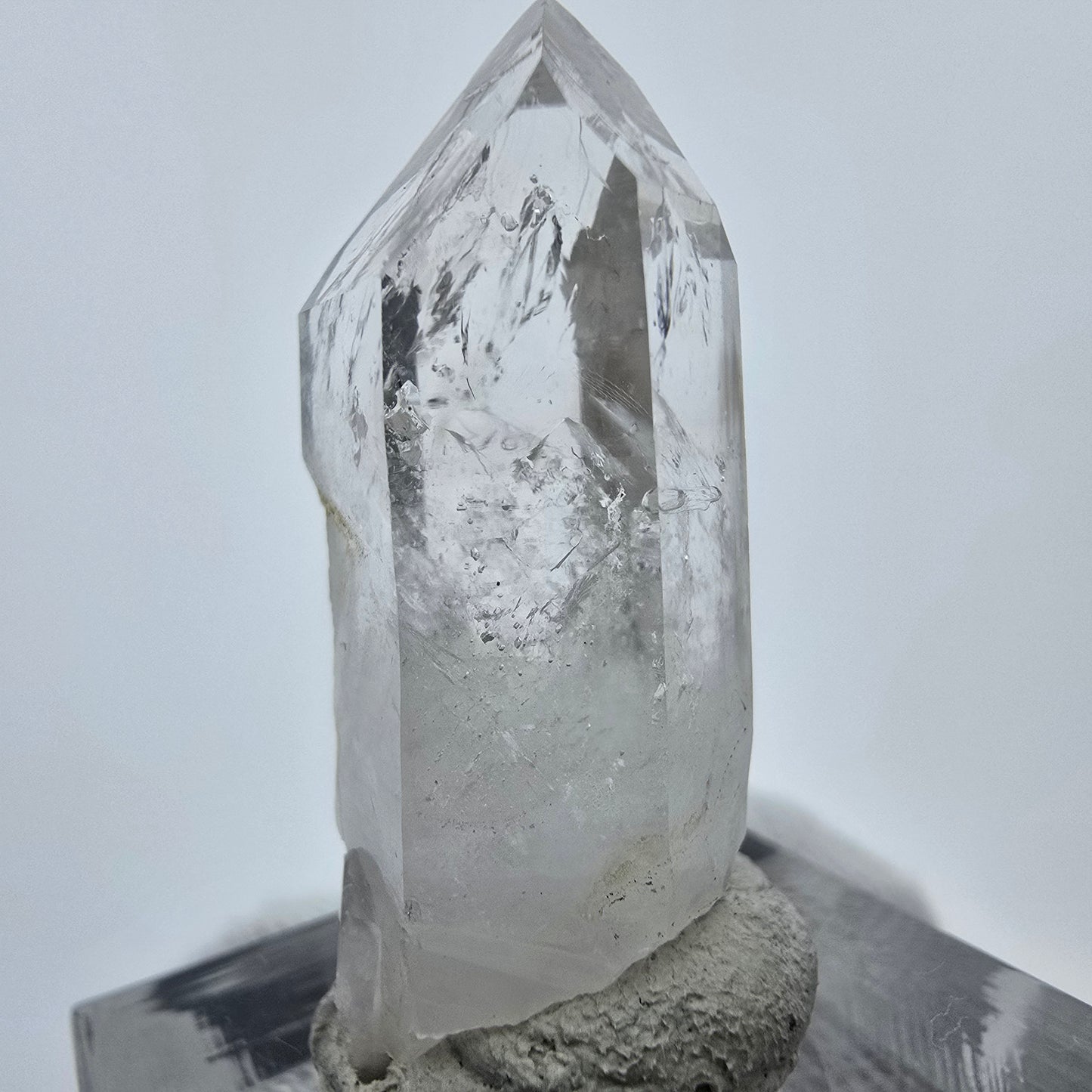 Entdecken Sie den außergewöhnlichen Enhydro Phantom Epidot Quarz, eine seltene, klare Quarz Kristallspitze mit wunderschönen Phantomen im Inneren. Dieser hochwertige Kristall beinhaltet drei bewegliche Luftblasen, die sich an drei Stellen der Kristallstruktur befinden und ihm einen besonderen Charakter verleihen. An einer Seite des Kristalls sind einige leuchtend grüne Epidot Kristalle gewachsen, die harmonisch mit der klaren Quarzspitze harmonieren.
