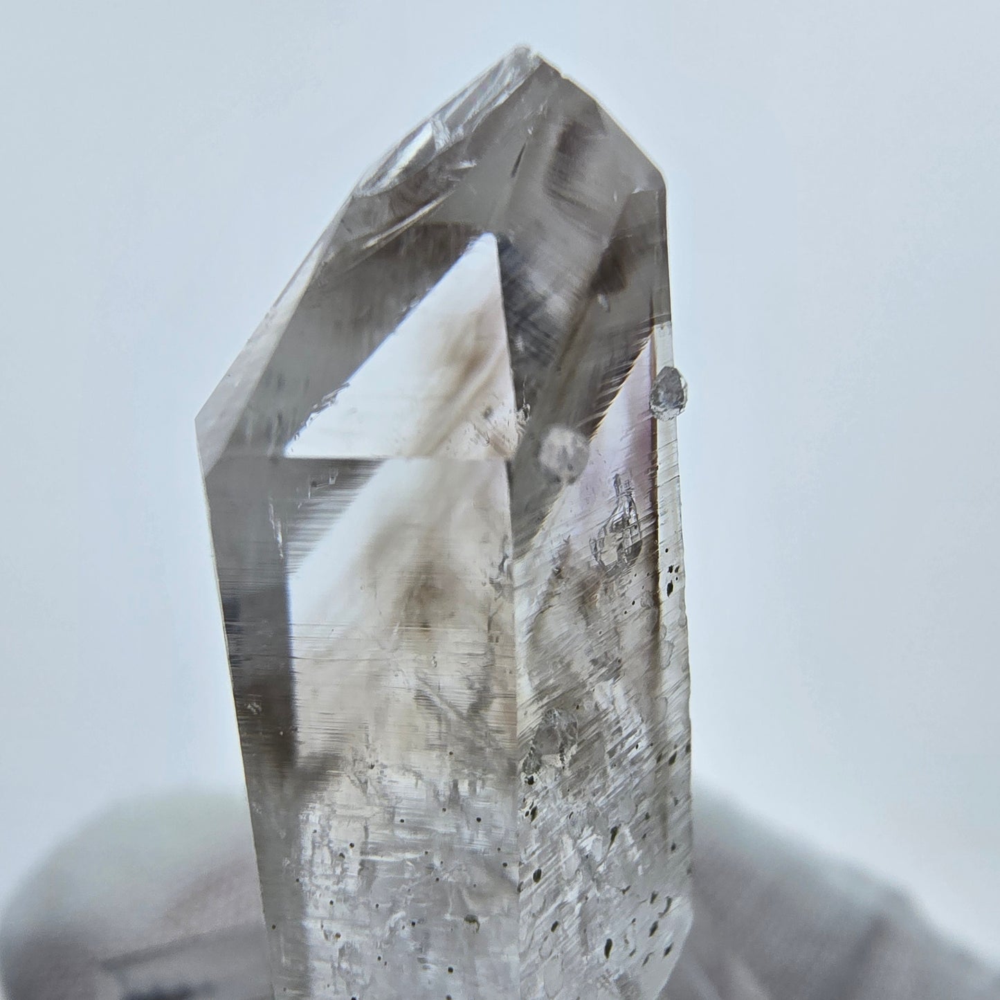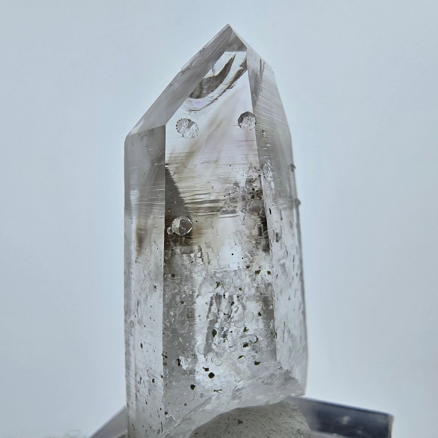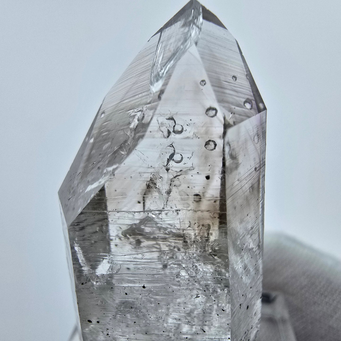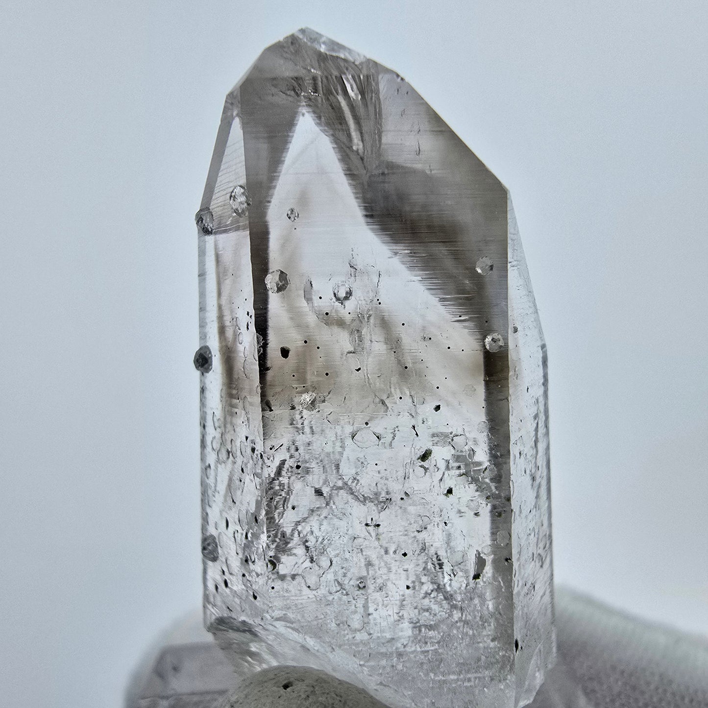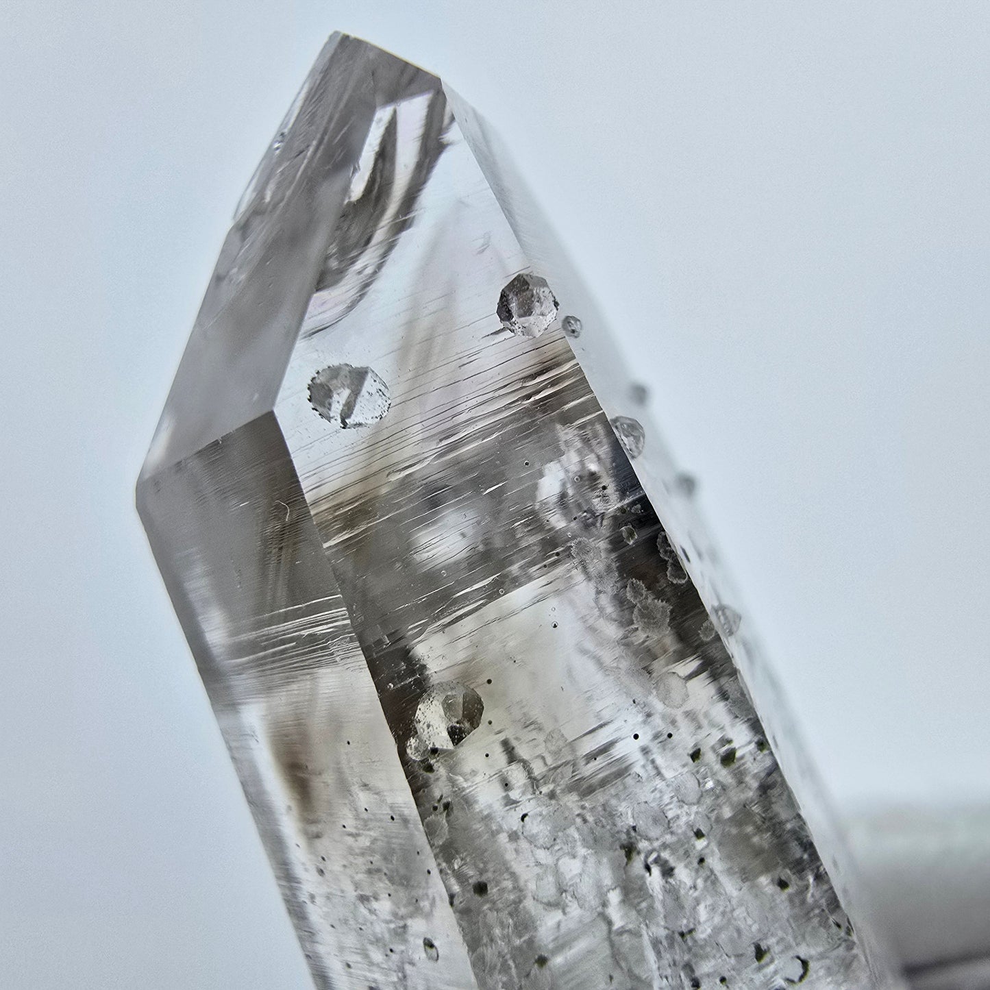 Das Besondere an diesem Enhydro Phantom Quarz sind die zwei Enhydro Einschlüsse, in denen jeweils eine bewegliche Luftblase zu finden ist. Diese Einschlüsse sind nicht nur selten, sondern schenken dem Stein auch eine einzigartige Dynamik und Lebendigkeit.