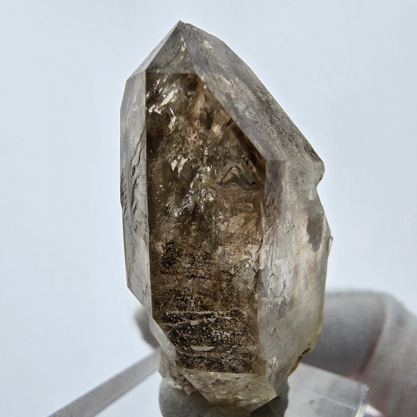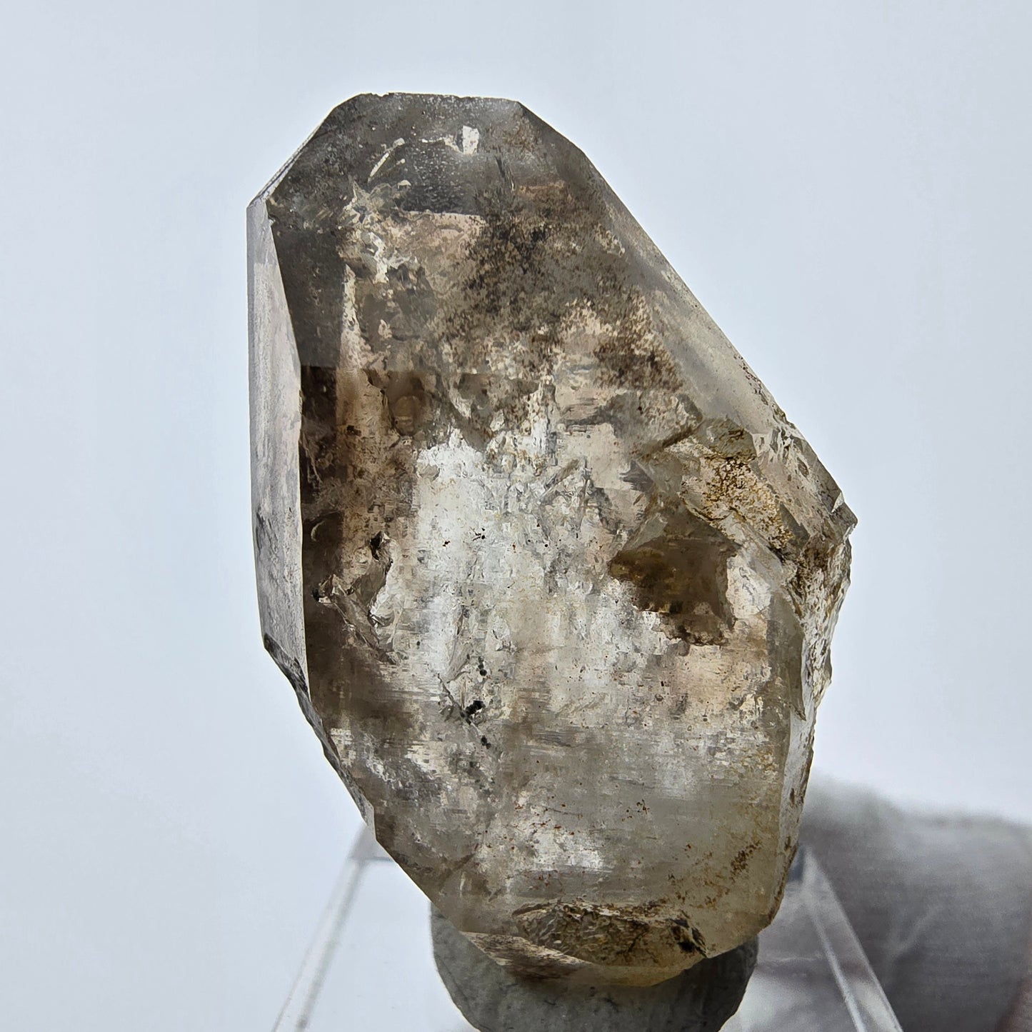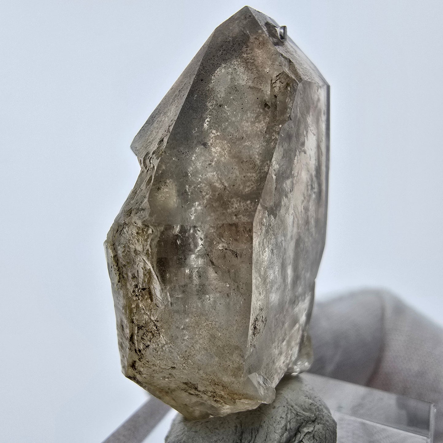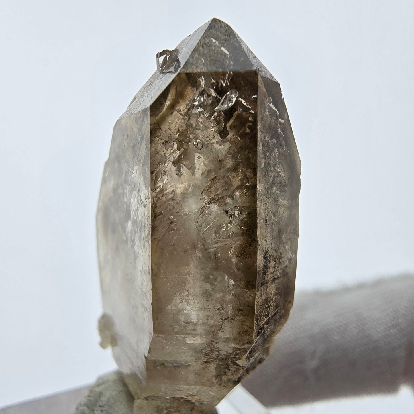 Entdecken Sie die faszinierende Schönheit des Enhydro Phantom Rauchquarz Doppelenders. Dieser exquisite Kristall besticht durch seine klare Rauchquarz-Spitze, die mit einer einzigartigen, braun-weißen, transparenten Phantombildung verziert ist. Die Doppelender-Kristallspitzen verleihen diesem Stück eine besondere Eleganz und machen es zu einem wahren Sammlerstück.
