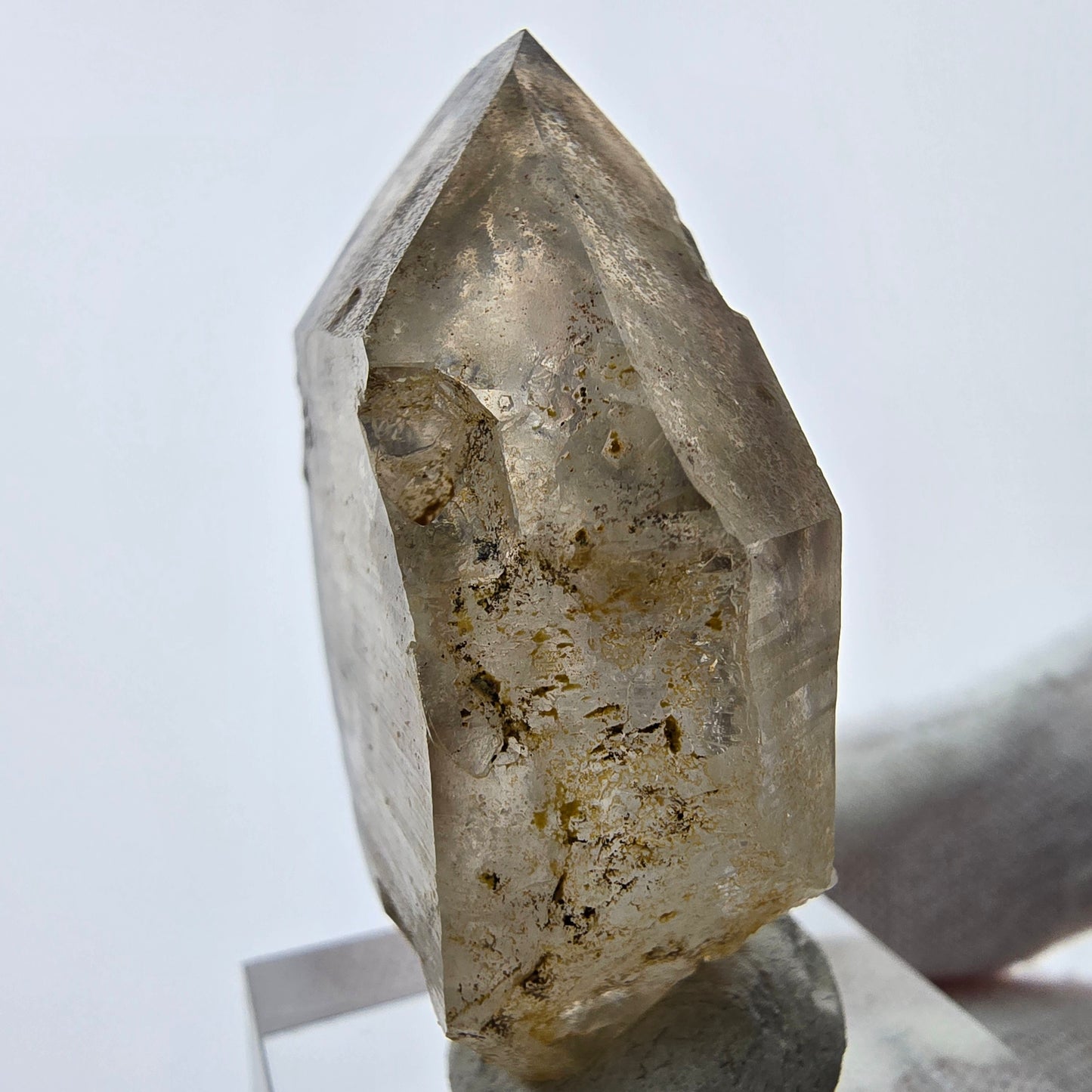 Besonders bemerkenswert sind die zwei Enhydro-Einschlüsse, die jeweils eine bewegliche Luftblase enthalten. Diese natürlichen Merkmale machen den Kristall nicht nur zu einem optischen Highlight, sondern auch zu einem interessanten Gesprächsthema.