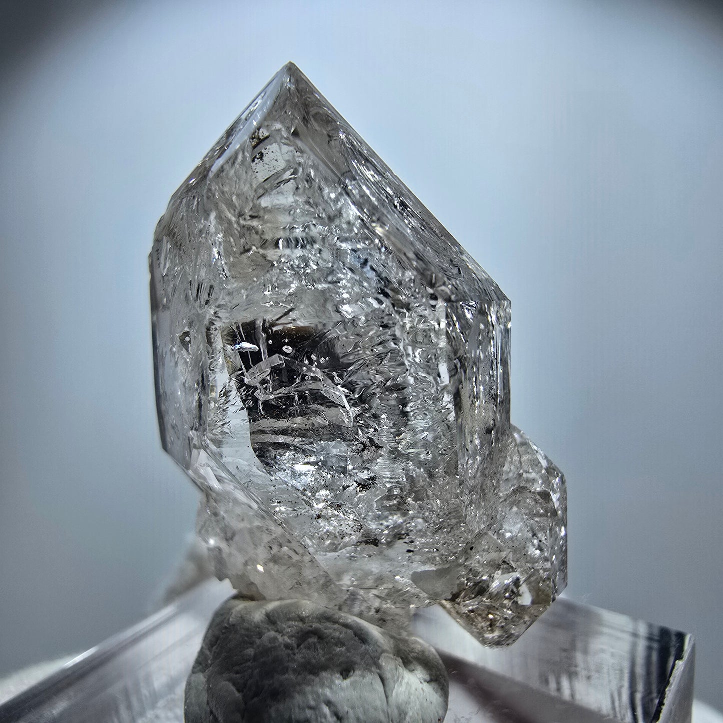 Die Kristalle weisen die beindruckende Doppelender-Zepter-Kristallform auf (DT Zepter Quarz), ergänzt durch fesselnde fensterförmige Einschlüsse (Fensterquarz, Skelettquarz). Ein besonderes Merkmal ist der Enhydro-Einschluss, bei dem sich eine kleine bewegliche Luftblase zeigt, was diesem Kristall eine zusätzliche Dimension verleiht.