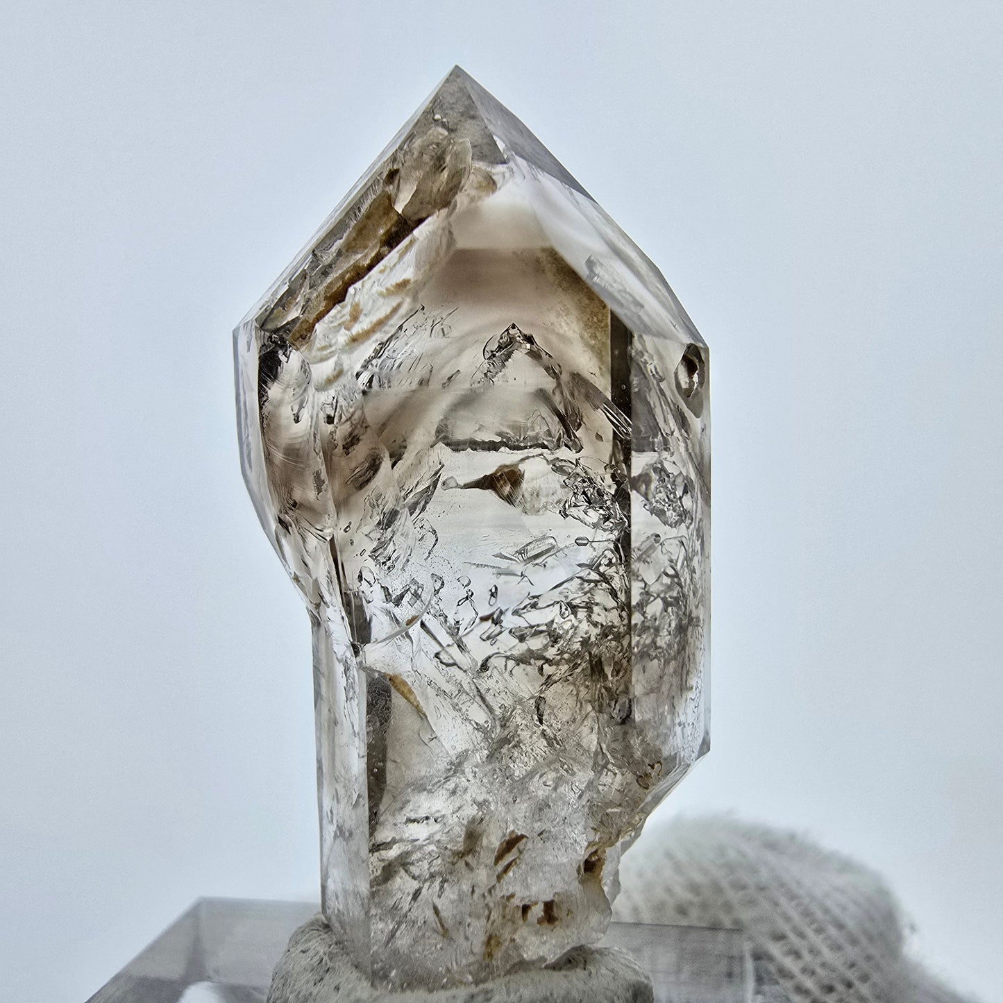 Entdecken Sie diesen seltenen und faszinierenden Enhydro Phantom Rauchquarz Fenster Zepter. Dieser einzigartige Quarz bietet eine klare Kristallspitze, die durch eine wunderschöne braun-weiße, transparente Kristallbildung ergänzt wird. Im Inneren befinden sich beeindruckende Phantome, die für eine mystische Ausstrahlung sorgen. Ein besonderes Highlight ist der Enhydro-Einschluss, der eine bewegliche Luftblase enthält.