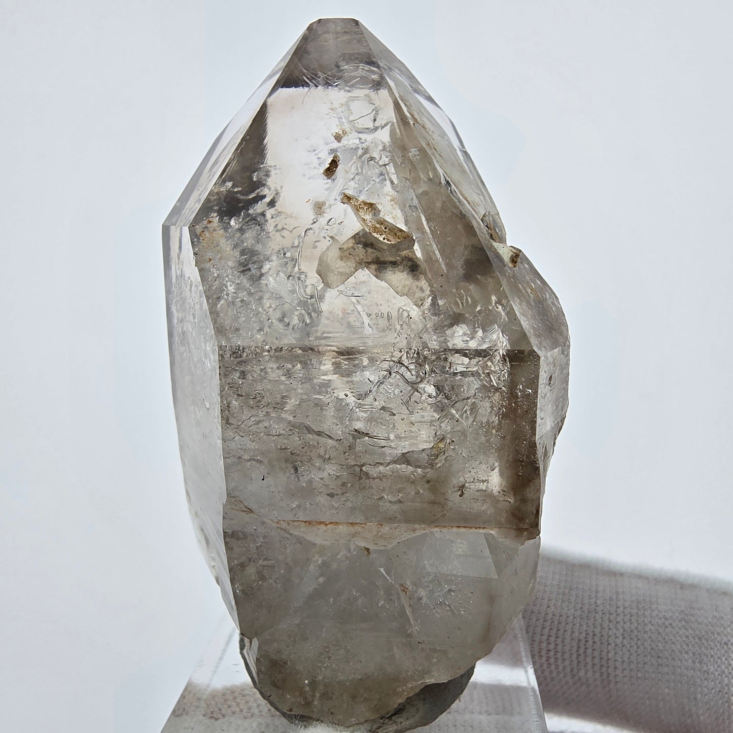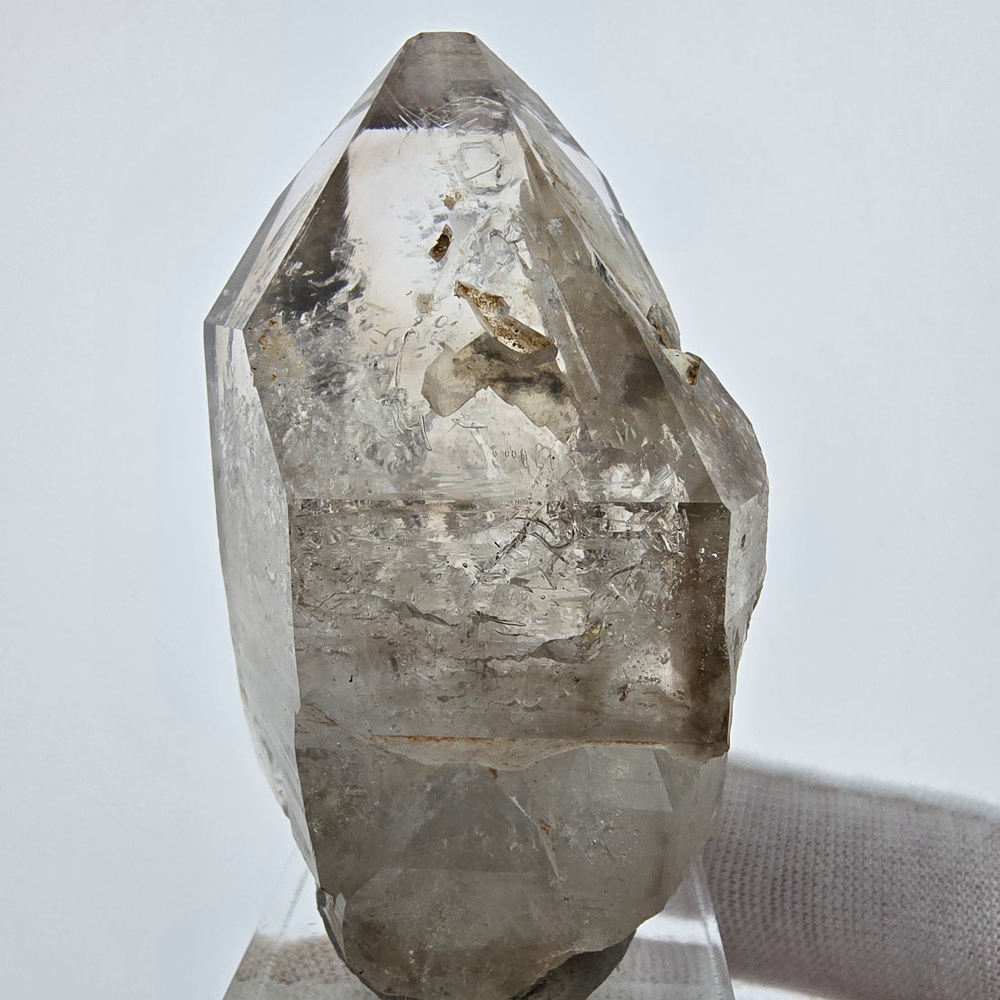 Entdecken Sie die faszinierende Schönheit des Enhydro Phantom Rauchquarz Fensters Zepters. Dieser exquisite Kristall besticht durch seine klare Rauchquarz Kristallspitze, die von einer einzigartigen, braun-weißen, transparenten Phantombildung (Phantomquarz) umgeben ist. Die zepterförmige Kristallform (Zepterquarz) und die fensterförmigen Einschlüsse (Fensterquarz) verleihen diesem Stück eine besondere Eleganz.
