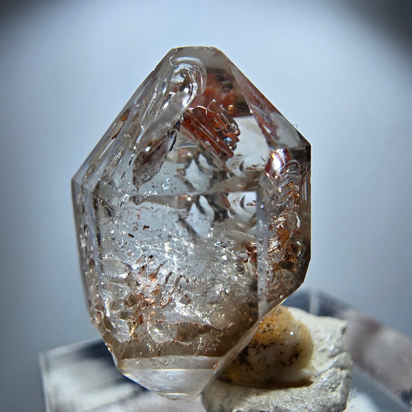 Die Kristalle weisen die charakteristische Doppelender-Zepter-Kristallform (DT Zepter Quarz) sowie eine skelettartige Oberfläche (Skelettquarz) auf. Ein besonderes Merkmal ist der Enhydro-Einschluss, bei dem Sie eine bewegliche Luftblase beobachten können.
