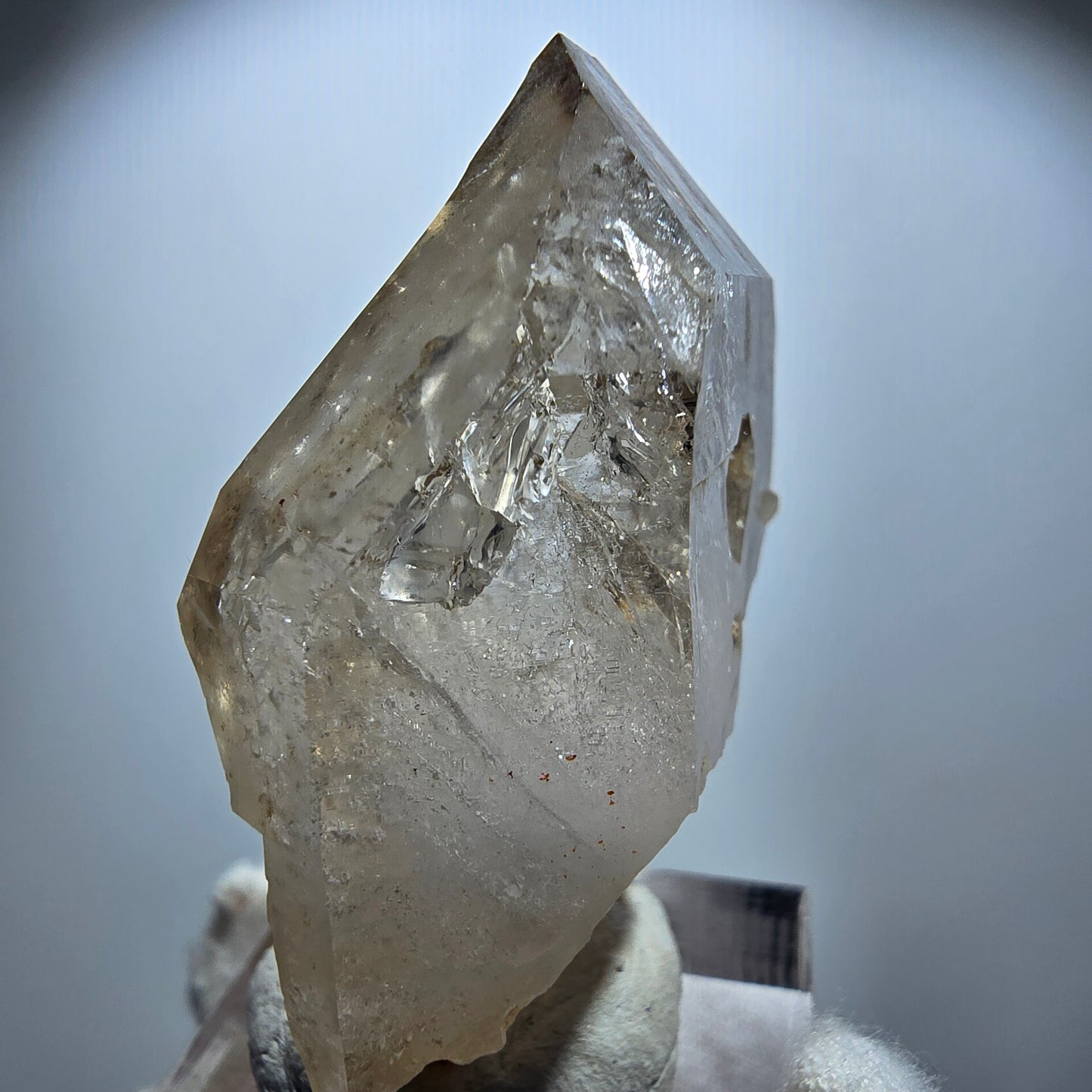 Bei näherer Betrachtung erkennen Sie an zwei Stellen die beeindruckenden Enhydro Einschlüsse, die mit einer beweglichen Luftblase gefüllt sind. Diese Besonderheit macht diesen Kristall zu einem wahren Sammlerstück.