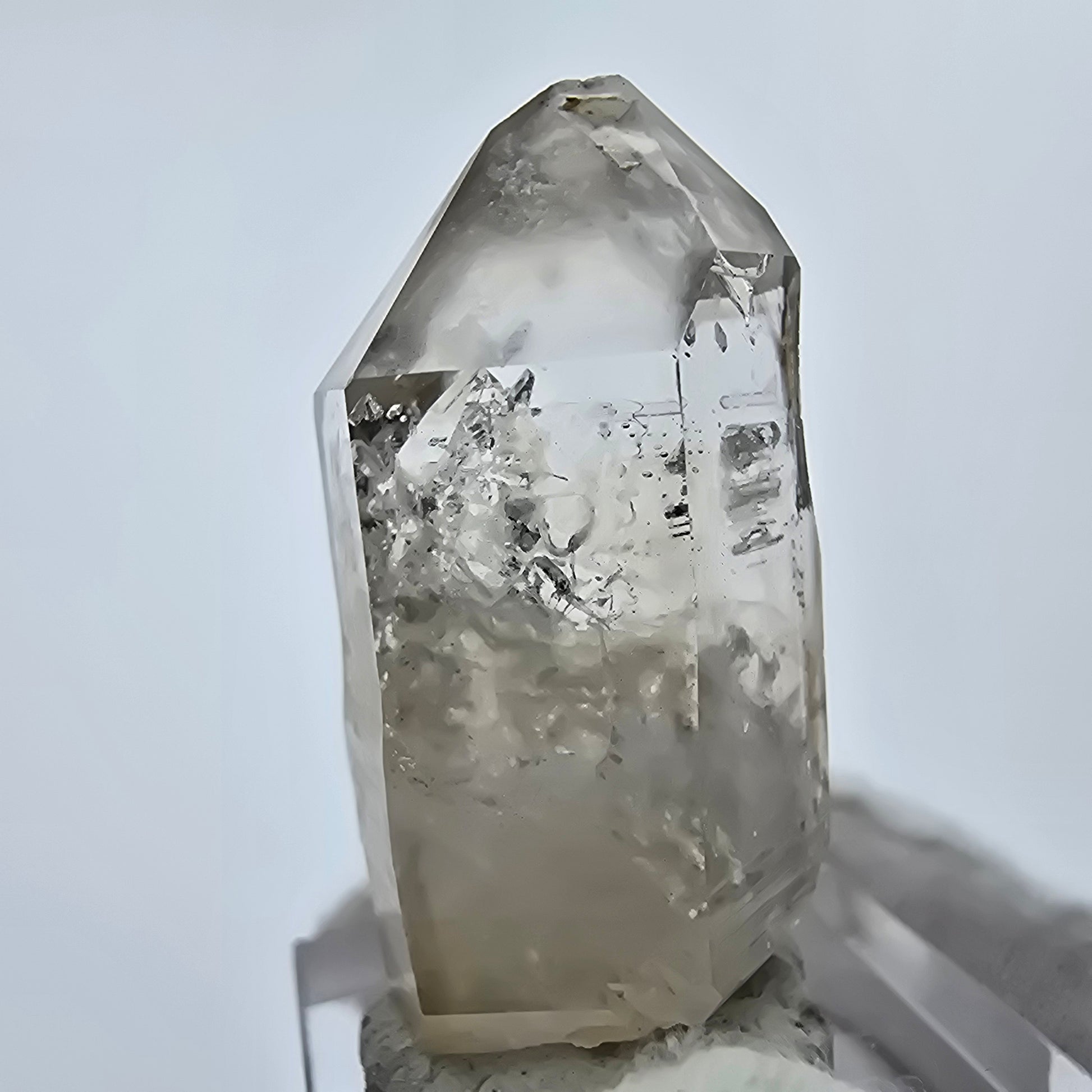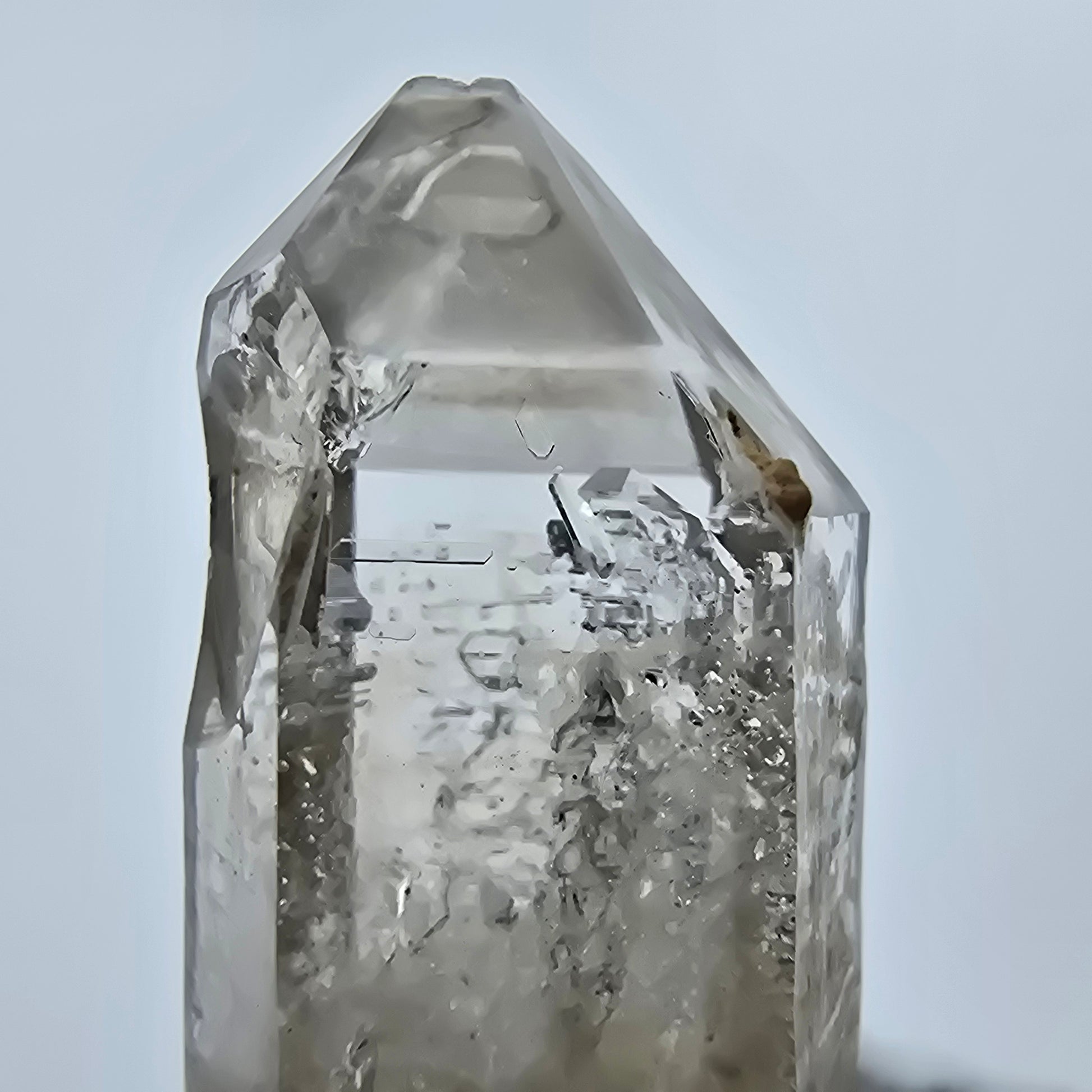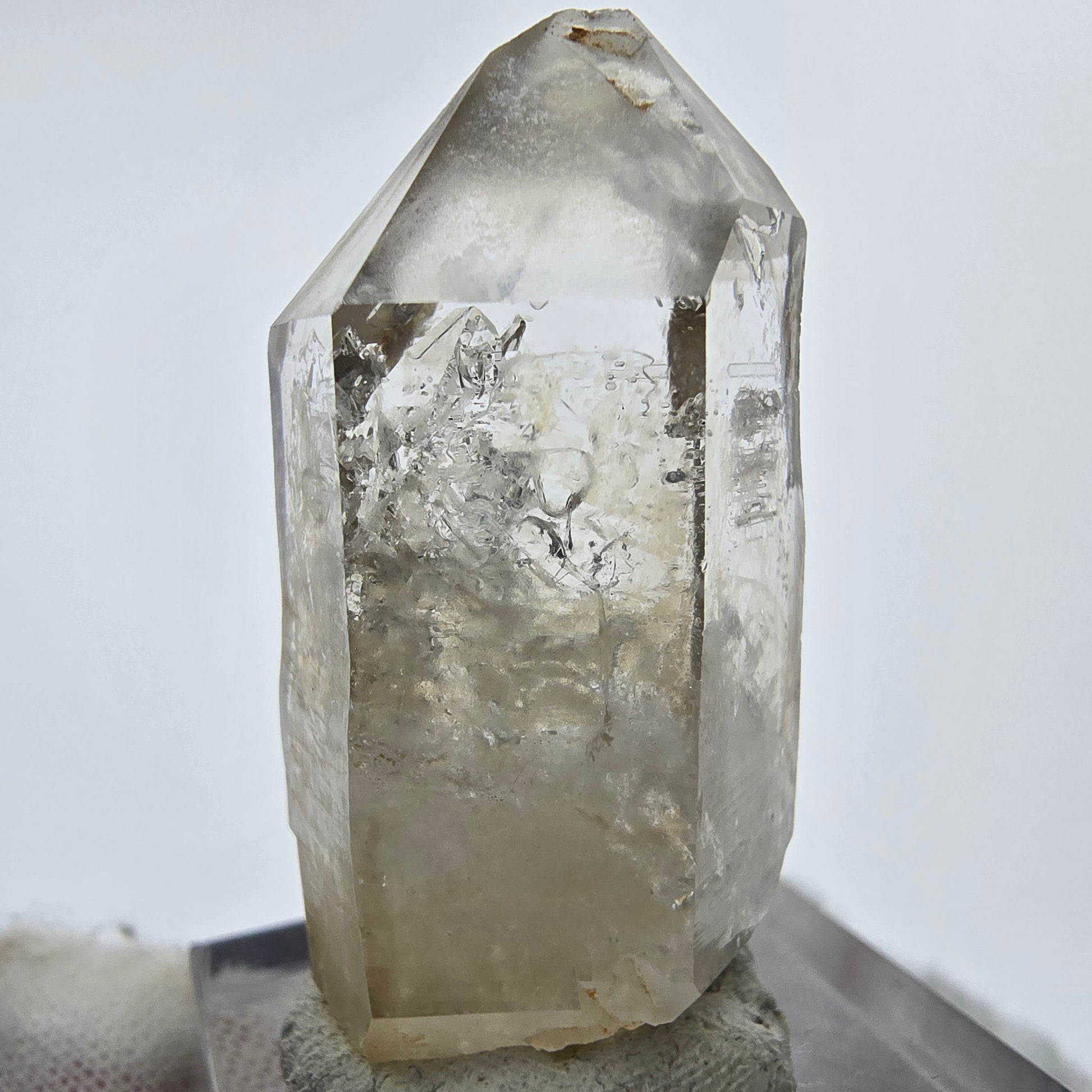 Entdecken Sie die faszinierende Schönheit dieser klaren Rauchquarz Kristallspitze, die mit einer einzigartigen phantomartigen Kristallbildung verzaubert. Diese exquisite Spitze zeigt eine braun-weiße, transparente Struktur, die das Licht auf beeindruckende Weise bricht und reflektiert. Besonders hervorzuheben sind die zwei Enhydro Einschlüsse, die jeweils eine bewegliche Luftblase enthalten, was diesem Stück eine besondere Note verleiht.