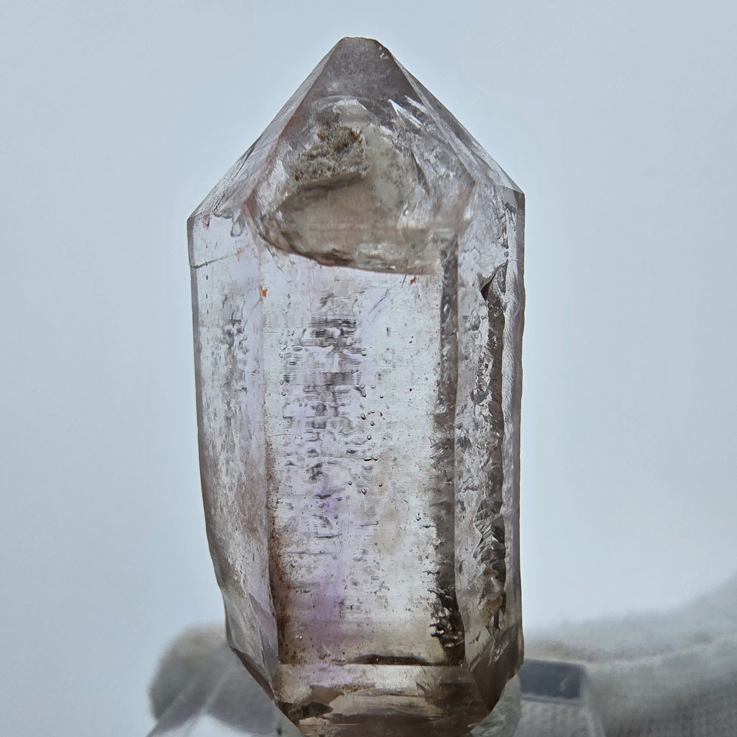 Entdecken Sie die faszinierende Schönheit des Enhydro Skelett Phantom Amethyst DT Zepter Kristalls. Dieser exquisite Kristall besticht durch seine schöne lila-braune, transparente Farbe und die einzigartigen Phantome, die im Inneren sichtbar sind. Der Phantom Amethyst ist ein Doppelender Kristall mit einer zepterförmigen Kristallform, die ihm eine besondere Eleganz verleiht.