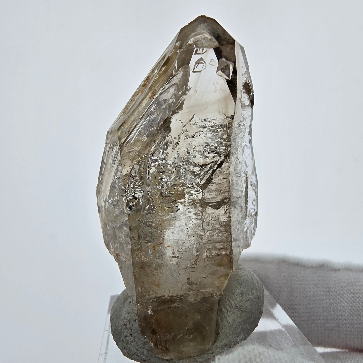 Entdecken Sie die faszinierende Schönheit unserer großen Phantom Rauchquarz Fenster Zepter Spitze. Dieser beeindruckende Kristall besticht durch seine klare, rauchige Farbgebung und die einzigartige, zepterförmige Kristallform. Die braun-weißen, transparenten Phantom-Einschlüsse verleihen dem Kristall eine mystische Ausstrahlung, die in jedem Lichtspiel zur Geltung kommt.
