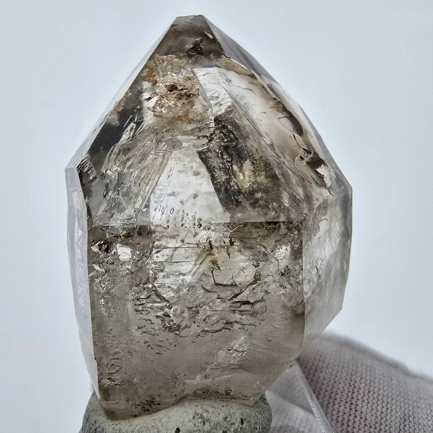 Entdecken Sie die Schönheit dieser großen Phantom Rauchquarz Fenster Zepter Spitze. Dieser beeindruckende Kristall besticht durch seine klare, rauchige Farbe und die faszinierenden, phantomartigen Kristallbildungen, die ihm einen einzigartigen Charakter verleihen. Die zepterförmige Kristallform (Zepterquarz) und die fensterförmigen Einschlüsse (Fensterquarz) machen diesen Kristall zu einem wahren Sammlerstück.