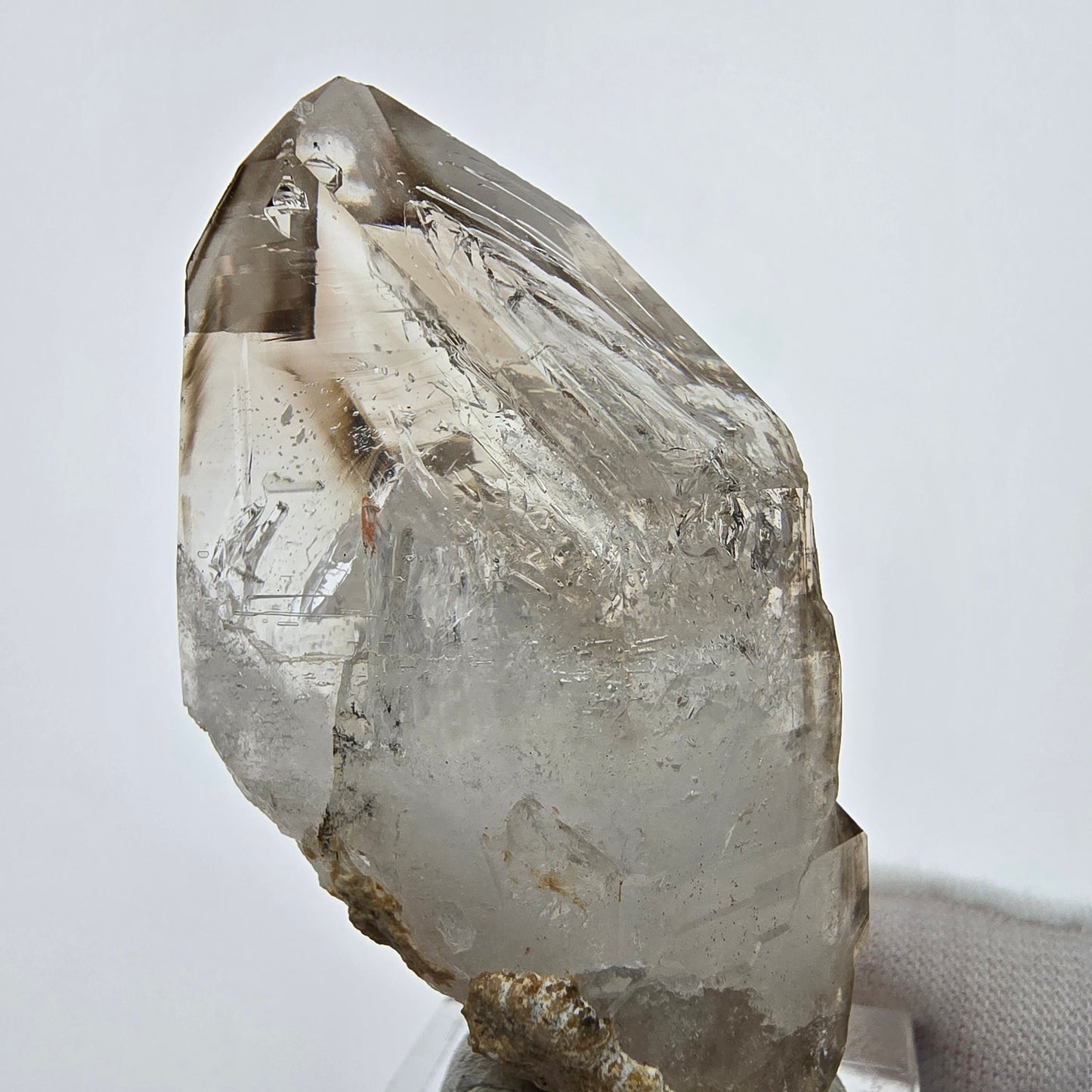 Entdecken Sie die faszinierende Schönheit unserer großen Phantom Rauchquarz Fenster Zepter Spitze. Dieser beeindruckende Kristall besticht durch seine klare Rauchquarzfarbe und die einzigartige, braun-weiße transparente Phantombildung, die ihm einen mystischen Charakter verleiht. Die zepterförmige Kristallform (Zepterquarz) und die fensterförmigen Einschlüsse (Fensterquarz) machen diesen Kristall zu einem wahren Sammlerstück.