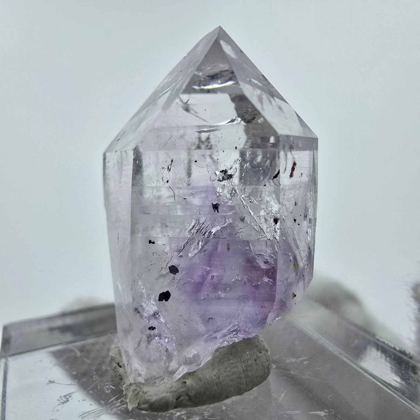 Entdecken Sie diese einzigartige und seltene klare Harlekin Amethyst Kristallspitze mit einer auffälligen lila-weißen transparenten Kristallspitze. Die inneren Phantome und die sehr seltenen rot- und schwarz glänzenden Hämatit-Einschlüsse machen dieses Stück zu etwas ganz Besonderem. Zwei Enhydro Einschlüsse mit jeweils einer beweglichen Luftblase verleihen dem Kristall zusätzlichen Reiz und die faszinierende Haltung, dass sich das Morphing mit der Bewegung fortsetzt.