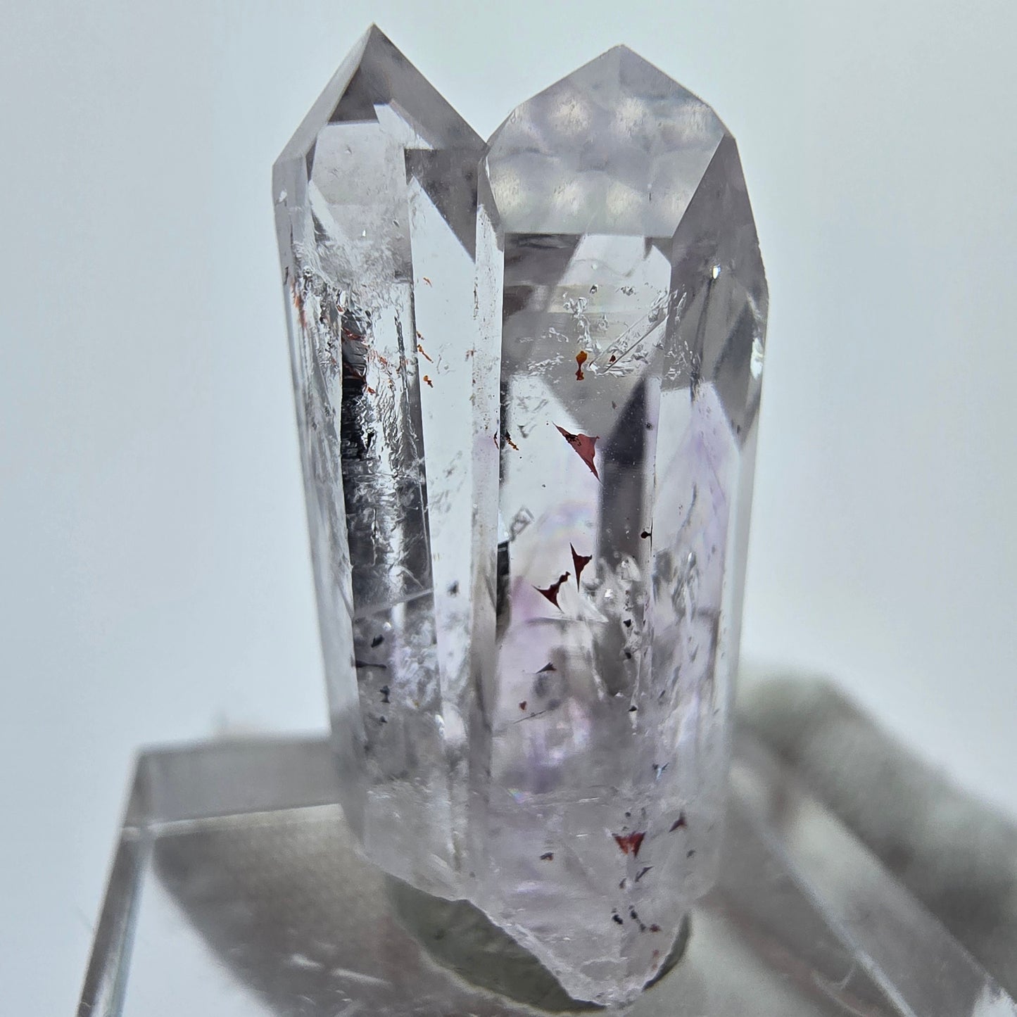 Entdecken Sie die faszinierende Schönheit des Harlekin Enhydro Phantom Amethyst! Dieser seltene, klare Harlekin Amethyst zeigt eine beeindruckende lila-weiße transparente Kristallspitze, die durch wunderschöne Phantome im Inneren ergänzt wird. Die Kristallspitze beherbergt zudem die äußerst seltenen rot und schwarz glänzenden Hämatit-Einschlüsse (Harlekin Quarz), die ihm einen einzigartigen Charakter verleihen. Ein besonderes Highlight ist der Enhydro-Einschluss, wo Sie eine bewegliche Luftblase entdecken können, die dem Kristall eine lebendige Note verleiht.