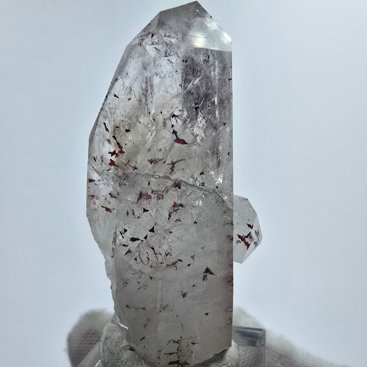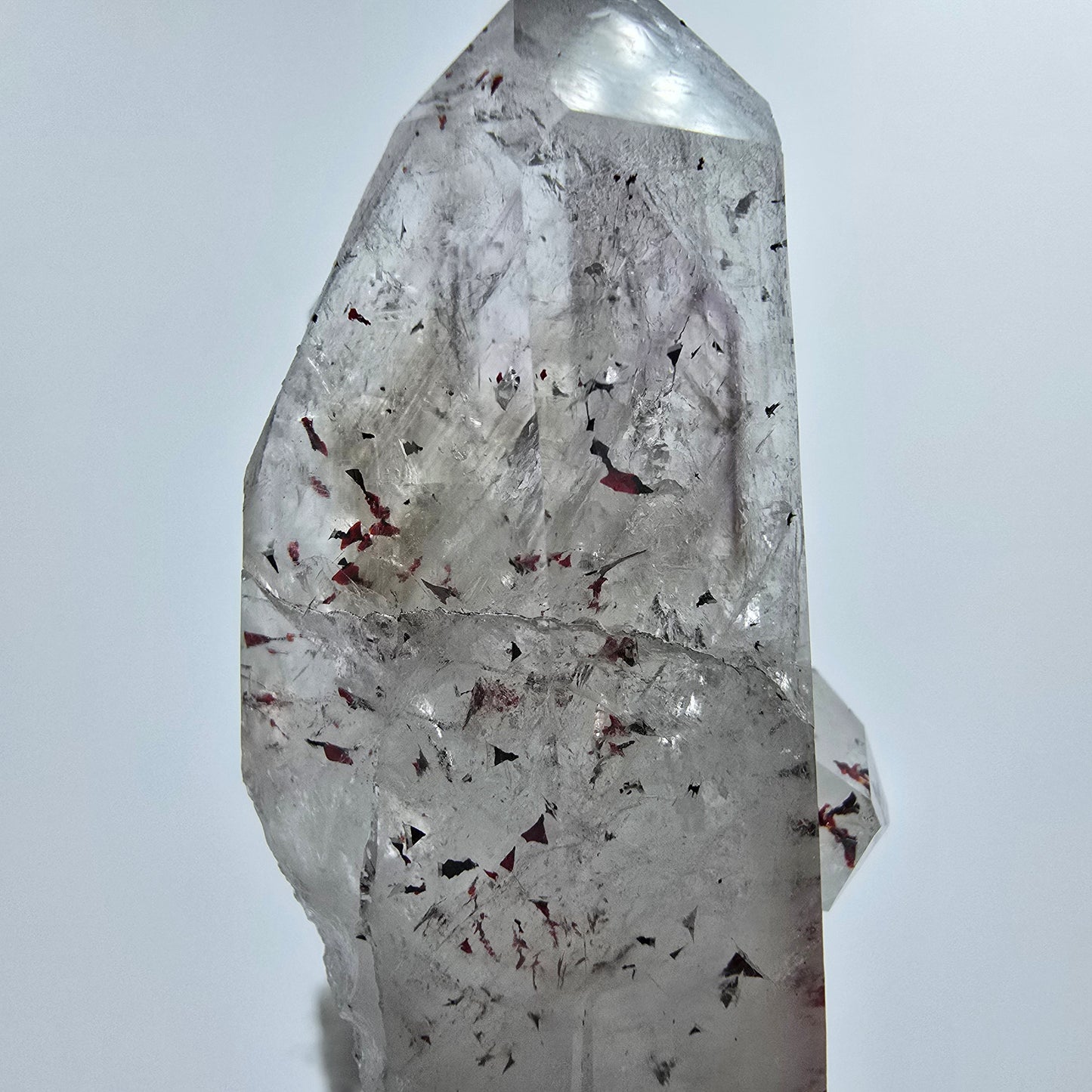 Besonders bemerkenswert sind die sehr seltenen rot und schwarz glänzenden Hämatit-Einschlüsse, die auch als Harlekin Quarz bekannt sind. Diese Schlüsse geben dem Kristall eine zusätzliche Tiefe und machen ihn zu einem absoluten Sammlerstück. Zudem finden Sie an einer Stelle einen Enhydro Einschluss mit einer beweglichen Luftblase, was die Faszination dieses Kristalls weiter verstärkt.