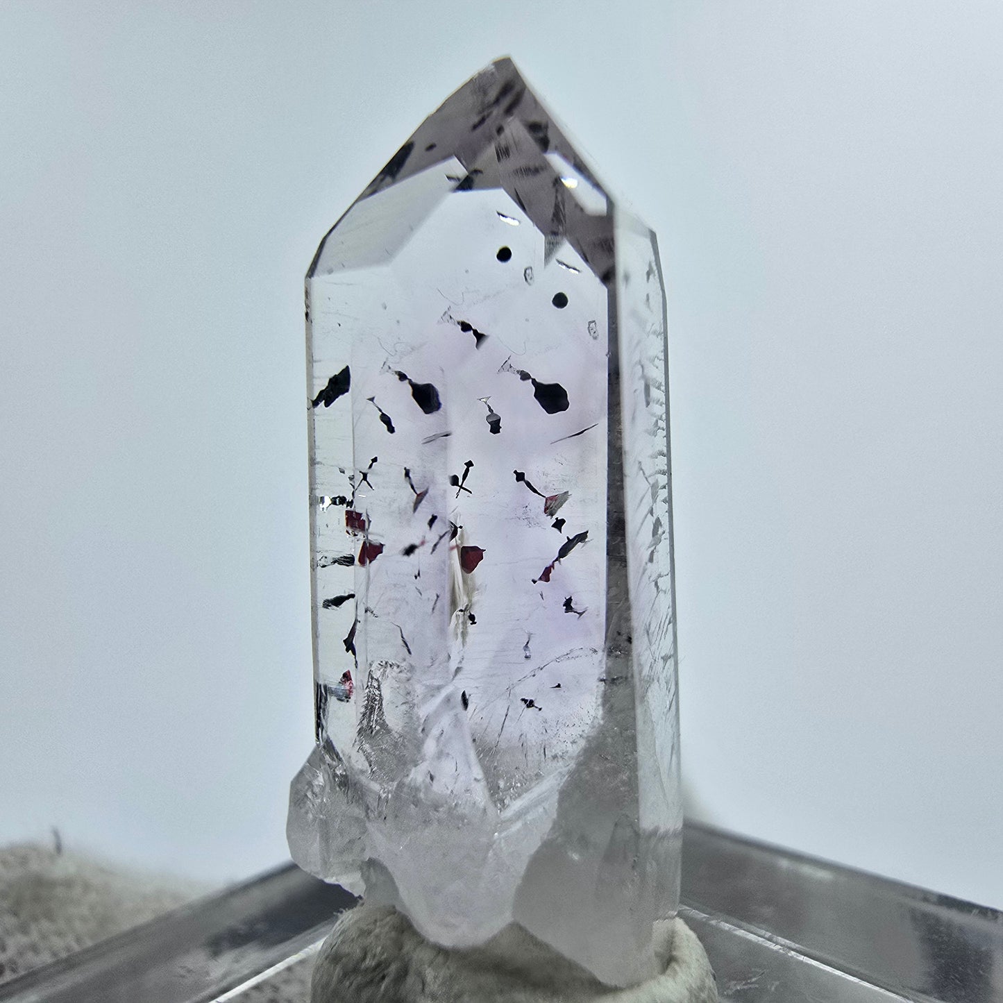 Entdecken Sie unseren seltenen und wunderschönen Harlekin Phantom Amethyst Kristall. Diese einzigartige klare Kristallspitze zeichnet sich durch eine lila-weiße transparente Färbung aus und ist mit faszinierenden Phantomen im Inneren versehen. Besonders bemerkenswert sind die äußerst seltenen rot und schwarz glänzenden Hämatit-Einschlüsse, die dem Kristall seinen Namen 'Harlekin Quarz' verleihen.