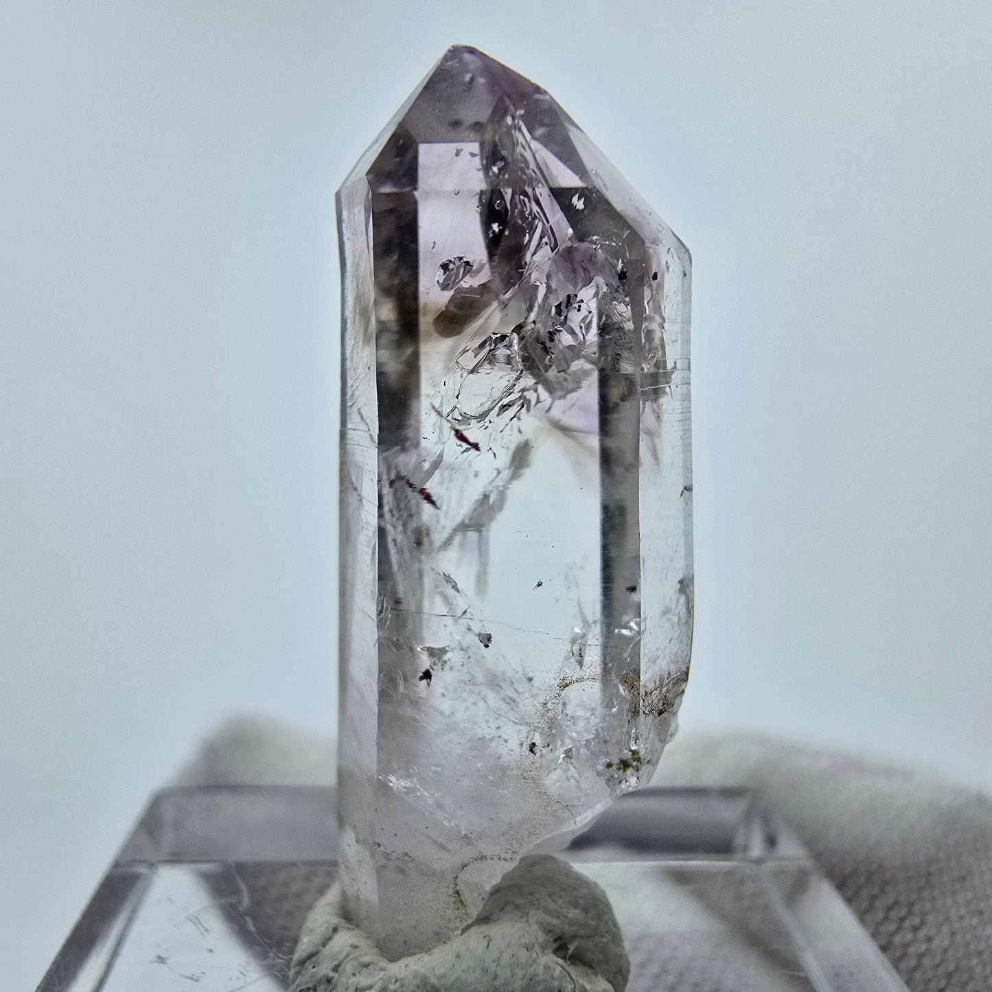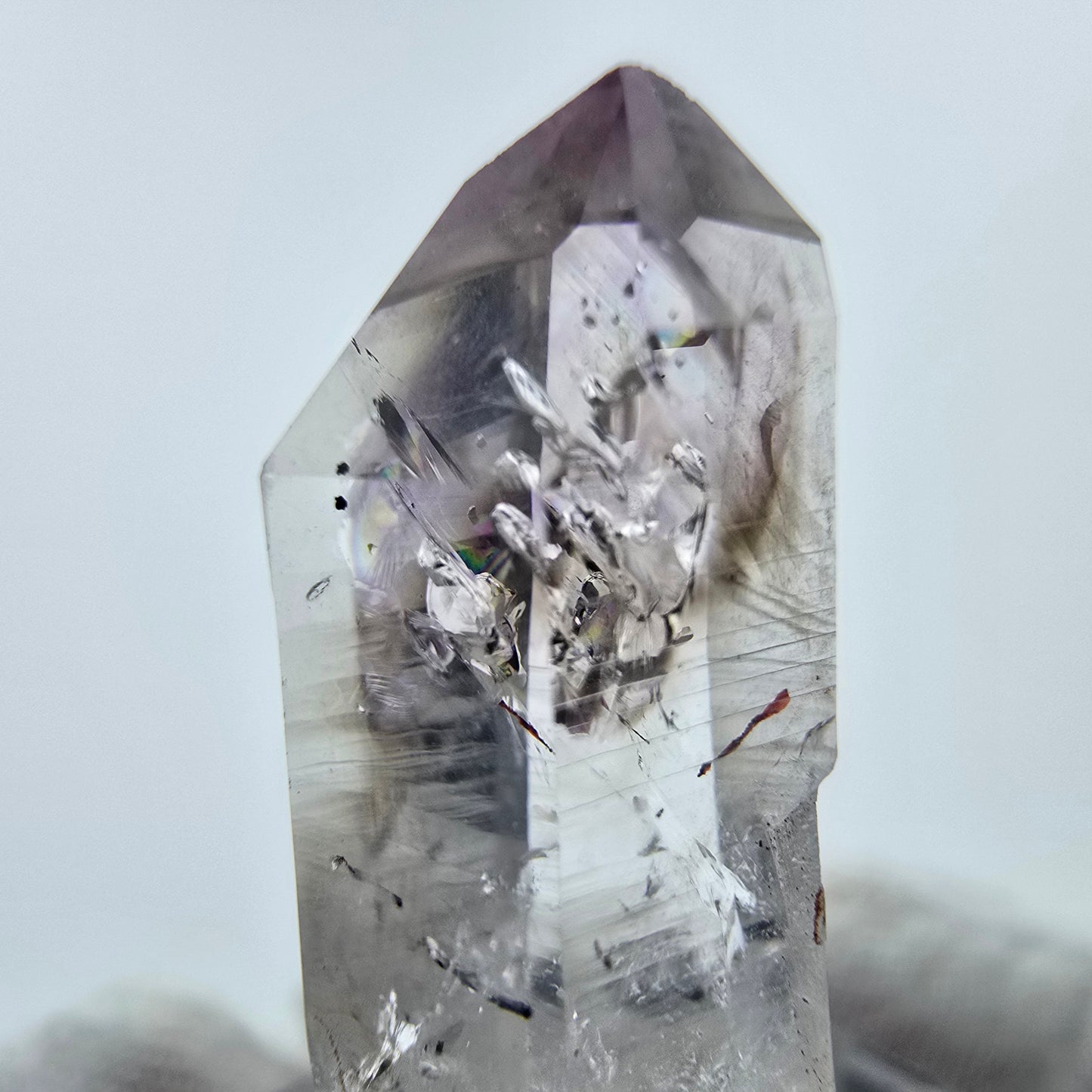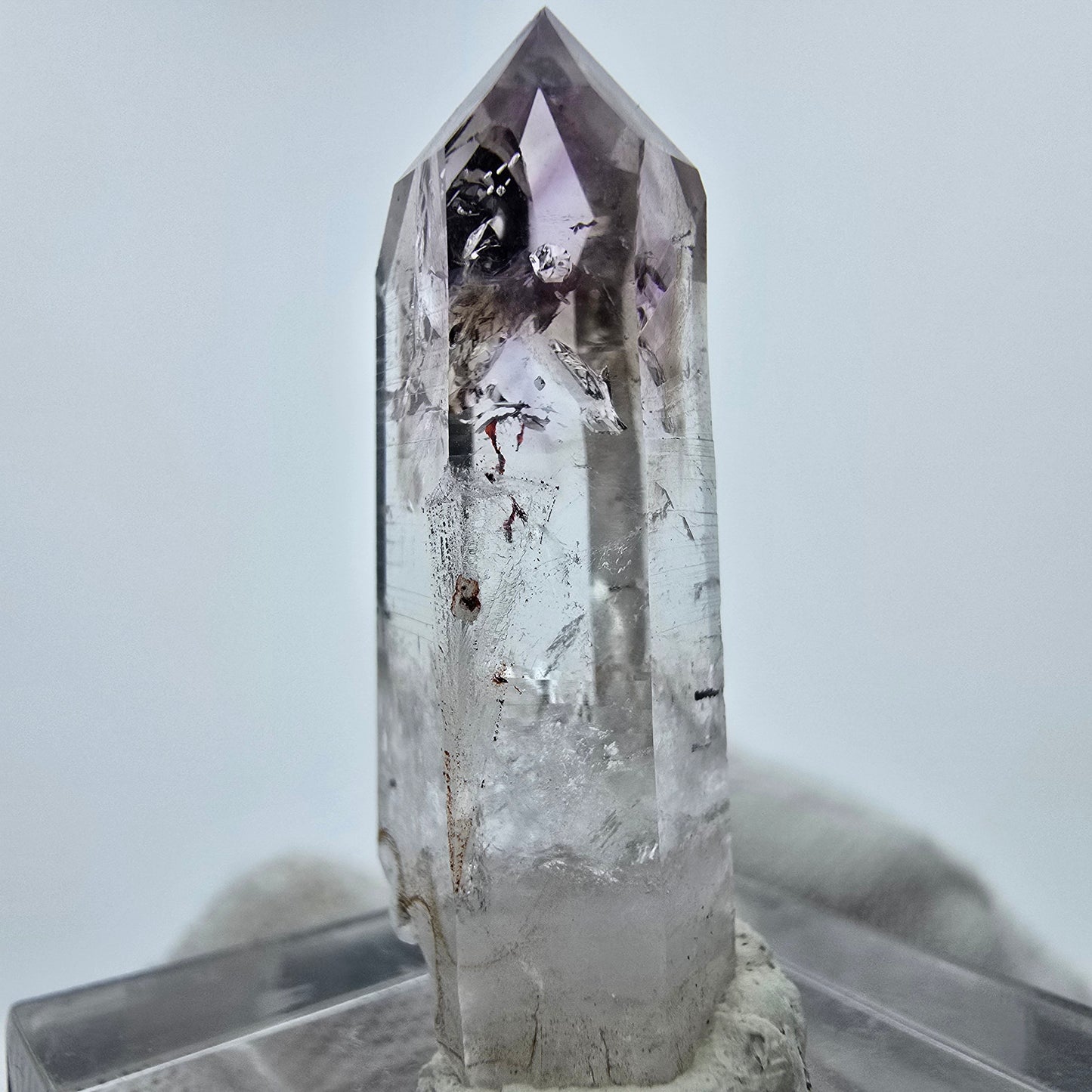 Entdecken Sie diesen seltenen klaren Harlekin Amethyst Kristall, der durch seine exquisite lila transparente Spitze besticht. Dieser bemerkenswerte Kristall zeichnet sich durch wunderschöne Phantome im Inneren aus, die ihm eine ganz besondere Note verleihen. Im Inneren des Kristalls sind die sehr seltenen rot und schwarz glänzenden Hämatit-Einschlüsse sichtbar, die auch als Harlekin Quarz bekannt sind.