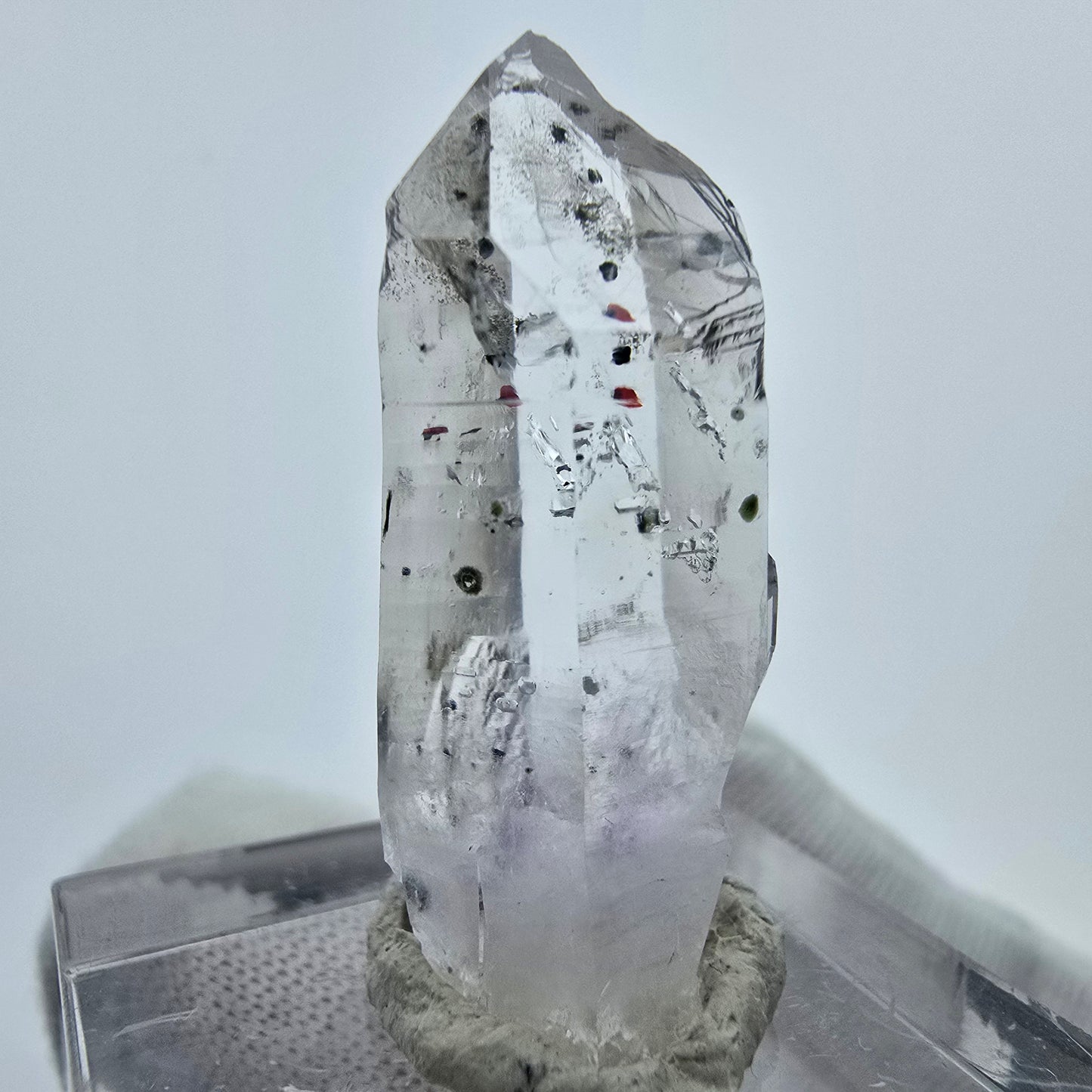 Entdecken Sie die Schönheit des seltenen Harlekin Phantom Amethyst Kristalls – eine klar definierte Kristallspitze, die durch ihre unglaubliche Transparenz und die atemberaubenden Phantome im Inneren besticht. Die faszinierenden rot und schwarz glänzenden Hämatit-Einschlüsse, auch bekannt als Harlekin Quarz, verleihen diesem Stück eine einzigartige und außergewöhnliche Optik, die Sammler und Liebhaber gleichermaßen begeistern wird.