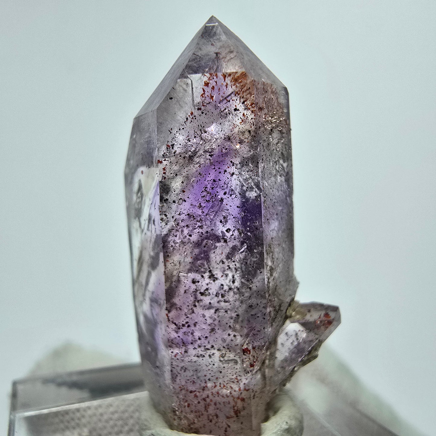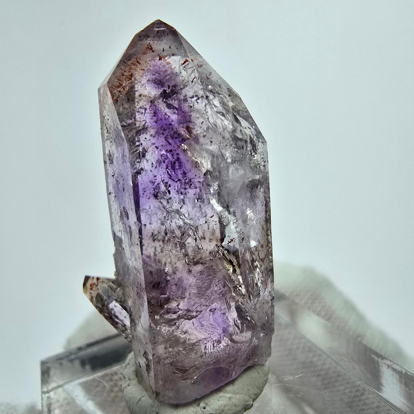 Entdecken Sie den einzigartigen Harlekin Phantom Amethyst Kristall, eine seltene klare Kristallspitze, die mit ihrer lila-weißen transparenten Farbe besticht. Diese exquisite Spitze zeigt wunderschöne Phantome im Inneren.