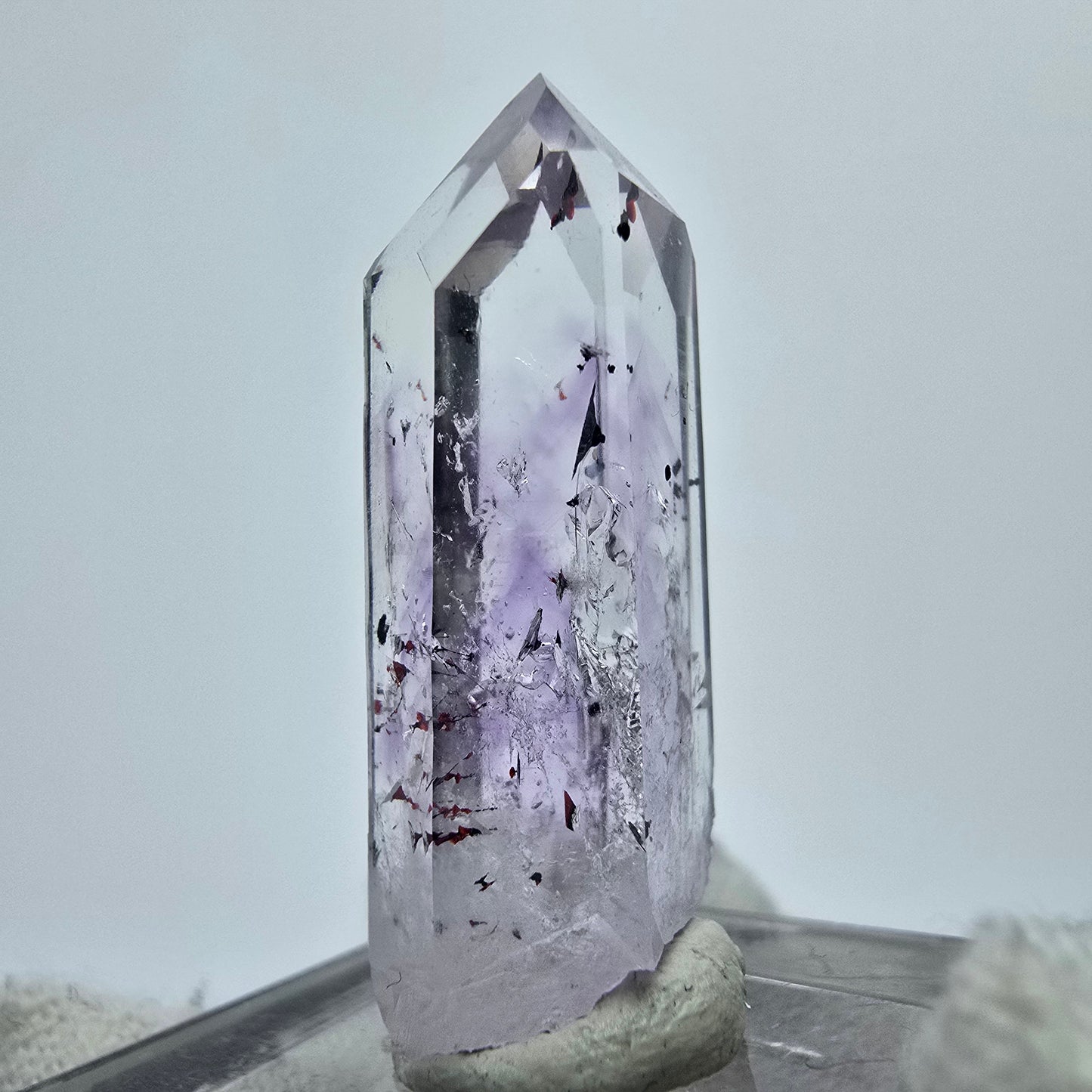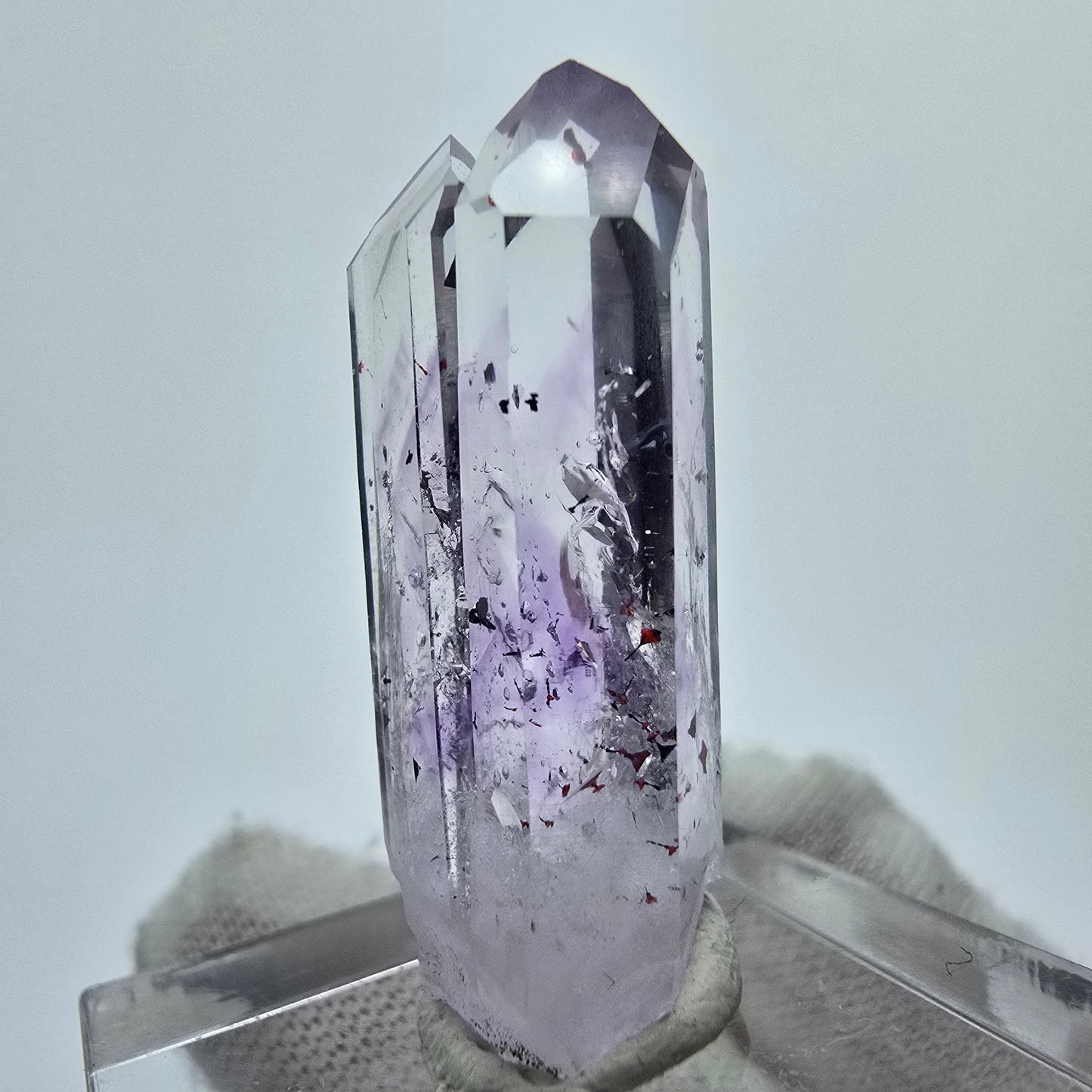 Entdecken Sie diesen seltenen klaren Harlekin Amethyst Kristall, der durch seine edle lila und transparente Kristallspitze besticht. Der Kristall zeigt wunderschöne Phantome im Inneren, darunter auch sehr seltene rot und schwarz glänzende Hämatit-Einschlüsse, die typisch für den Harlekin Quarz sind. Diese einzigartige Kombination macht den Kristall zu einem Highlight jeder Sammlung.