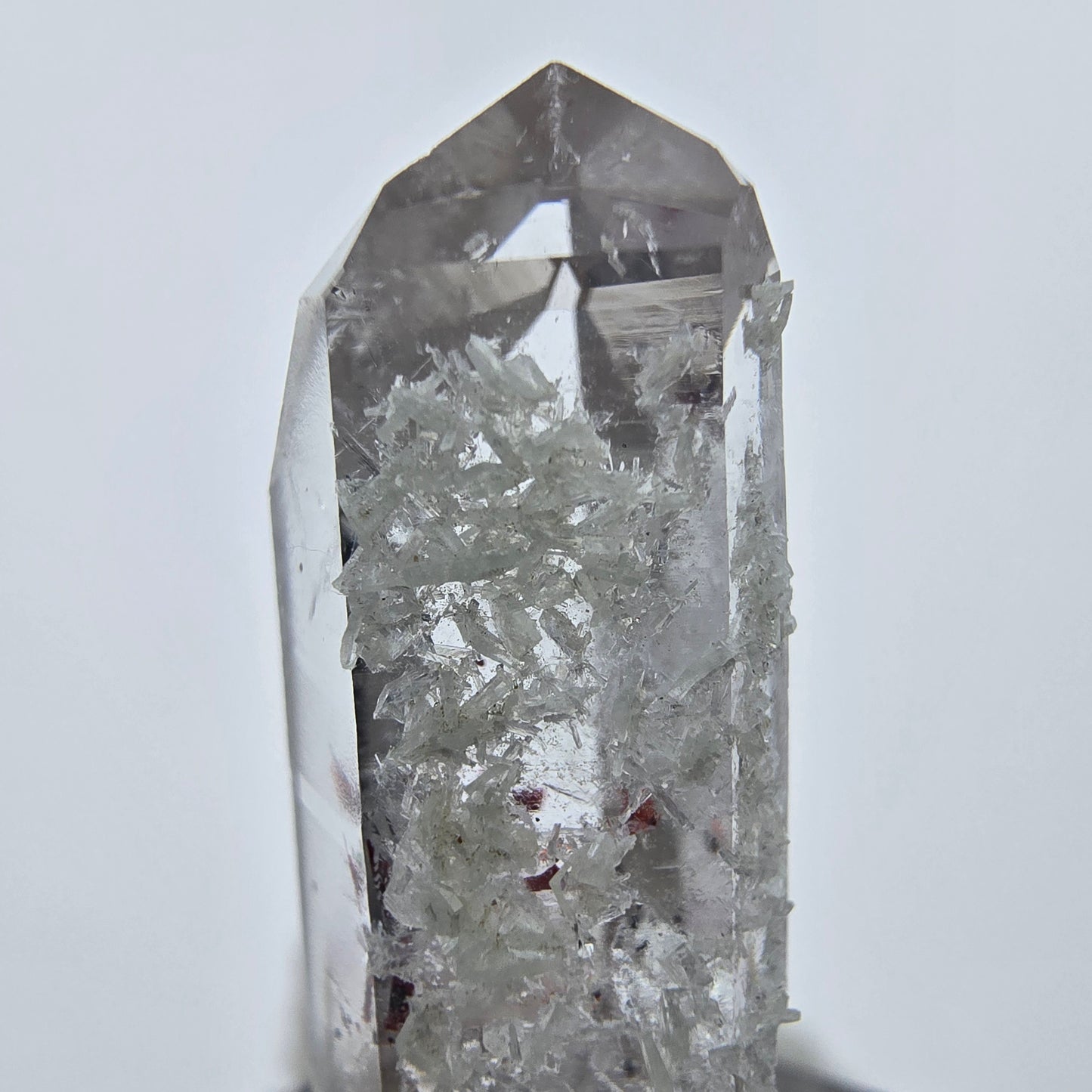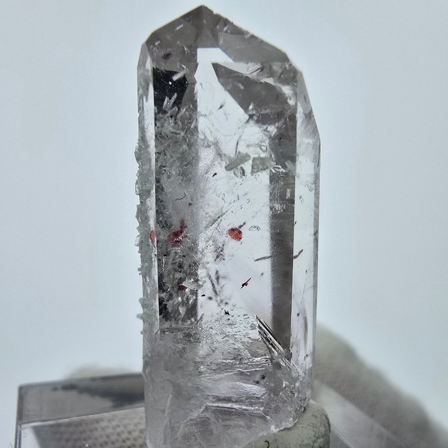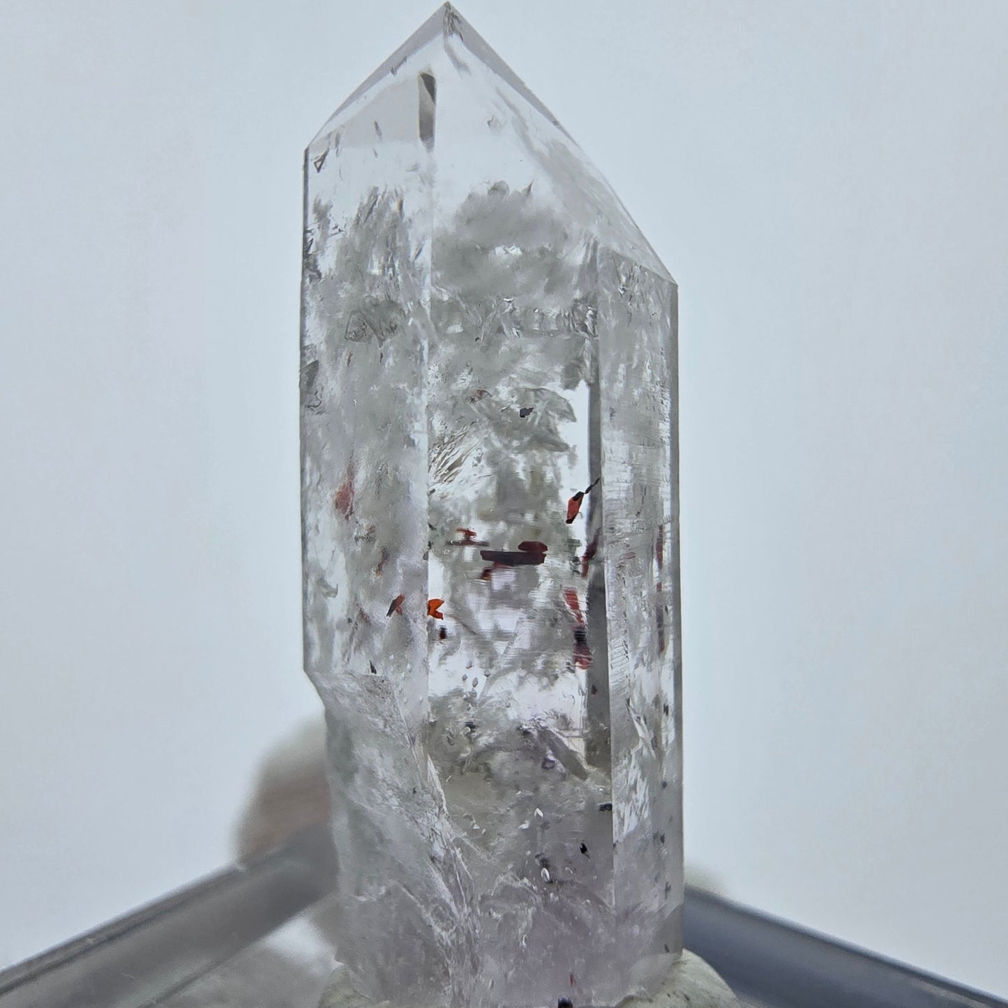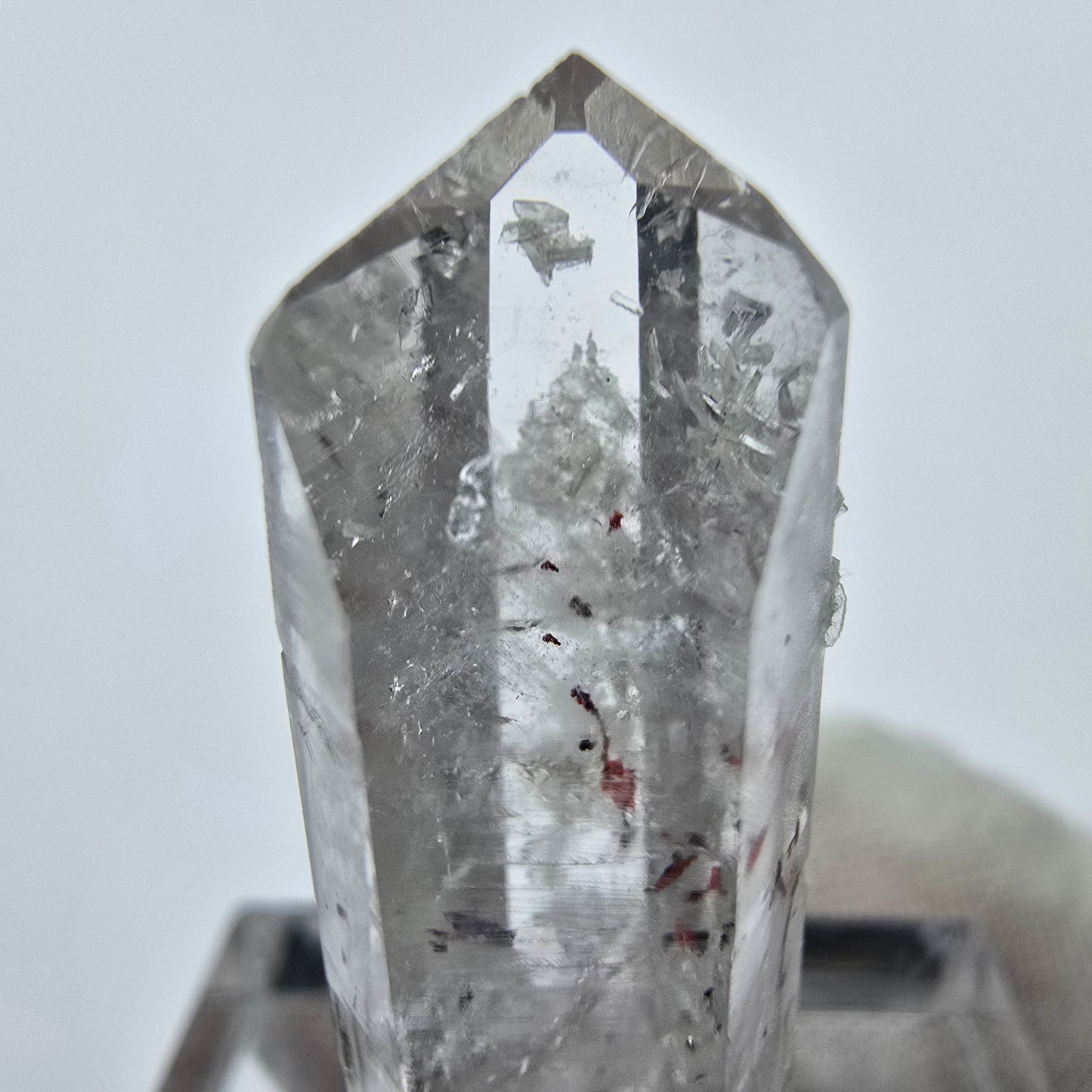 Entdecken Sie diese seltene klare Harlekin Amethyst Kristallspitze, die mit ihrer lila, weiß und transparenten Kristallspitze besticht. Im Inneren dieser einzigartigen Spitze sind wunderschöne Phantome zu sehen, die dem Kristall eine mystische Ausstrahlung verleihen. Besonders bemerkenswert sind die sehr seltenen rot und schwarz glänzenden Hämatit-Einschlüsse, die dem Harlekin Quarz seinen Namen geben.
