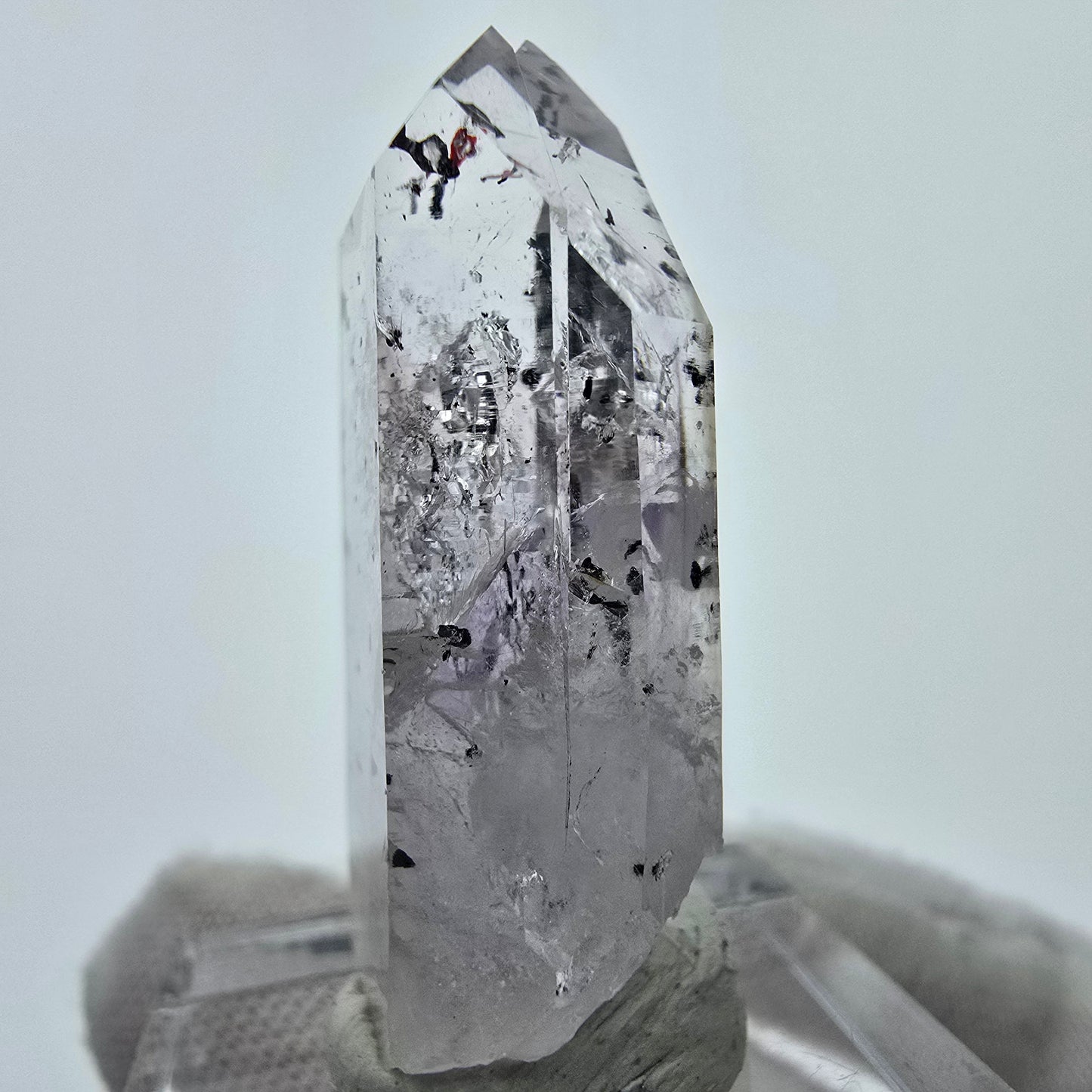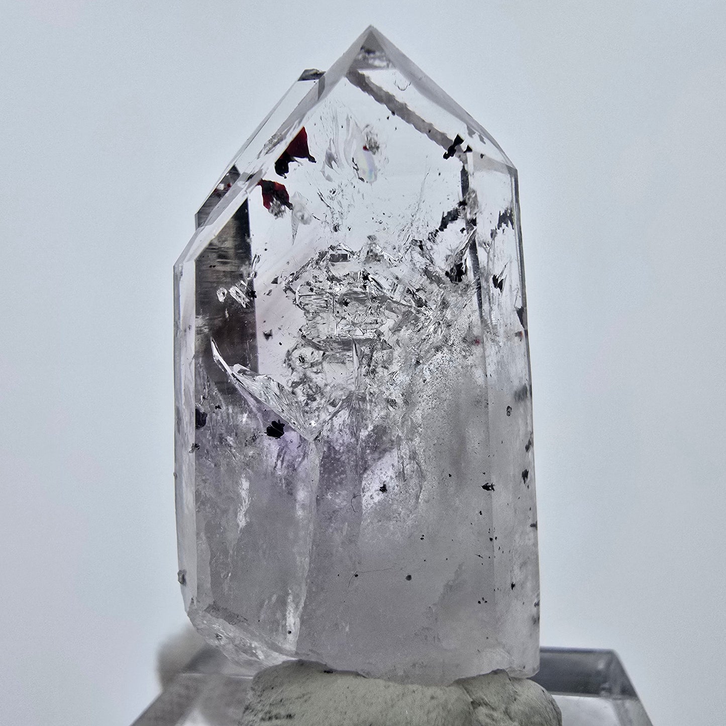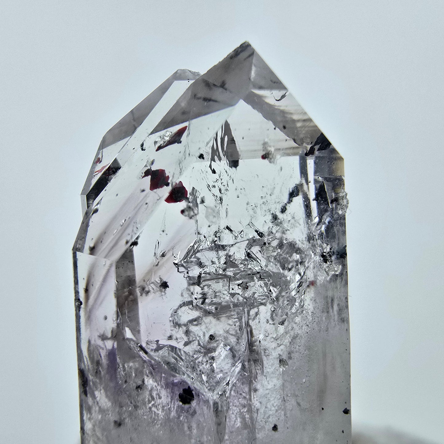 Entdecken Sie die faszinierende Schönheit des Harlekin Phantom Amethyst mit Analcim. Diese seltene, klare Harlekin Amethyst Kristallspitze besticht durch ihre lila-weiß-transparente Farbe und die beeindruckenden Phantome, die sich im Inneren verbergen. Die Kristallspitze zeigt zudem außergewöhnliche, glänzende Hämatit-Einschlüsse in Rot und Schwarz, die den Harlekin Quarz einzigartig machen.