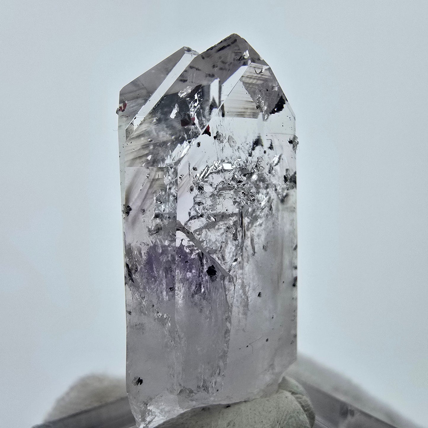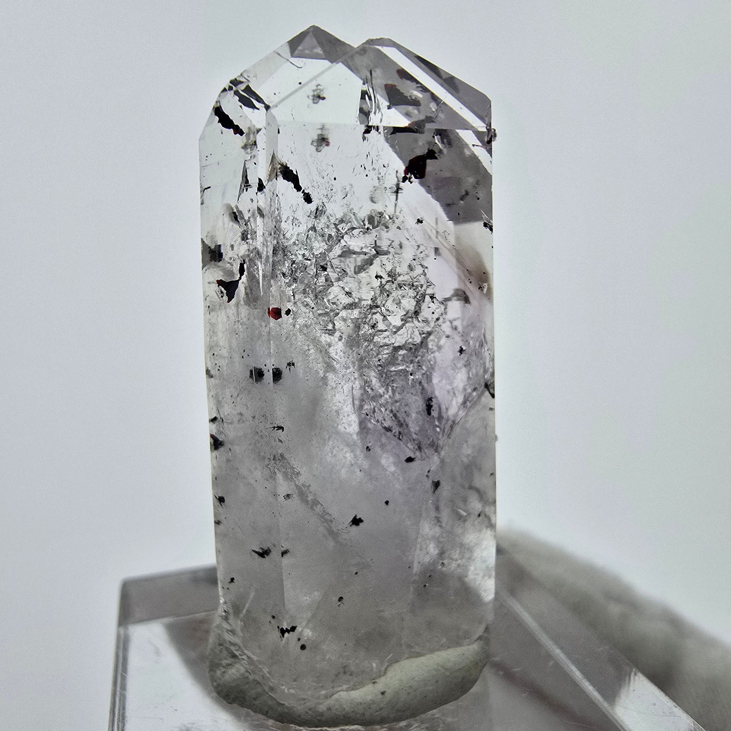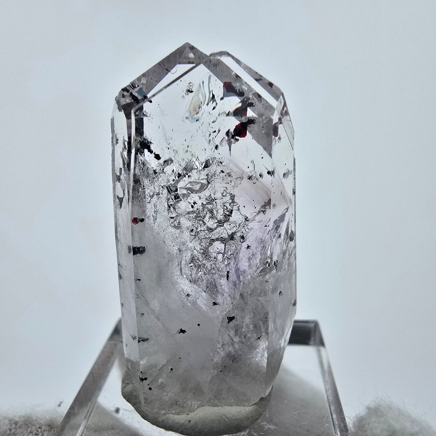 Entdecken Sie die faszinierende Schönheit des Harlekin Phantom Amethyst mit Analcim. Diese seltene, klare Harlekin Amethyst Kristallspitze besticht durch ihre lila-weiß-transparente Farbe und die beeindruckenden Phantome, die sich im Inneren verbergen. Die Kristallspitze zeigt zudem außergewöhnliche, glänzende Hämatit-Einschlüsse in Rot und Schwarz, die den Harlekin Quarz einzigartig machen.