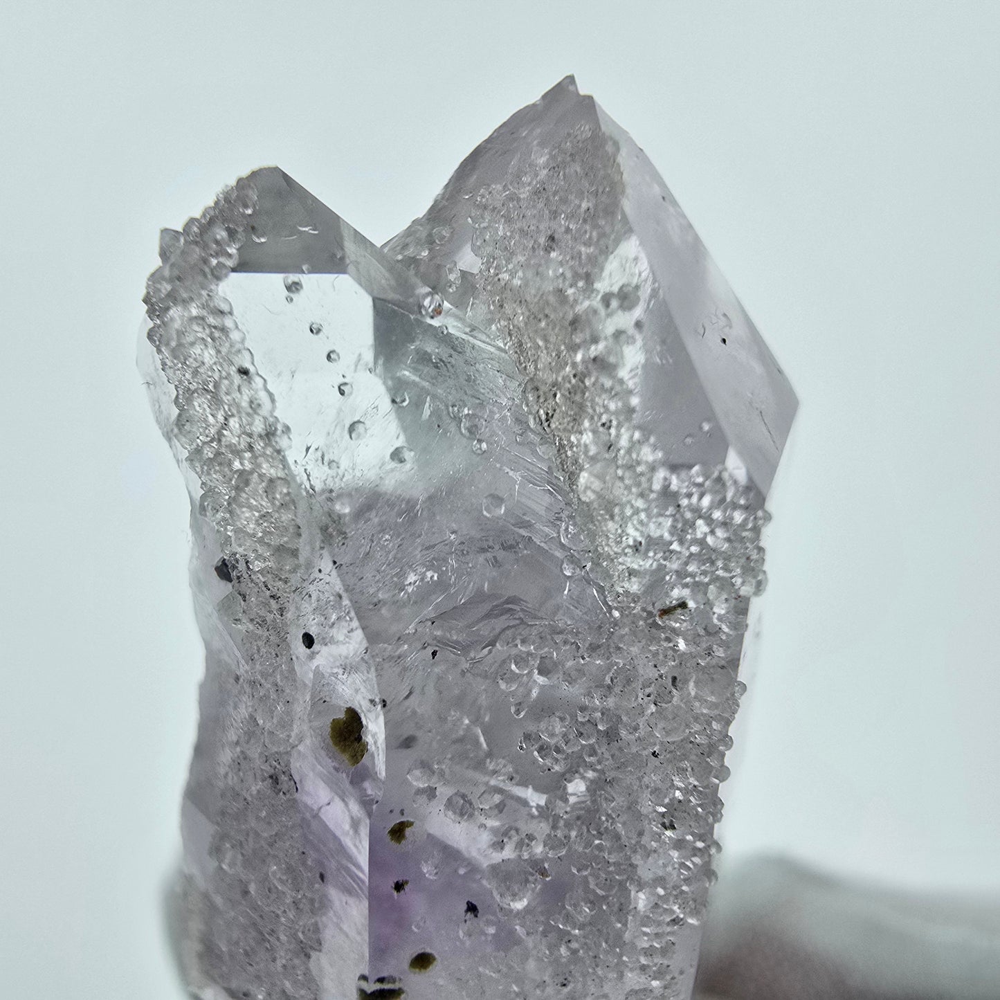 Entdecken Sie unsere seltene klare Harlekin Amethyst Kristallspitze, die mit ihrer lila, weiß-transparenten Farbgebung und wunderschönen Phantomen im Inneren beeindruckt. Dieser außergewöhnliche Kristall zeichnet sich durch die äußerst seltenen roten und schwarzen glänzenden Hämatit-Einschlüsse aus, die ihm eine einzigartige Struktur verleihen (Harlekin Quarz).